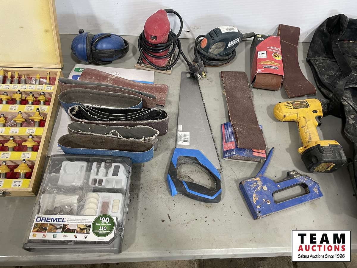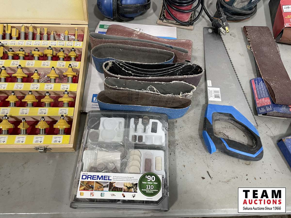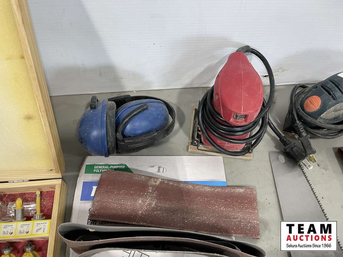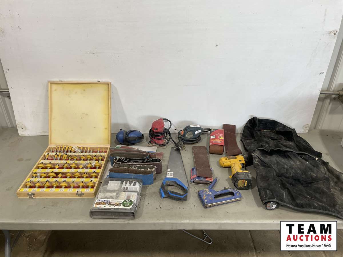 Router bit set, hand saws, palm sands, sanding belts, DeWalt drill, sand paper