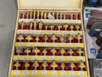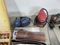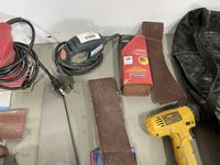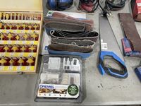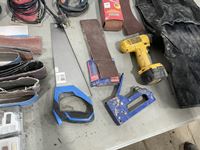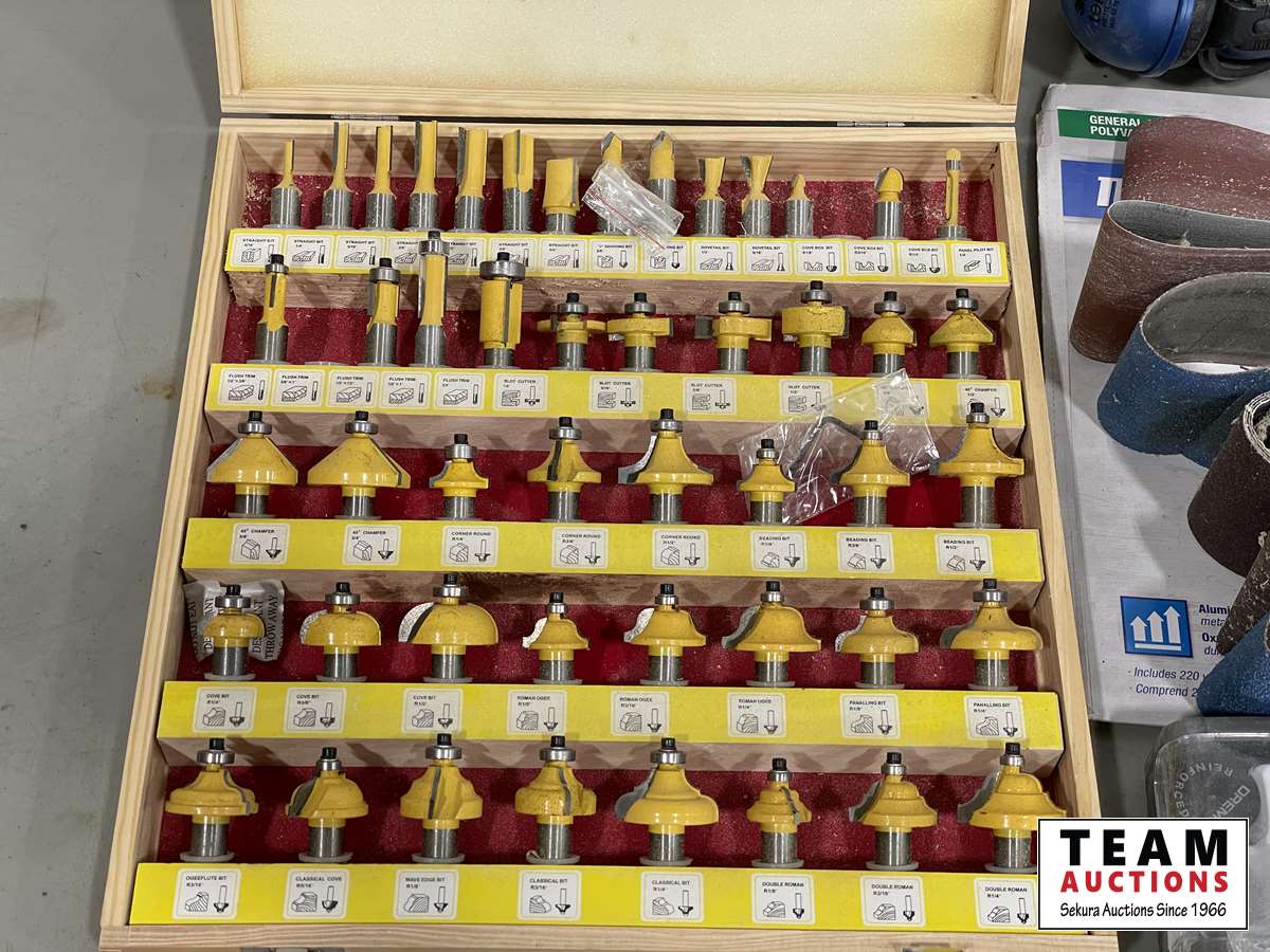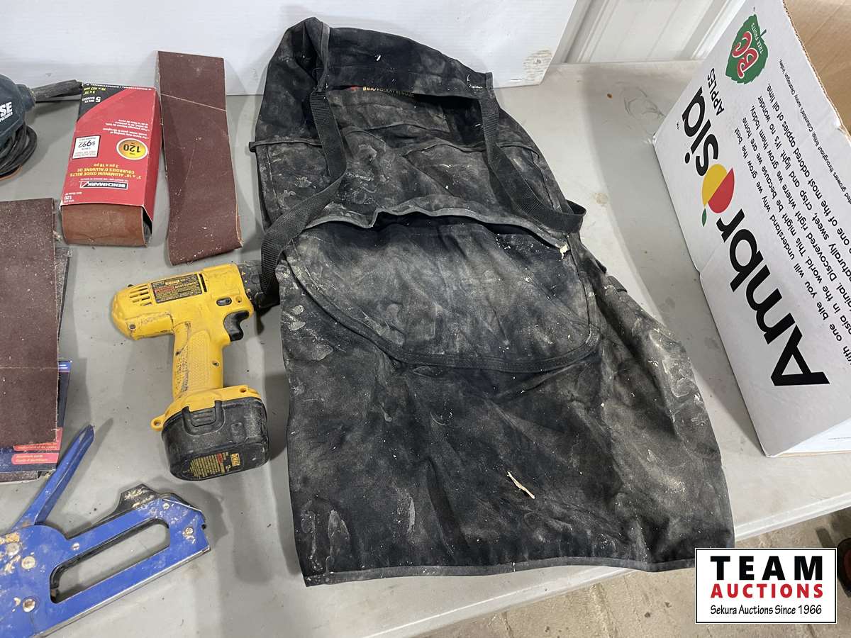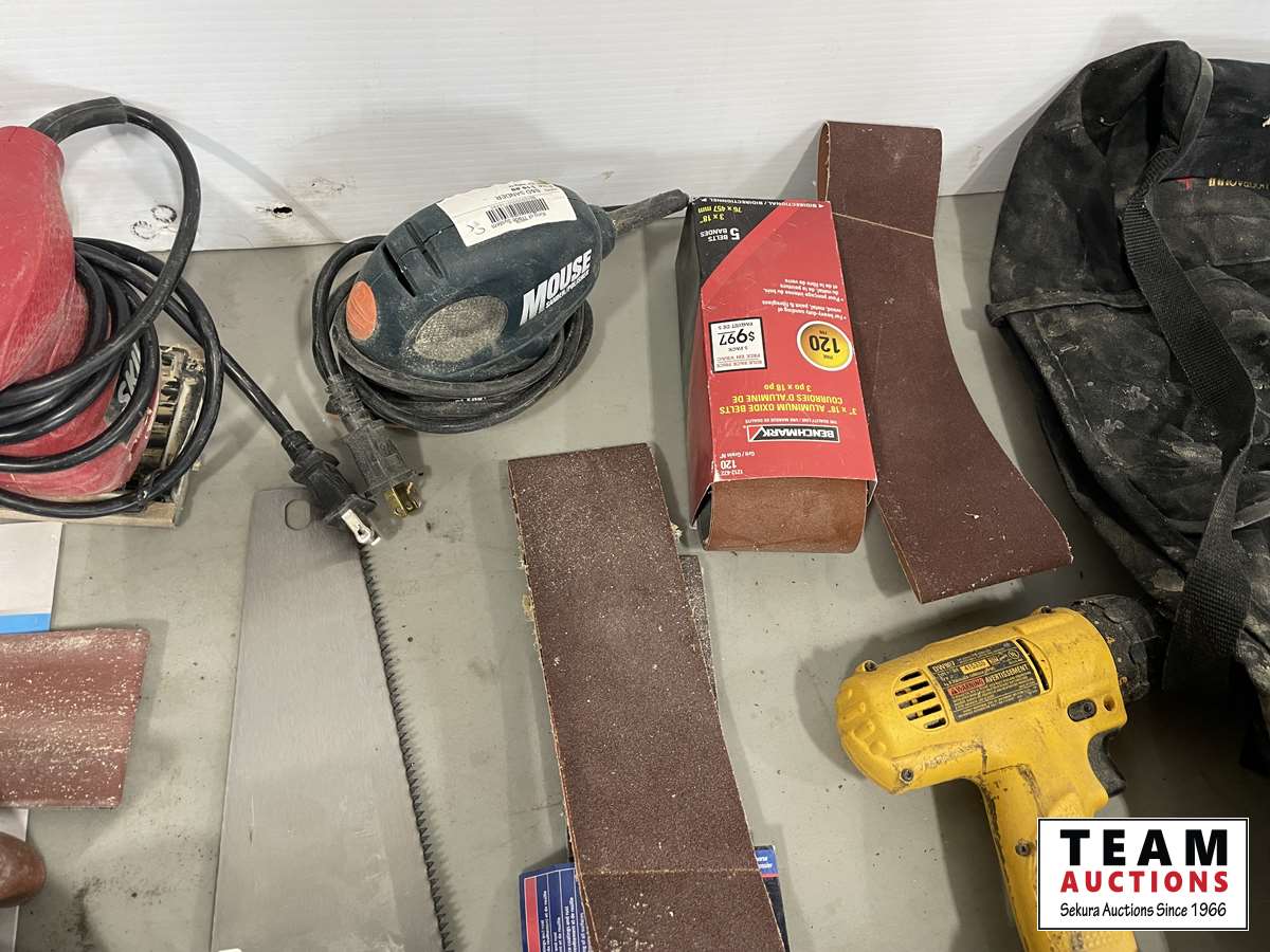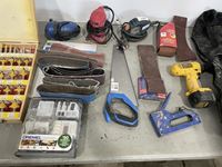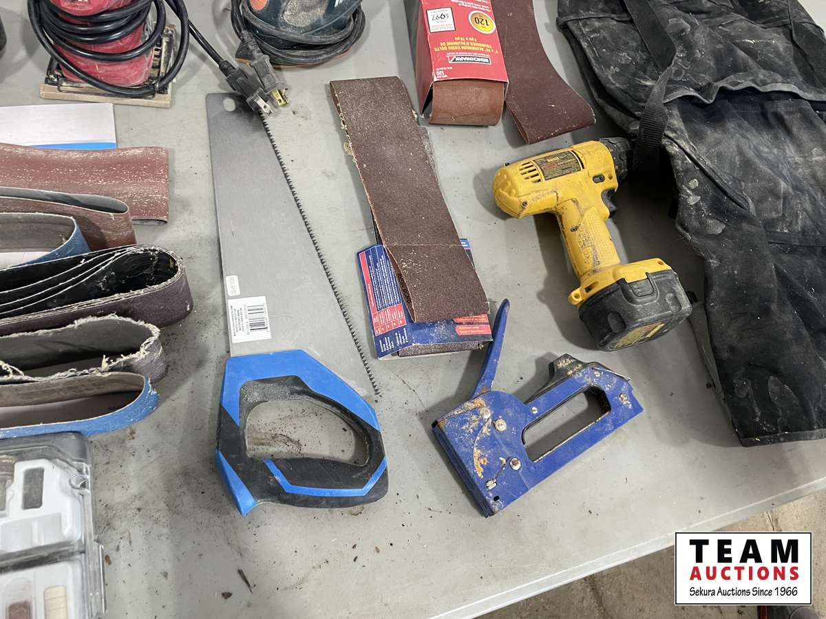 Router bit set, hand saws, palm sands, sanding belts, DeWalt drill, sand paper