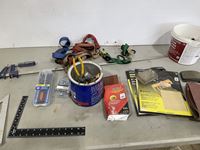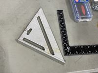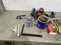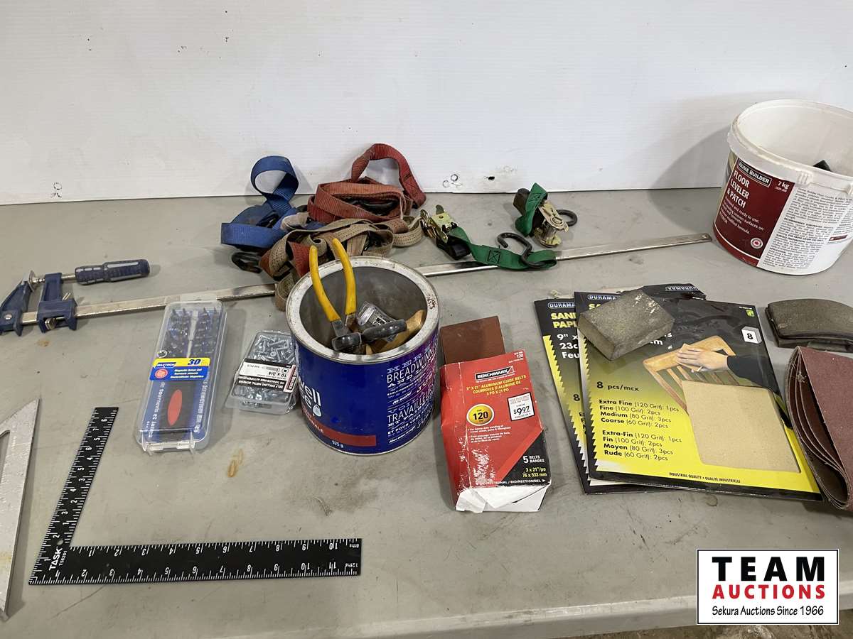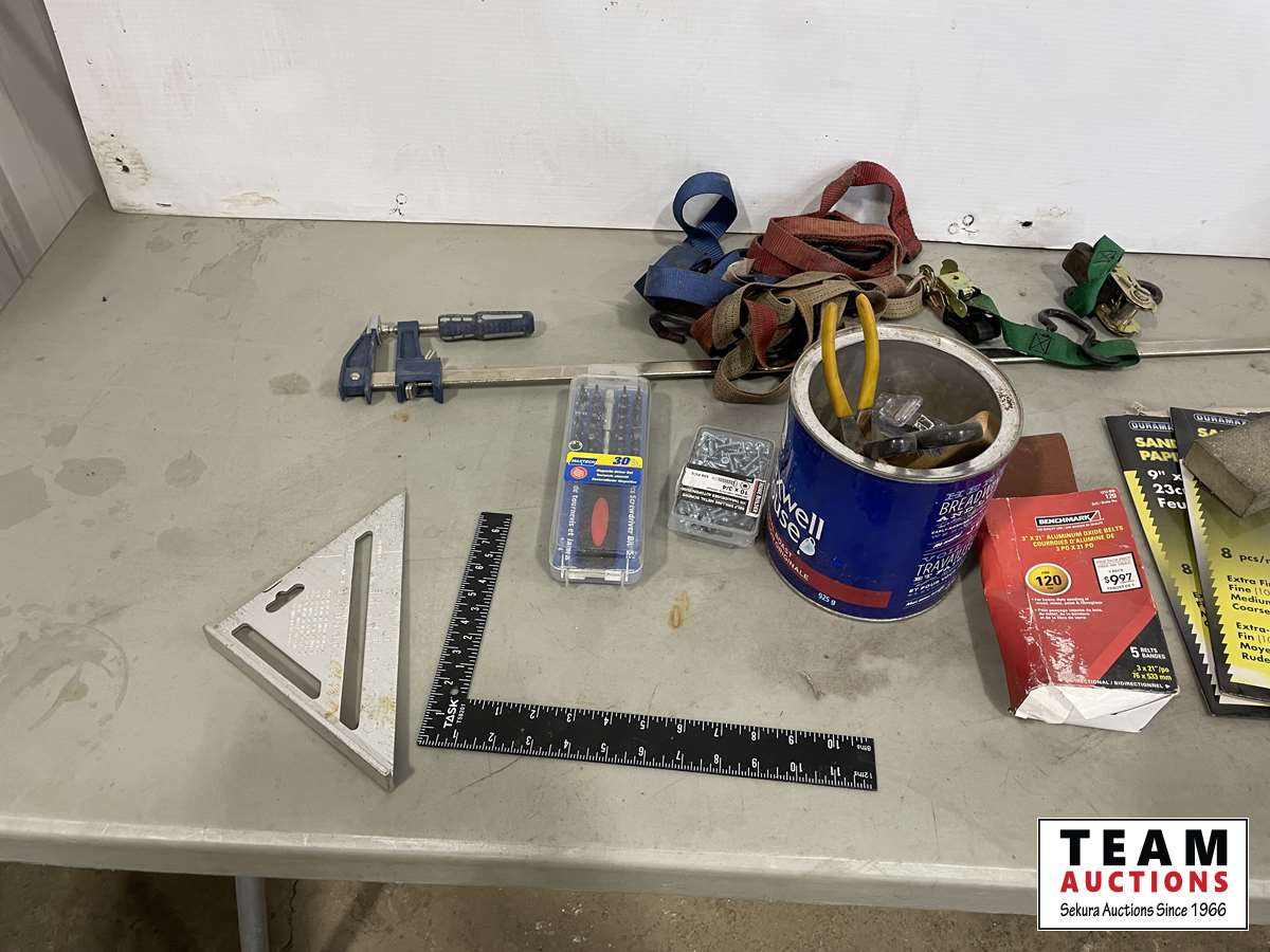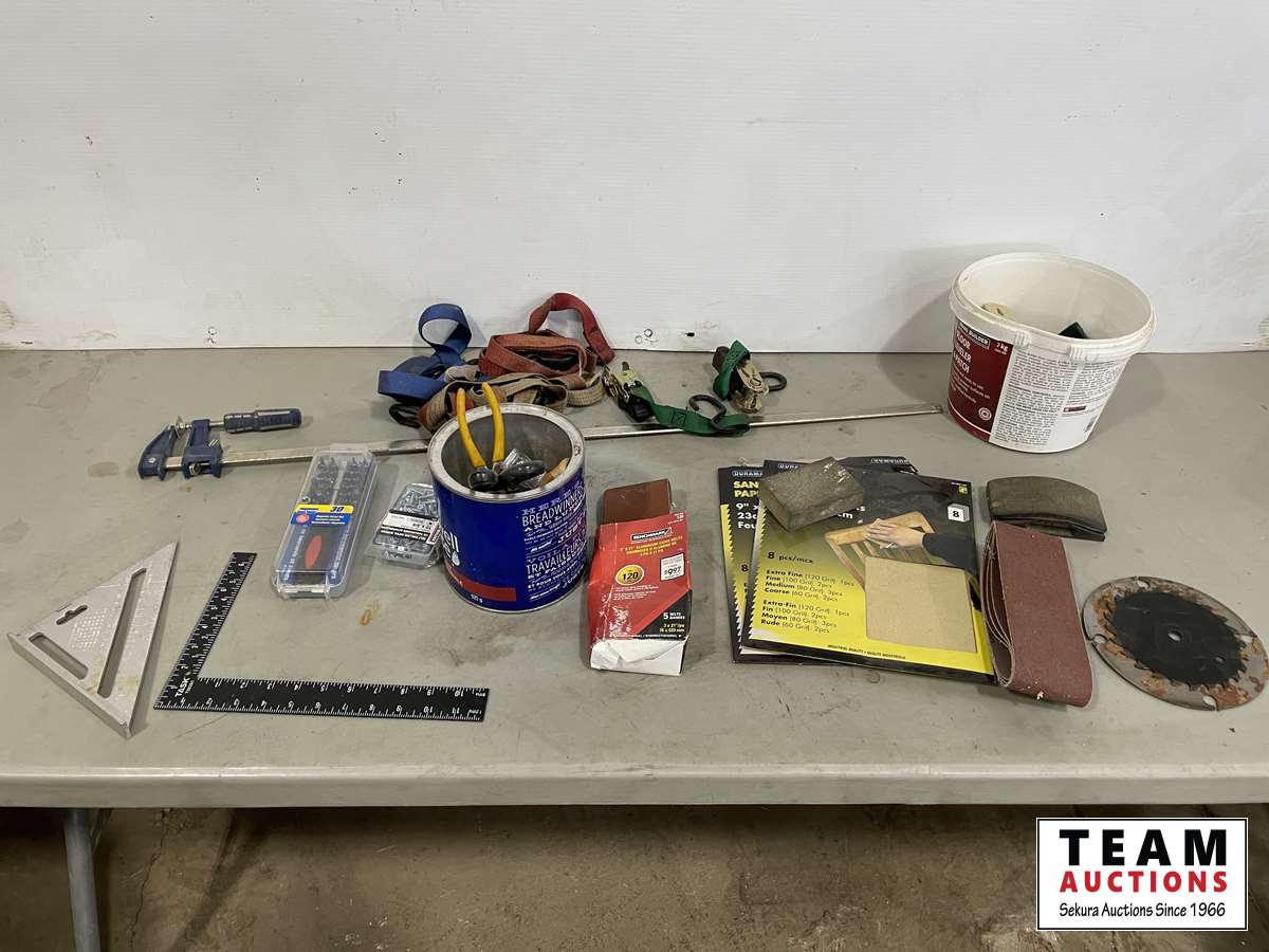 Speed square, 1 ft square, sand paper, sanding belts, straps, 36 inch C clamps, assorted drill bits