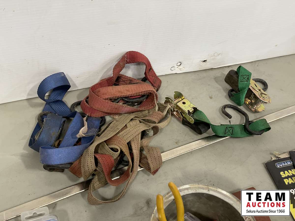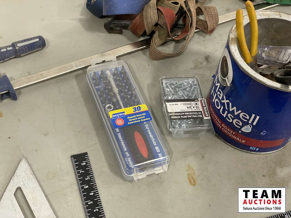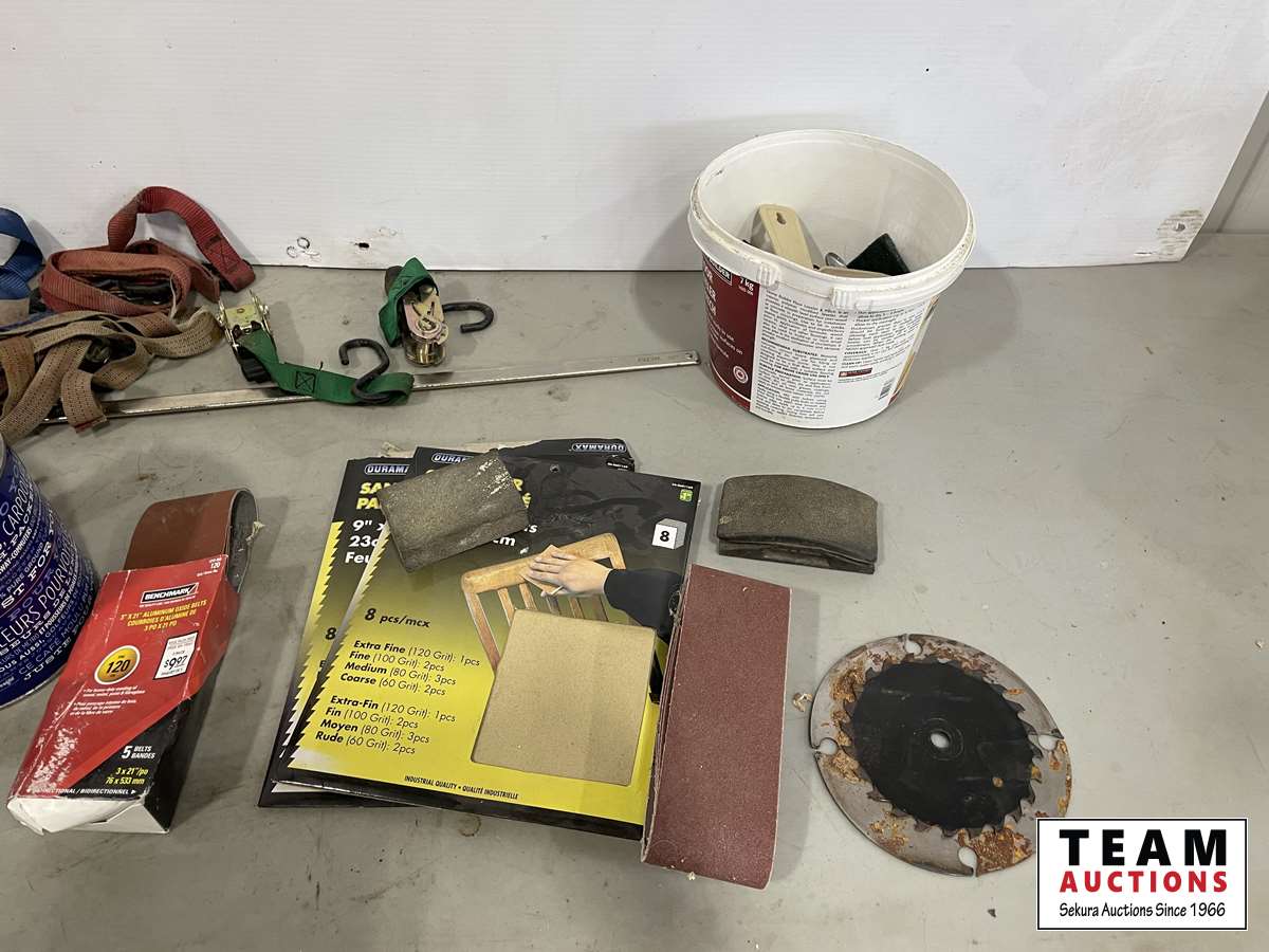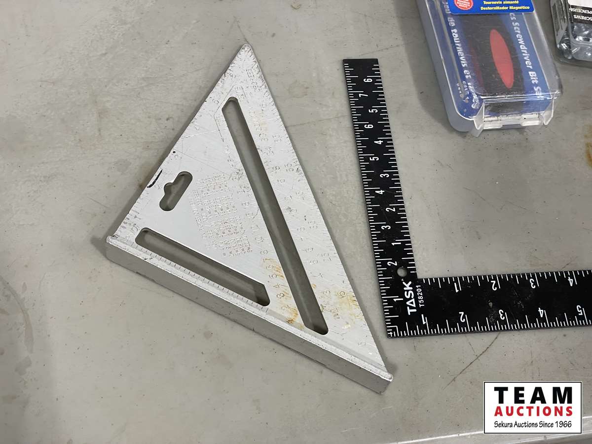 Speed square, 1 ft square, sand paper, sanding belts, straps, 36 inch C clamps, assorted drill bits