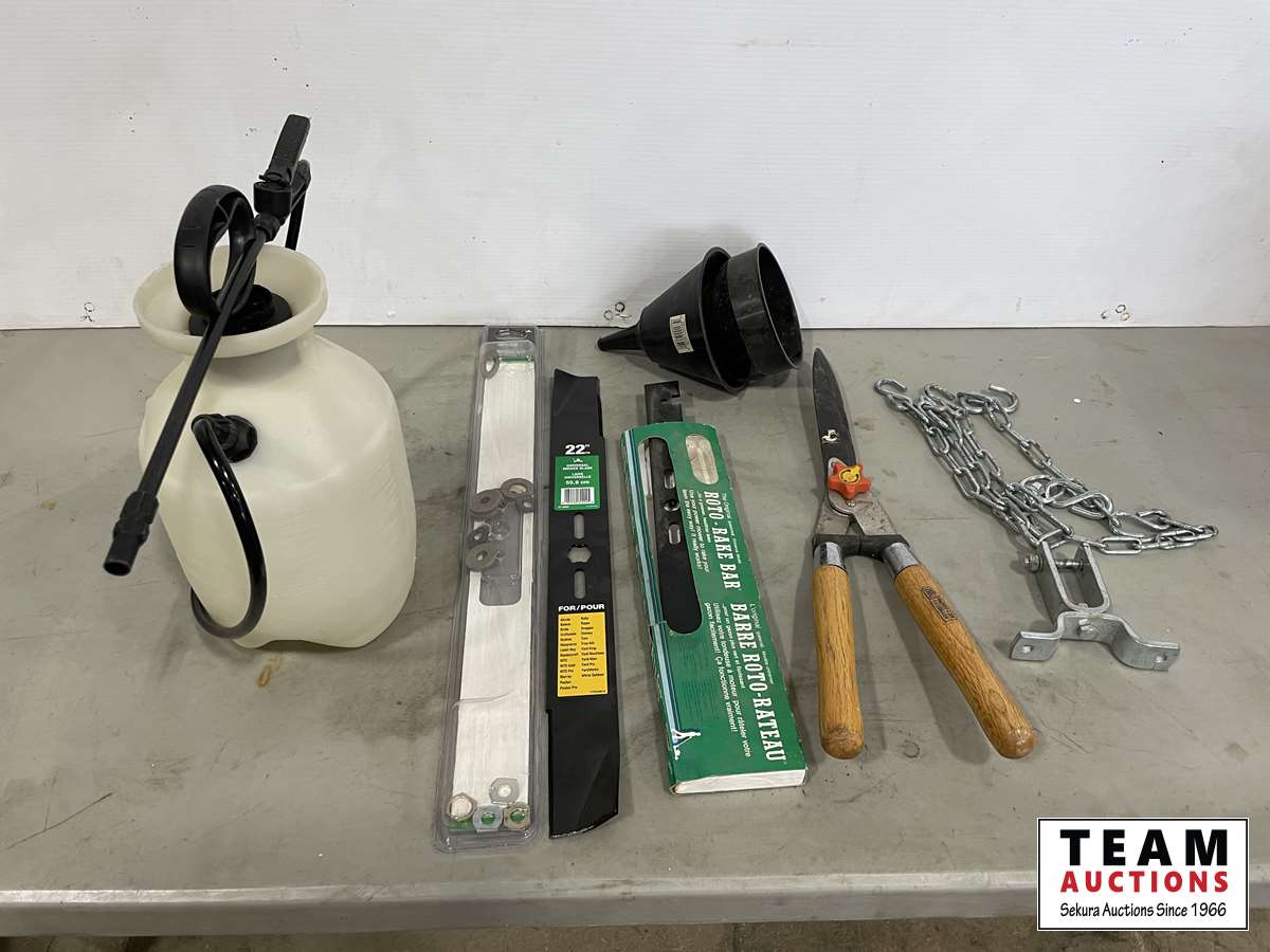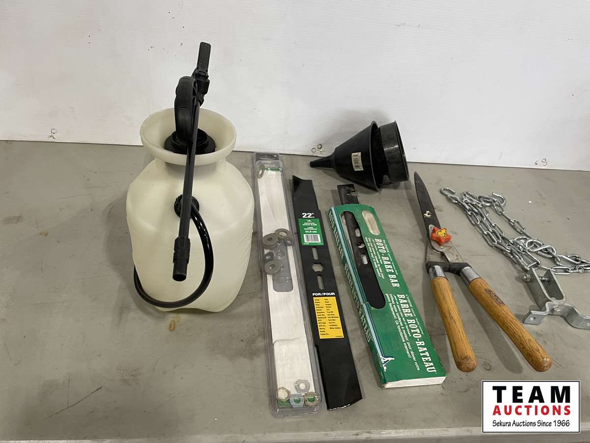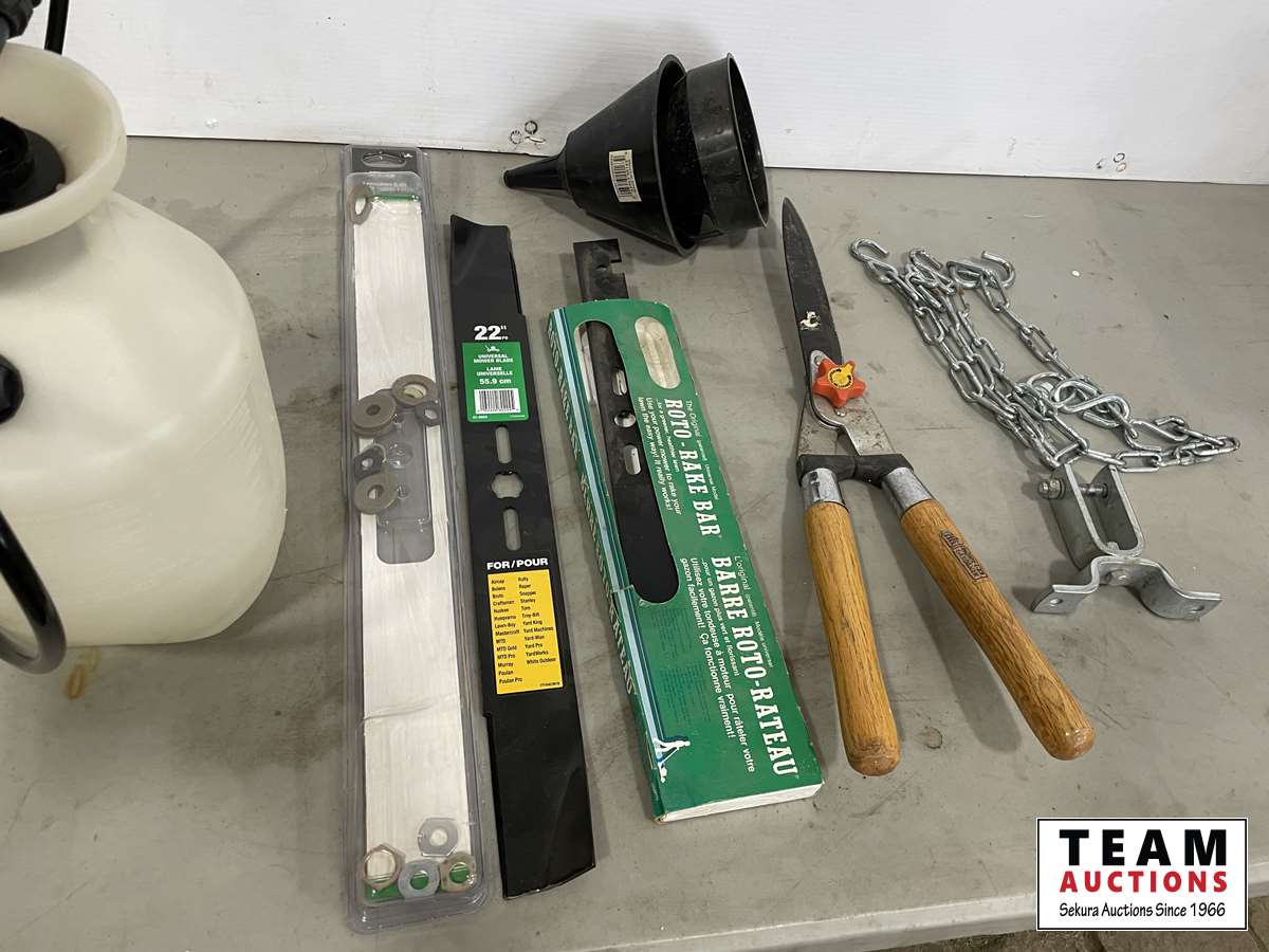 Hand pump sprayer, 22 inch universal mower blade, hedge clippers, funnels
