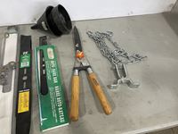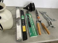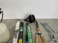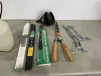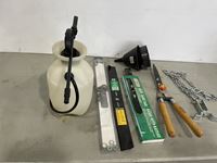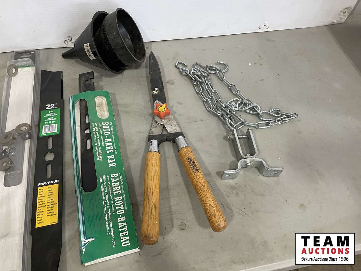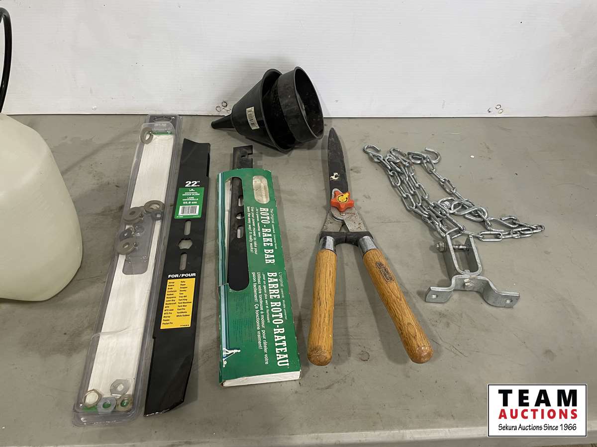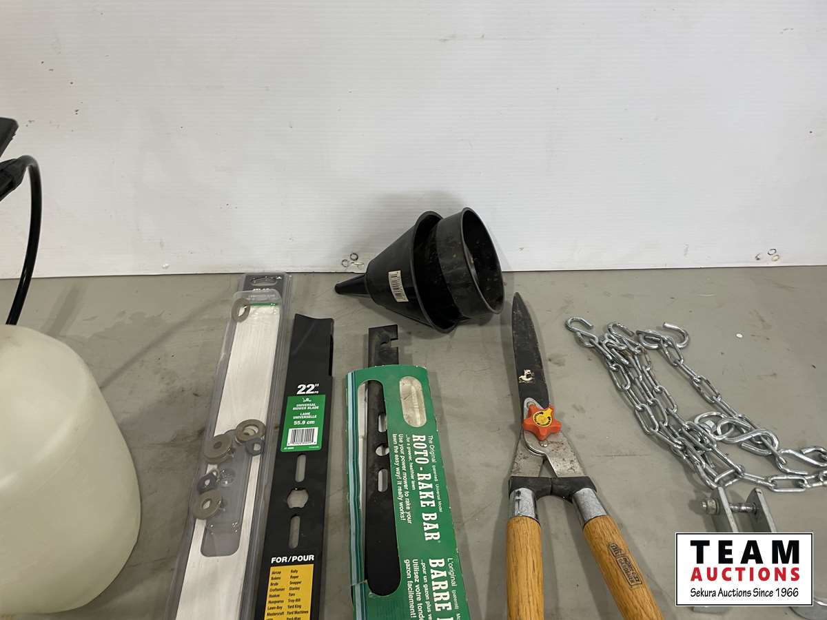 Hand pump sprayer, 22 inch universal mower blade, hedge clippers, funnels