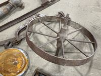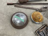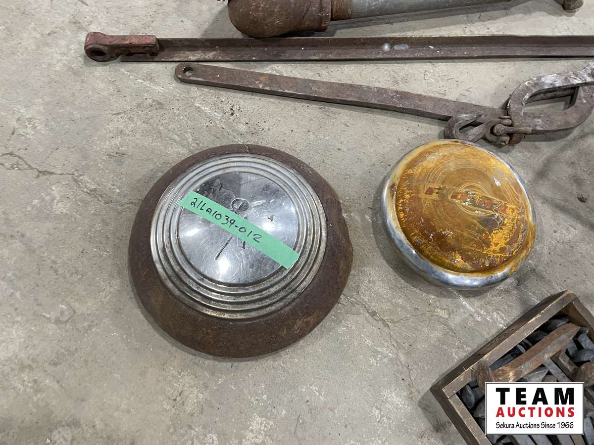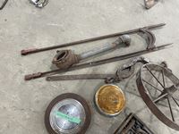 Steel wheel, box of railway spikes, light, water pump parts