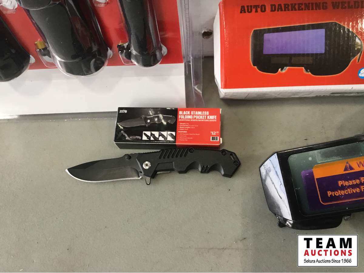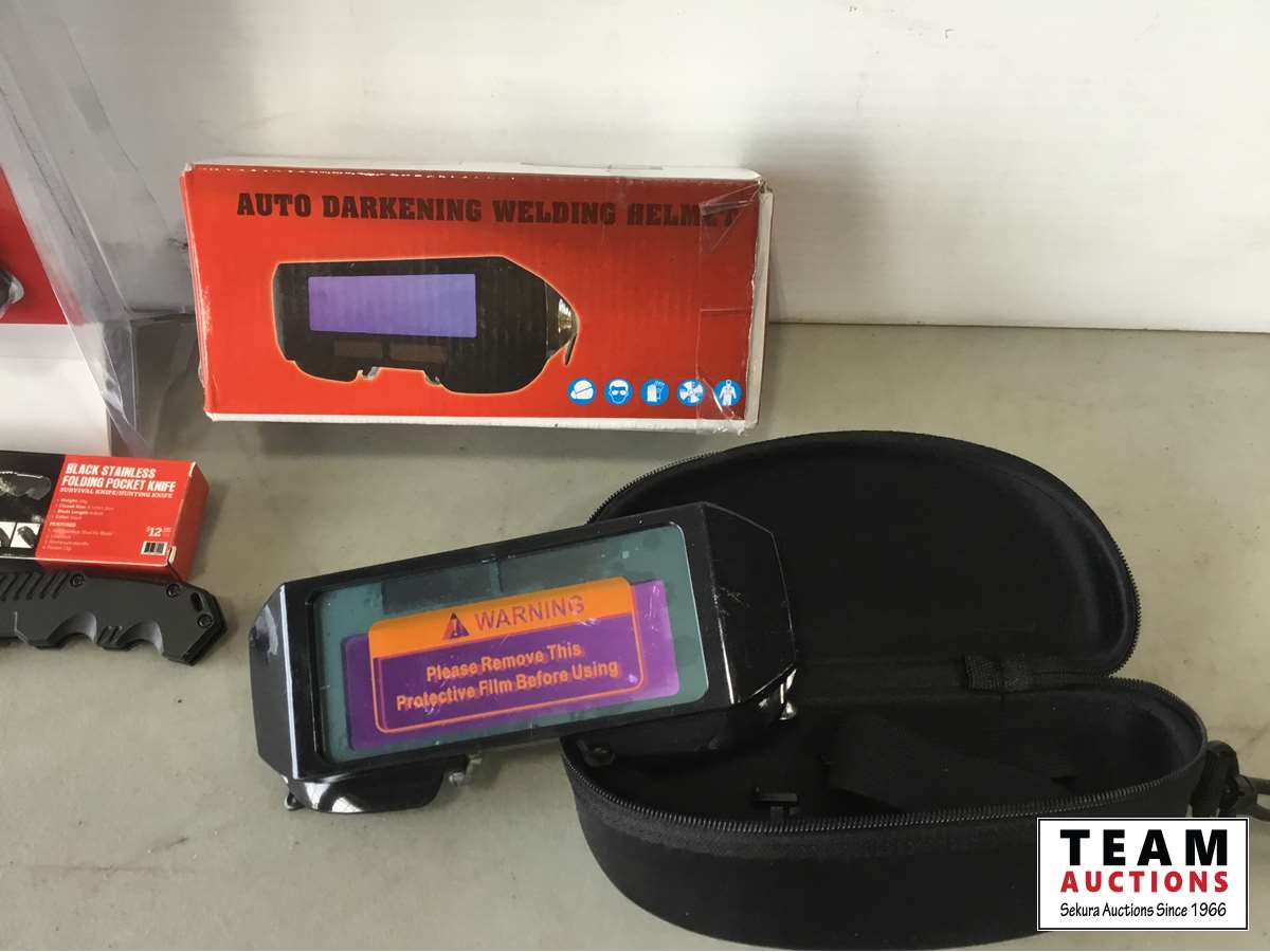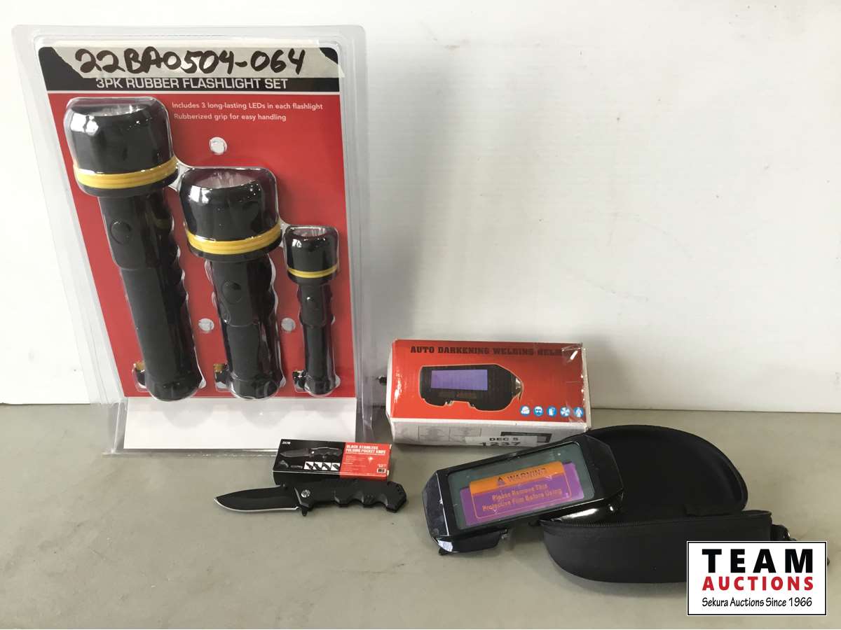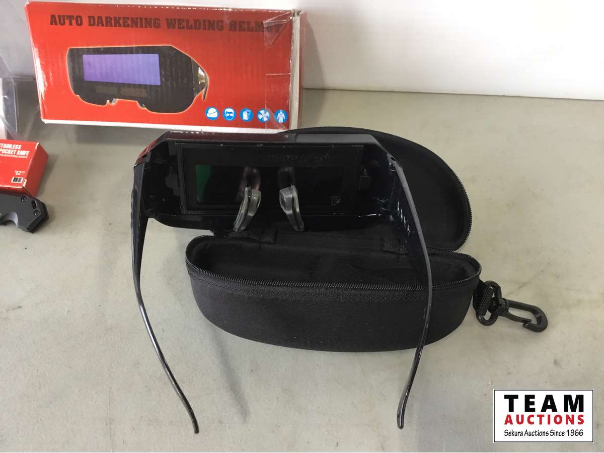 1561 Flashlight Set, Auto Darkening Welding Glasses, Folding Pocket Knife (Unused)
