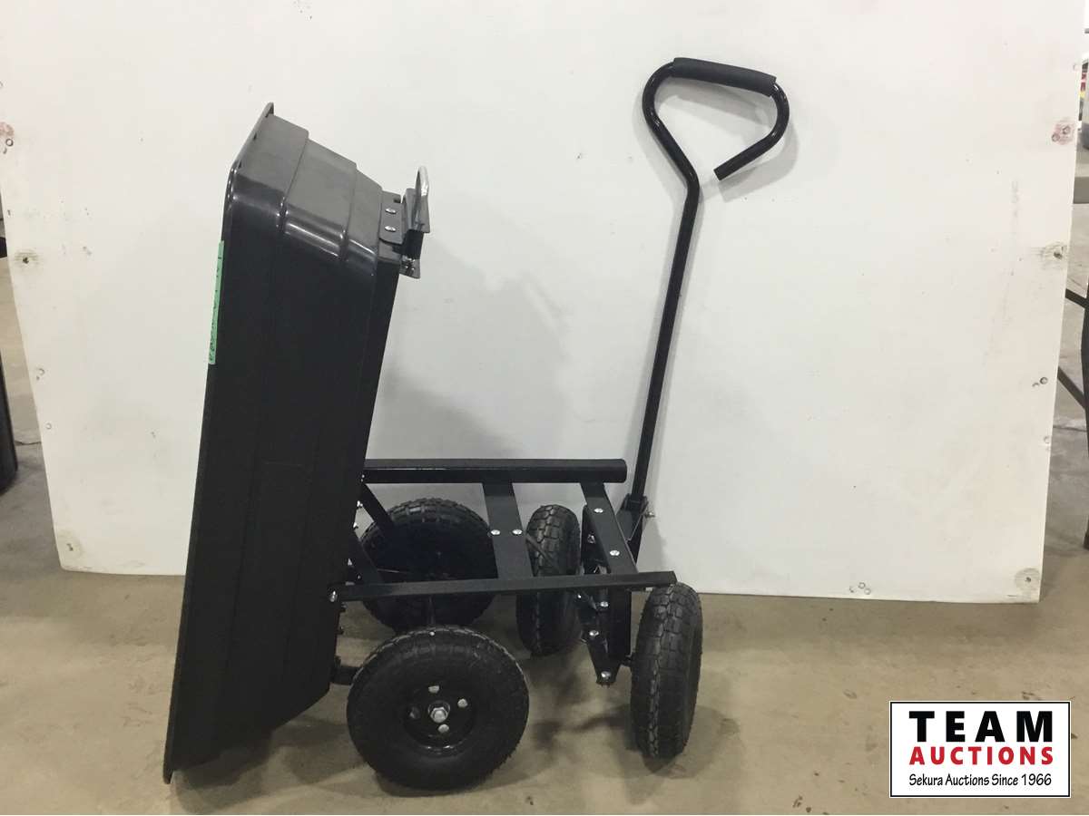 20 inch W x 37 inch L x 19 inch H, poly box, dumps, rubber tires