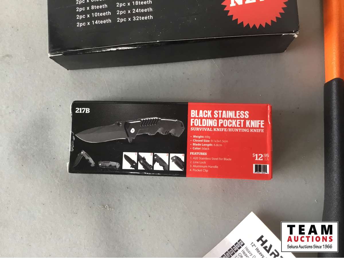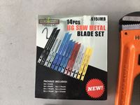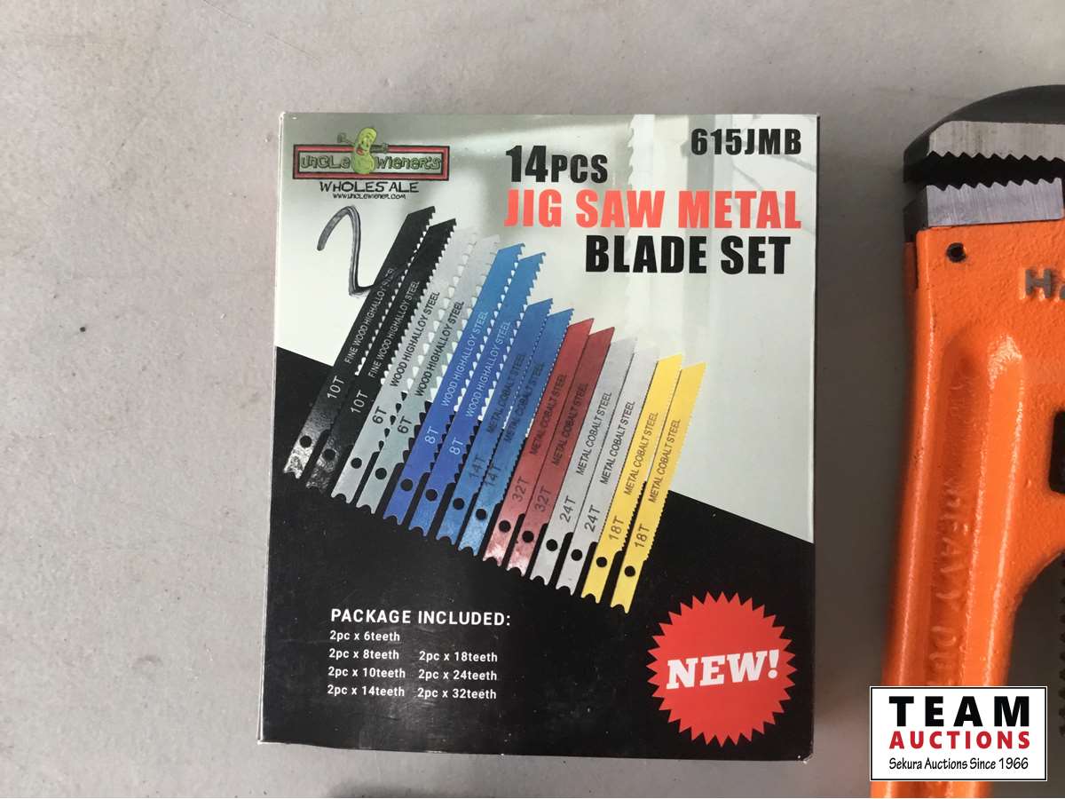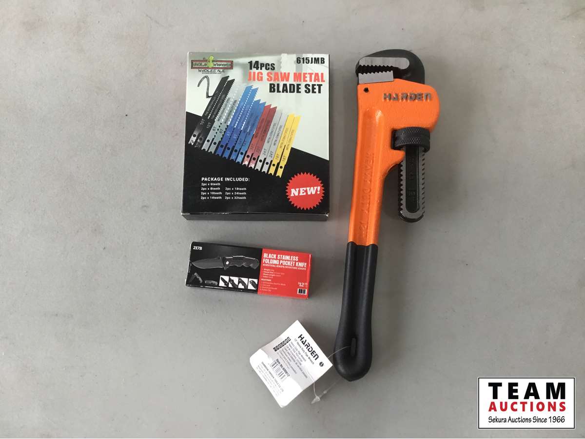 1555 Harden 12 Inch Pipe Wrench, 14 Piece Jig Saw Blade Ste and Folding Pocket Knife (Unused)