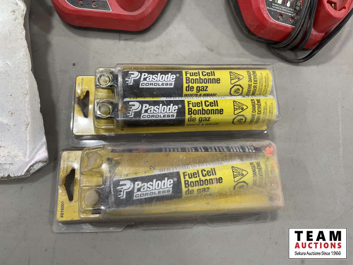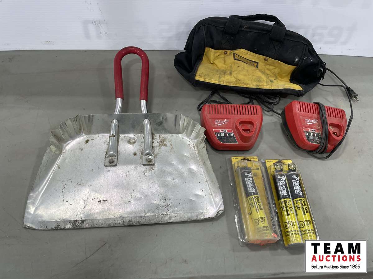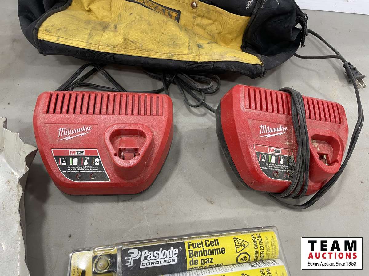 Milwaukee chargers, Dust pan, Paslode fuel cells, DeWalt bag