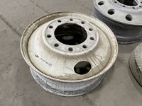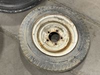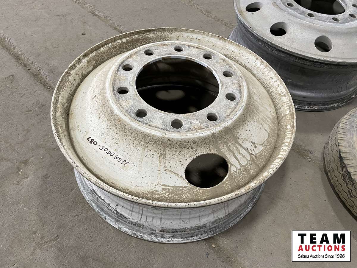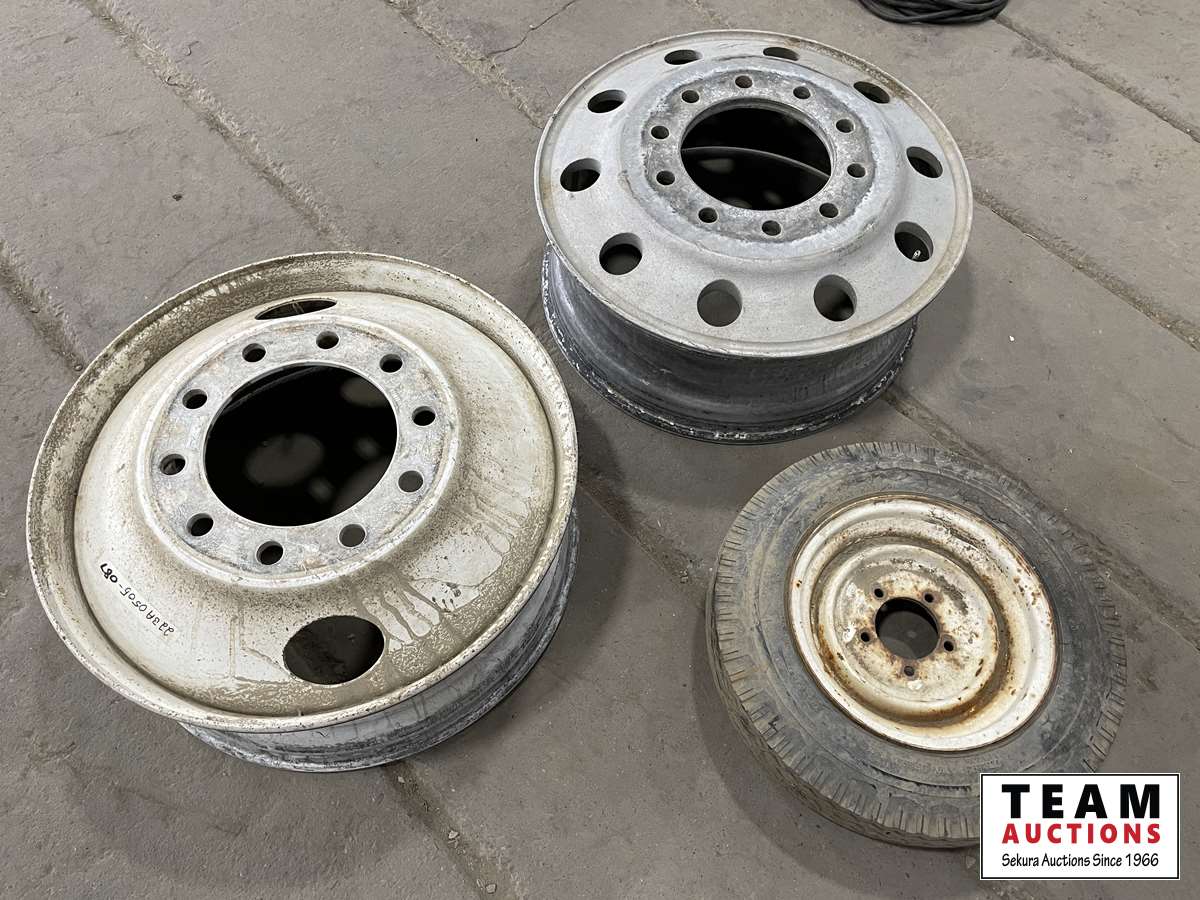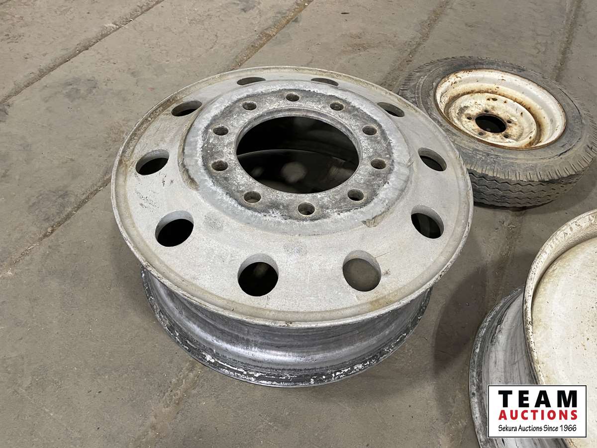 (1) steel heavy truck rim 24.5 inch, (1) aluminum heavy truck rim 24.5 inch, (1) trailer tire with rim 5.30-12