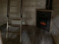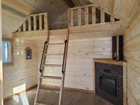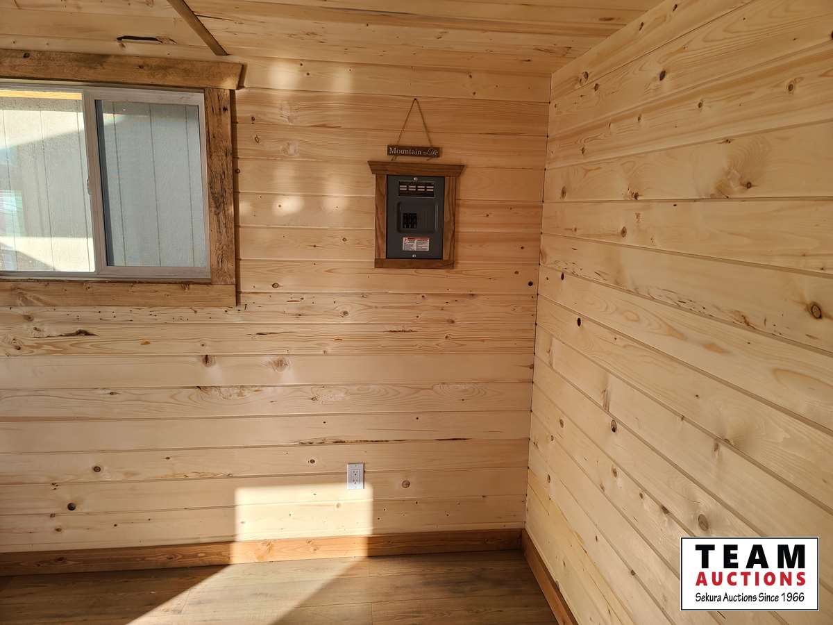 Single carpeted loft, corner mount electric fireplace, front veranda, 2 x 6 walls and ceiling, metal roof, laminate flooring, wired with 100 amp service, all wired with pot lights, on skids with front tow bar, one opening side window, all stained with Australian timber oil