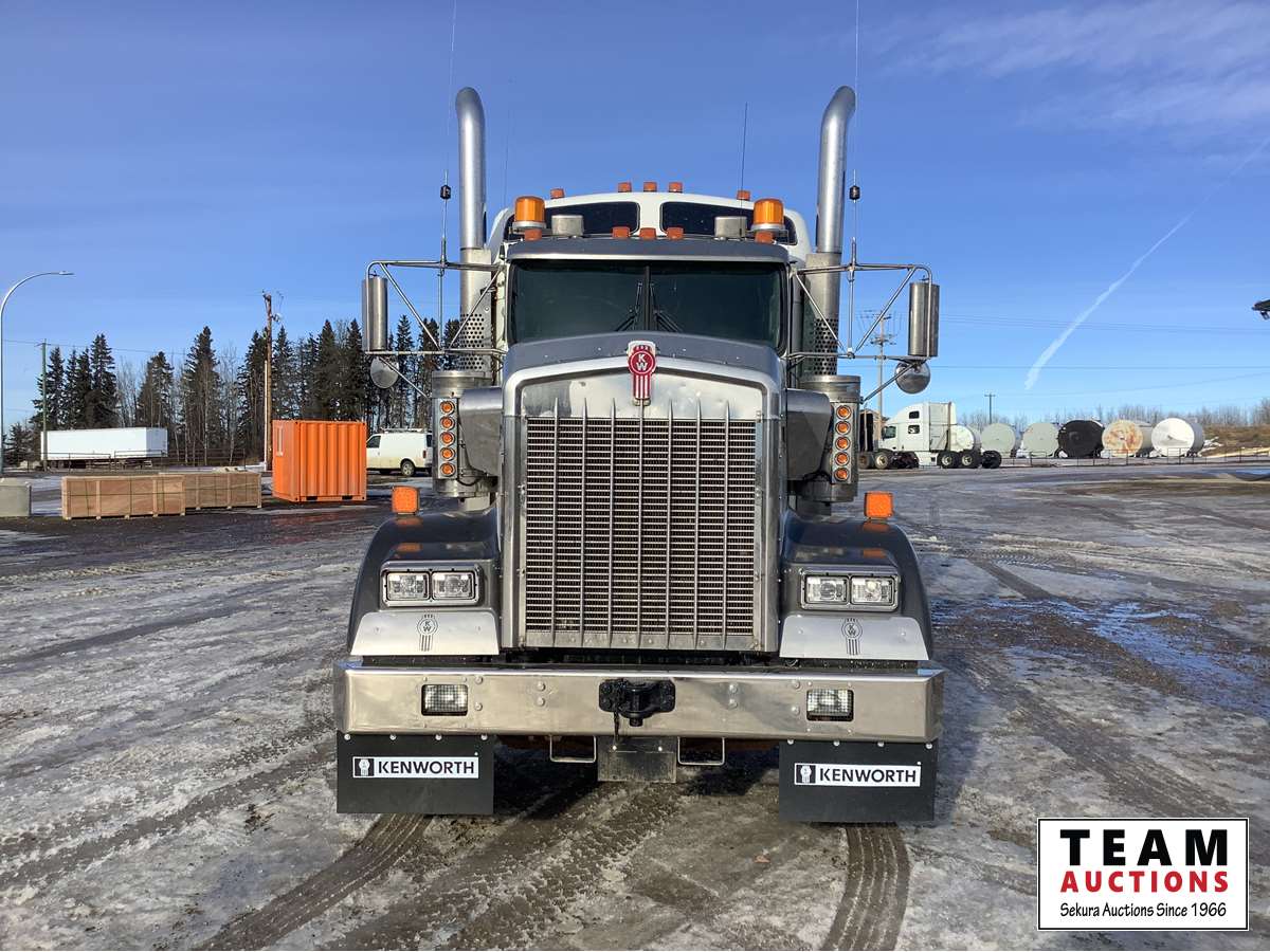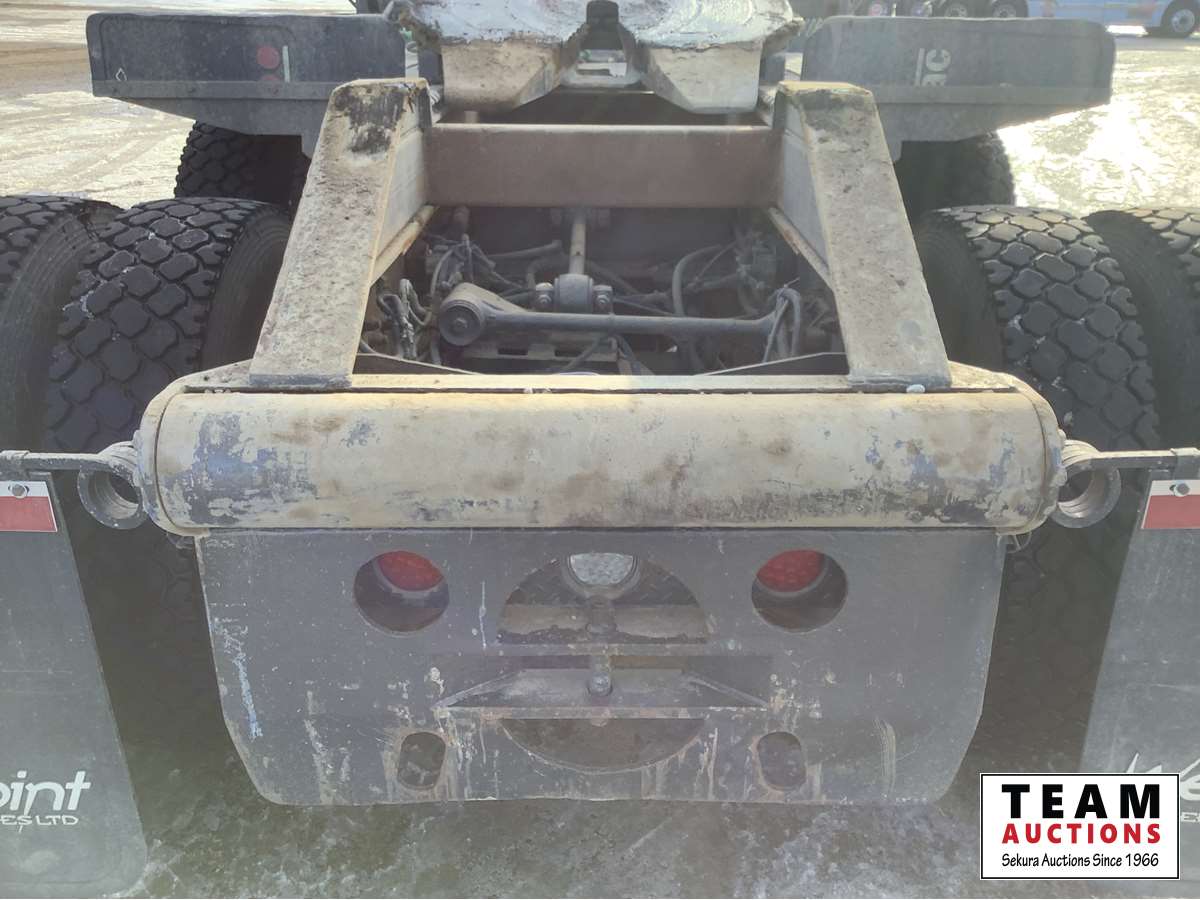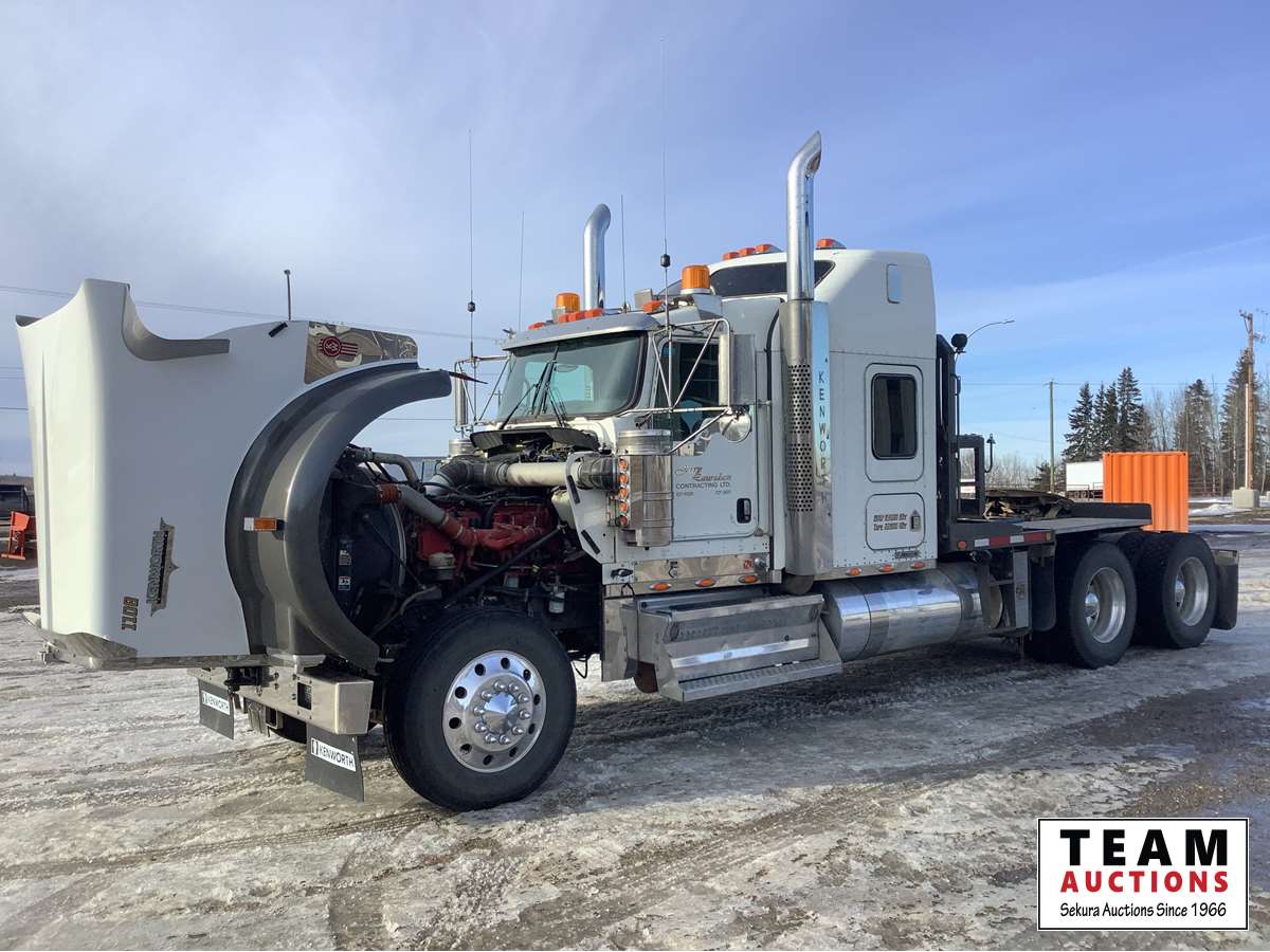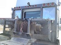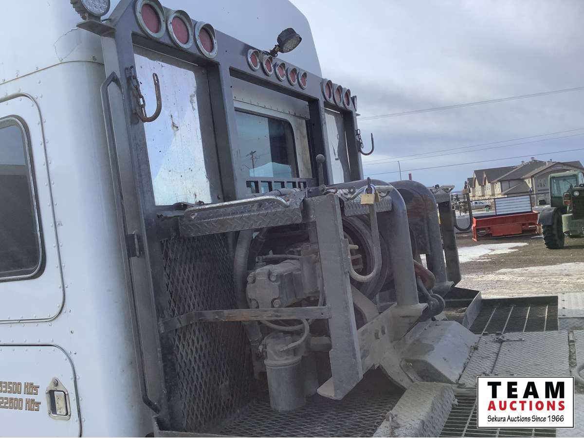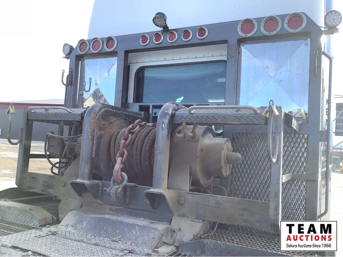 Cummins ISX 600 deleted engine, 18 speed Fuller 189B transmission, 13,200 lb front axle, 46,000 rears, full 4 way lockers, Neway air ride suspension, rebuilt air sliding 5th wheel, rear low bed ramps, live roll and rear tow hitch on back of frame, top cab mount beacon light, 268 inch wheel base, (2) side frame mounted tool boxes, tire chains, upgraded headlights, sun roof, Aero cab, sleeper and double fold up top bunk bed, rear window, Rufnek hydraulic drive winch with Ace head rack, full deck cover with storage lids, 11R24.5 tires on aluminum rims