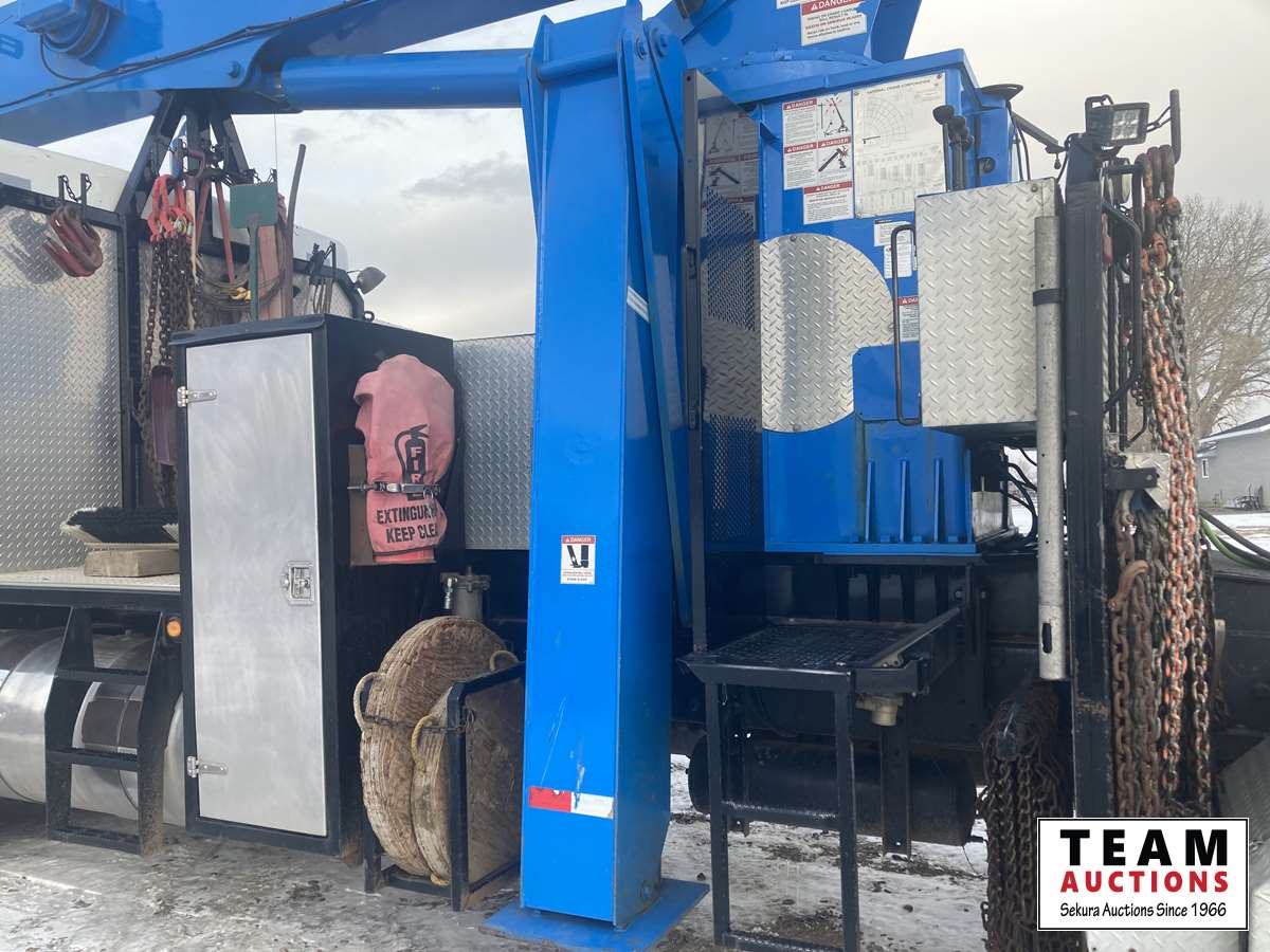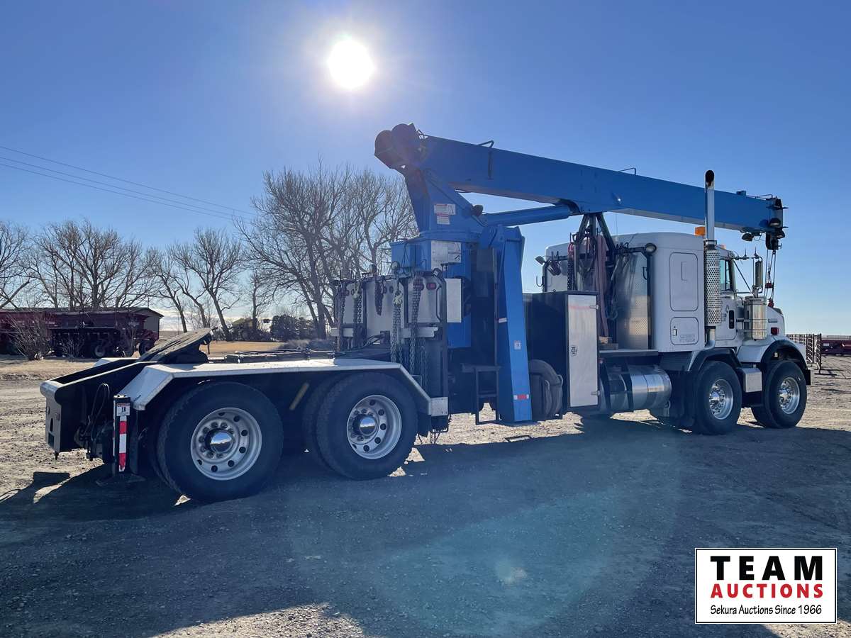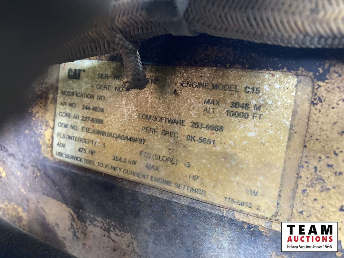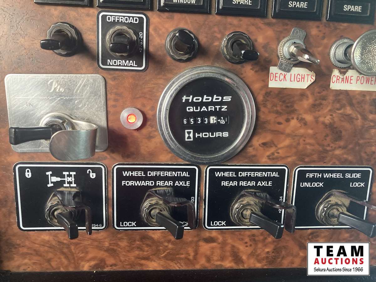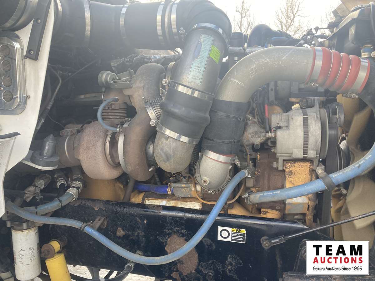 Caterpillar C15, 6 cylinder, diesel, 475 HP, Eaton Fuller 18 speed, engine brake, double differential lock, cross lock, 337 inch WB, 40 inch sleeper, 105 ft center mounted boom, Johnson 1 sheave block, 22 ton capacity, dual controls, hydraulic outriggers, 32,000 lb front, 46,000 lb rear, 425/65R22.5 front, 11R24.5 rear, 6533 PTO hrs, crane certification 01/2022