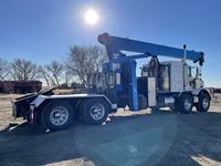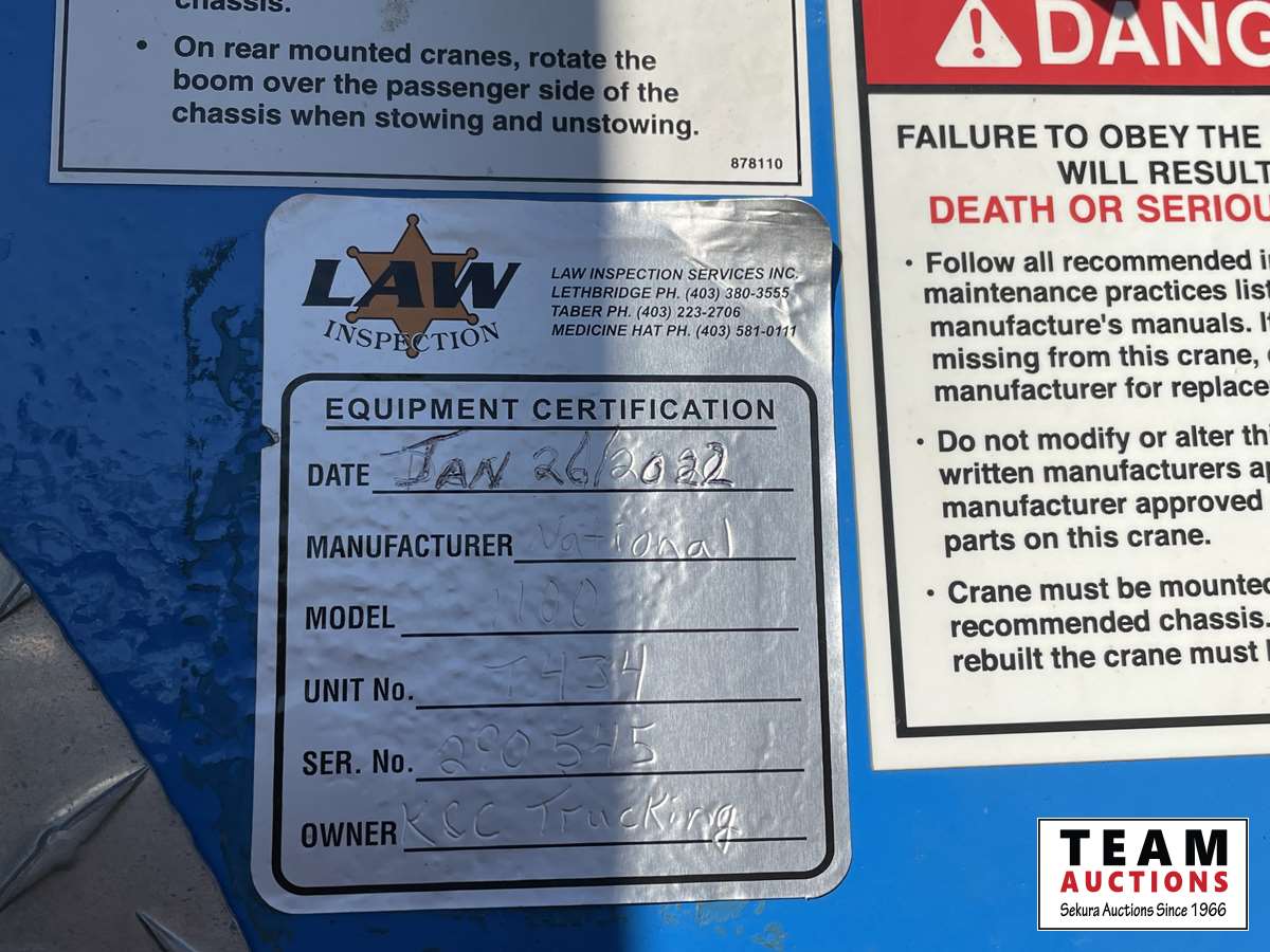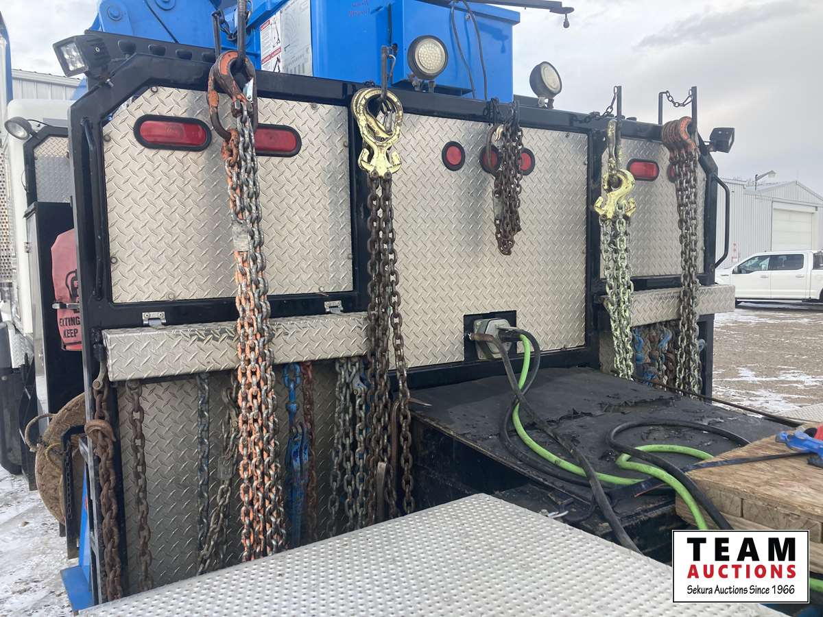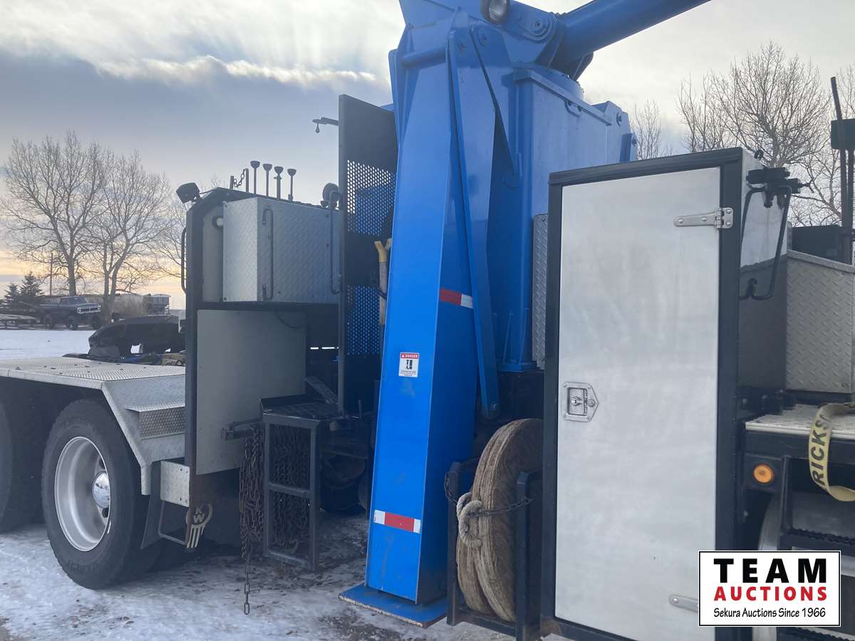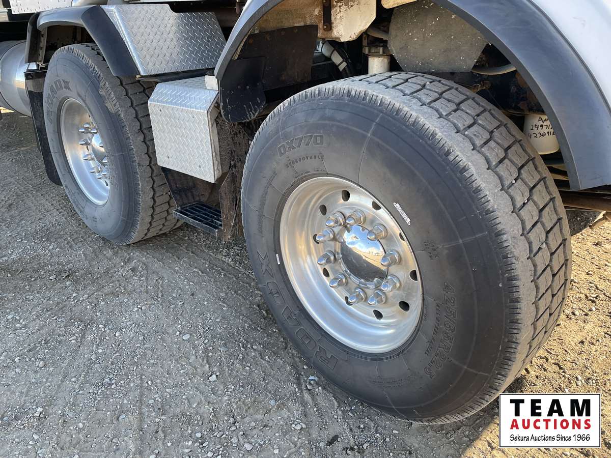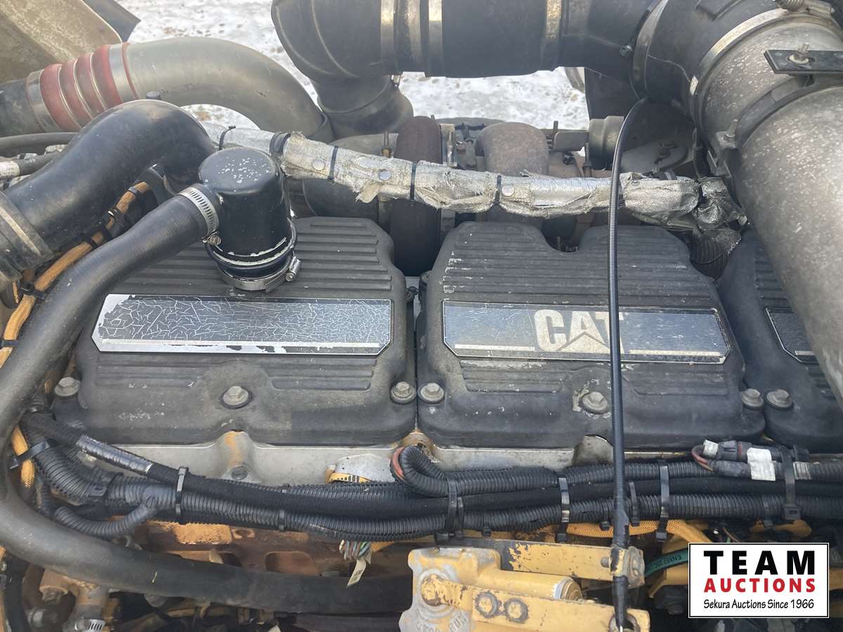 Caterpillar C15, 6 cylinder, diesel, 475 HP, Eaton Fuller 18 speed, engine brake, double differential lock, cross lock, 337 inch WB, 40 inch sleeper, 105 ft center mounted boom, Johnson 1 sheave block, 22 ton capacity, dual controls, hydraulic outriggers, 32,000 lb front, 46,000 lb rear, 425/65R22.5 front, 11R24.5 rear, 6533 PTO hrs, crane certification 01/2022