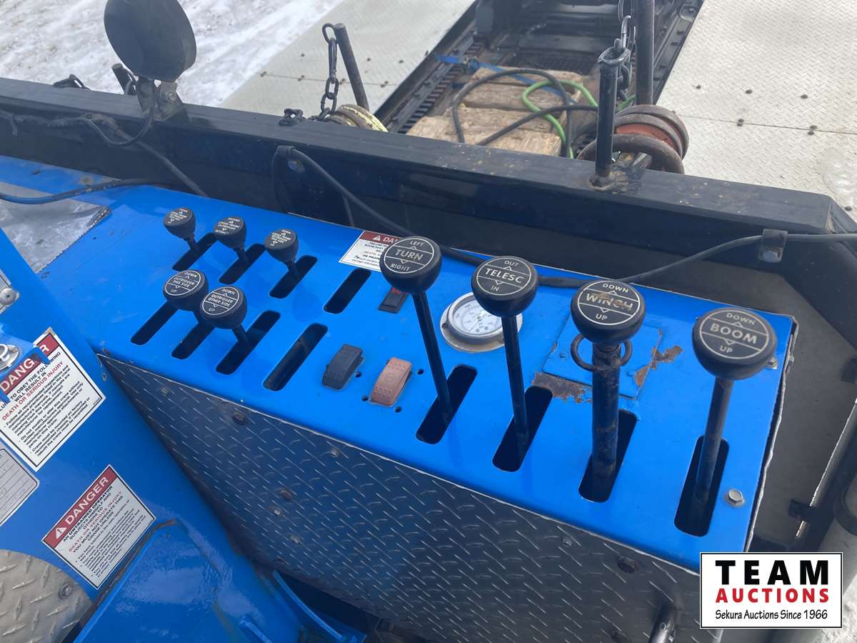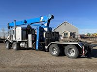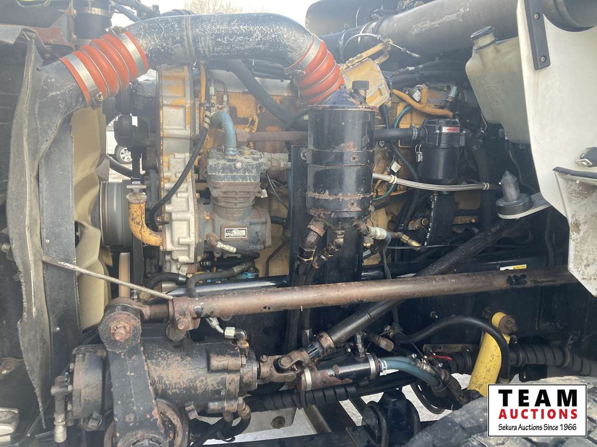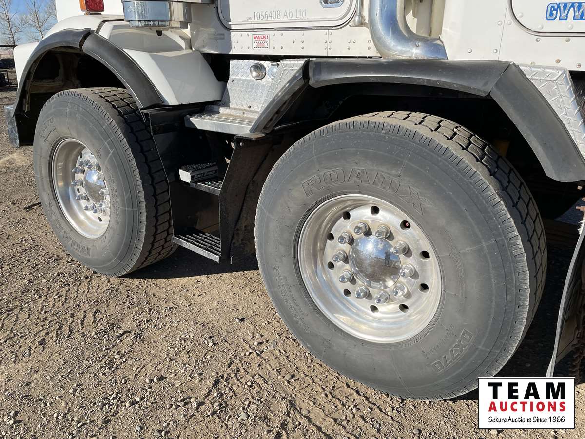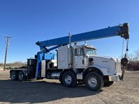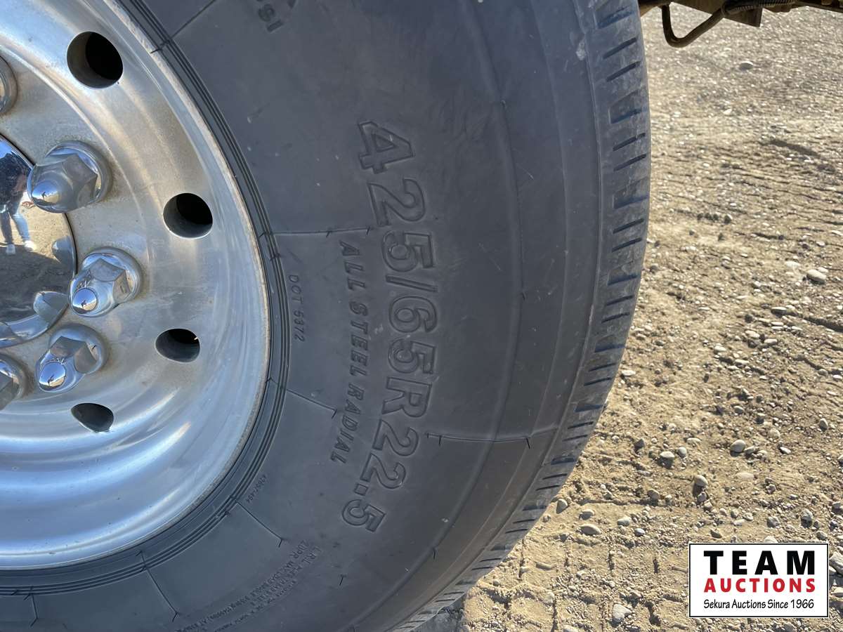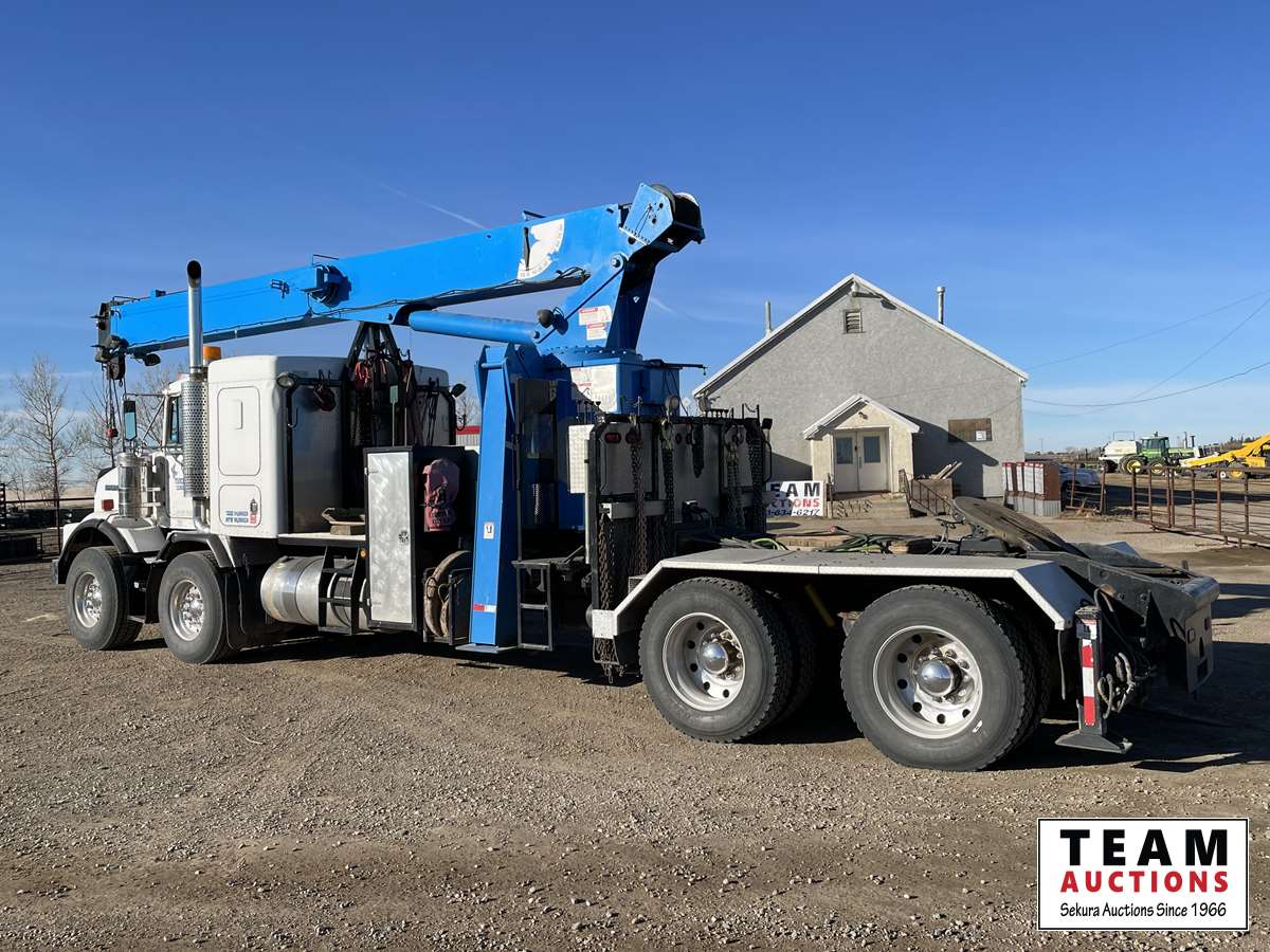 Caterpillar C15, 6 cylinder, diesel, 475 HP, Eaton Fuller 18 speed, engine brake, double differential lock, cross lock, 337 inch WB, 40 inch sleeper, 105 ft center mounted boom, Johnson 1 sheave block, 22 ton capacity, dual controls, hydraulic outriggers, 32,000 lb front, 46,000 lb rear, 425/65R22.5 front, 11R24.5 rear, 6533 PTO hrs, crane certification 01/2022