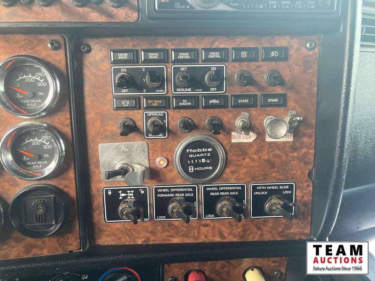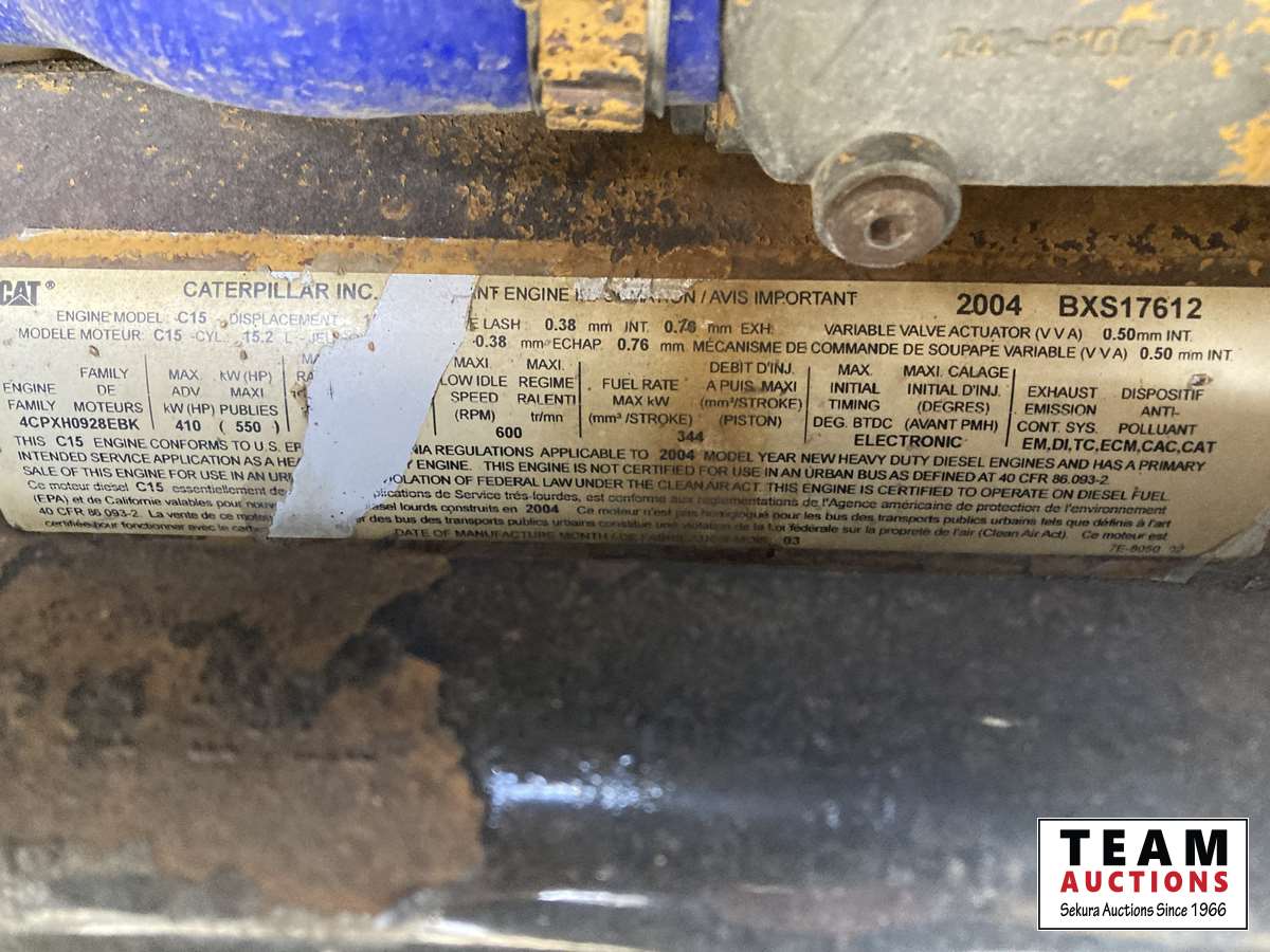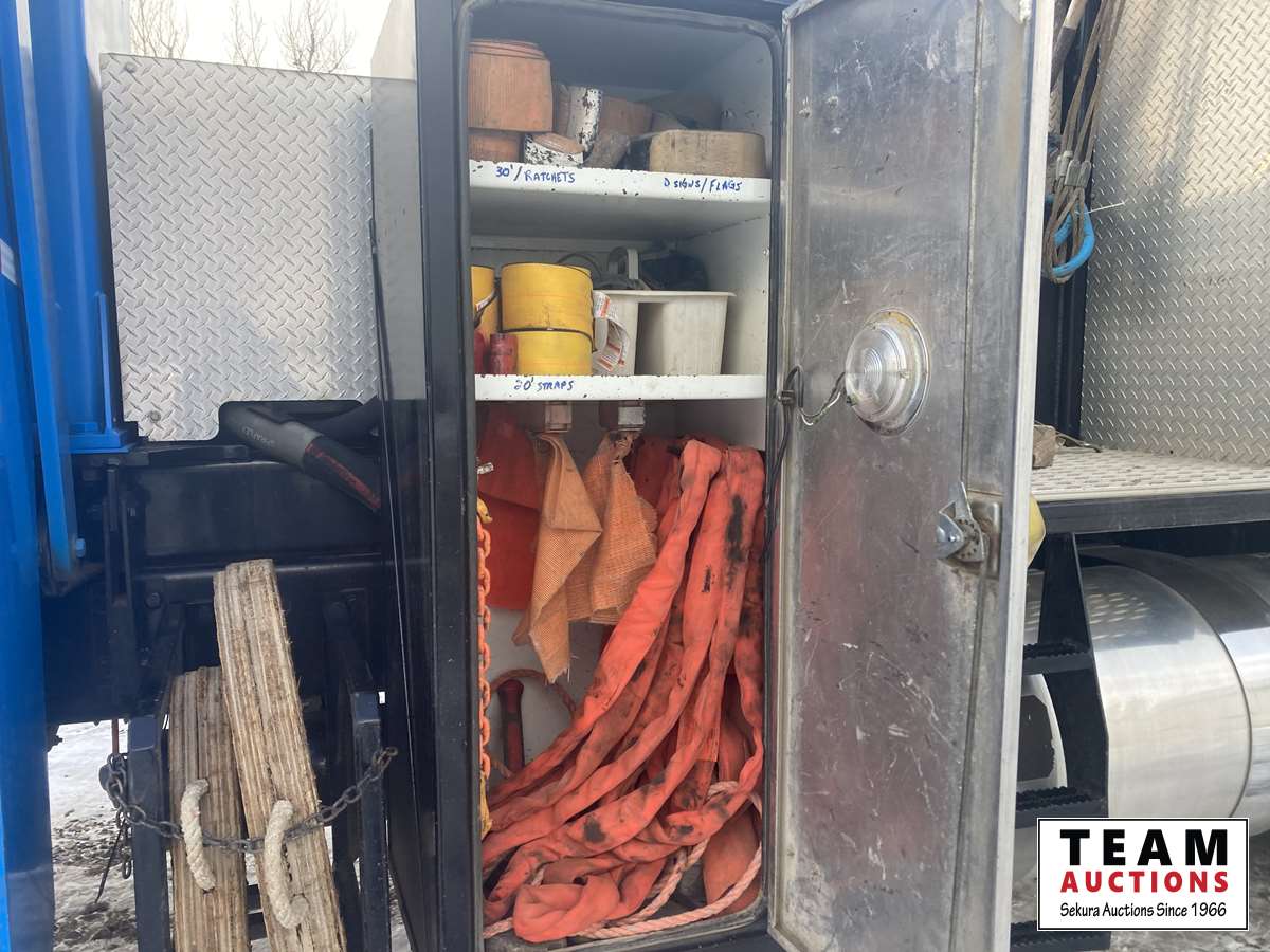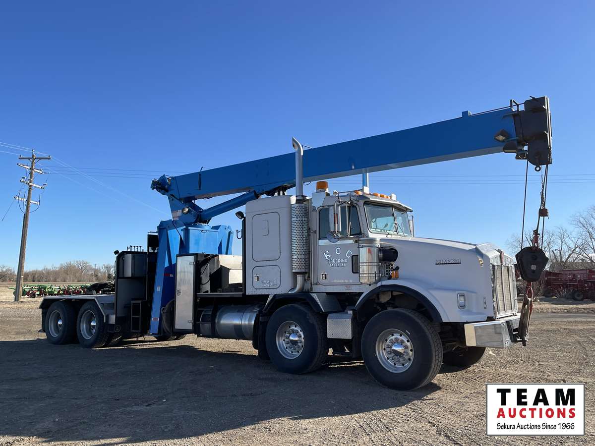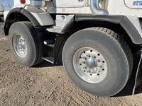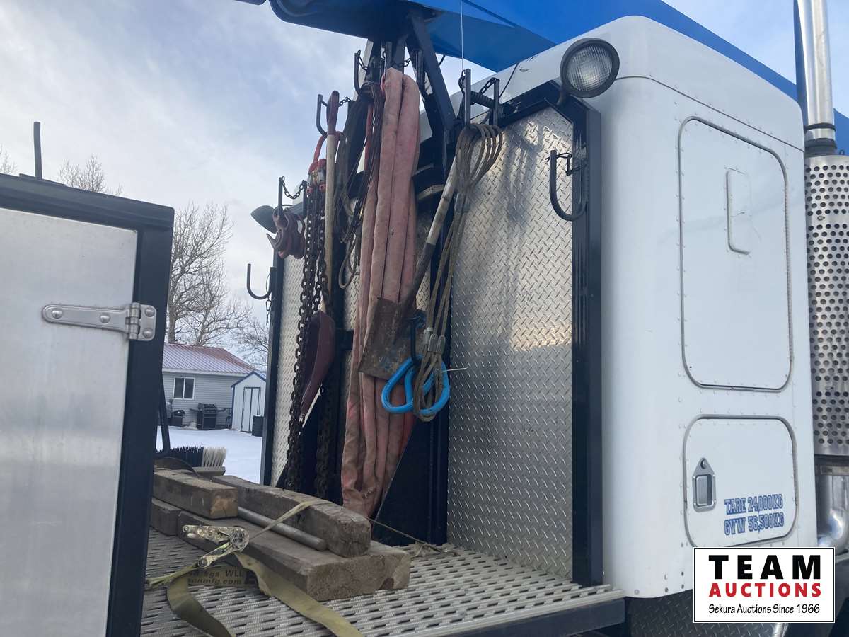 Caterpillar C15, 6 cylinder, diesel, 475 HP, Eaton Fuller 18 speed, engine brake, double differential lock, cross lock, 337 inch WB, 40 inch sleeper, 105 ft center mounted boom, Johnson 1 sheave block, 22 ton capacity, dual controls, hydraulic outriggers, 32,000 lb front, 46,000 lb rear, 425/65R22.5 front, 11R24.5 rear, 6533 PTO hrs, crane certification 01/2022