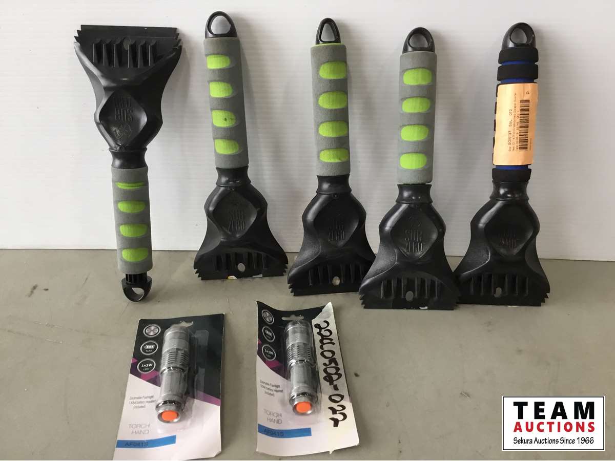 1447 (5) Ice Scrapers & (2) Zoomable Flash Lights (Unused)