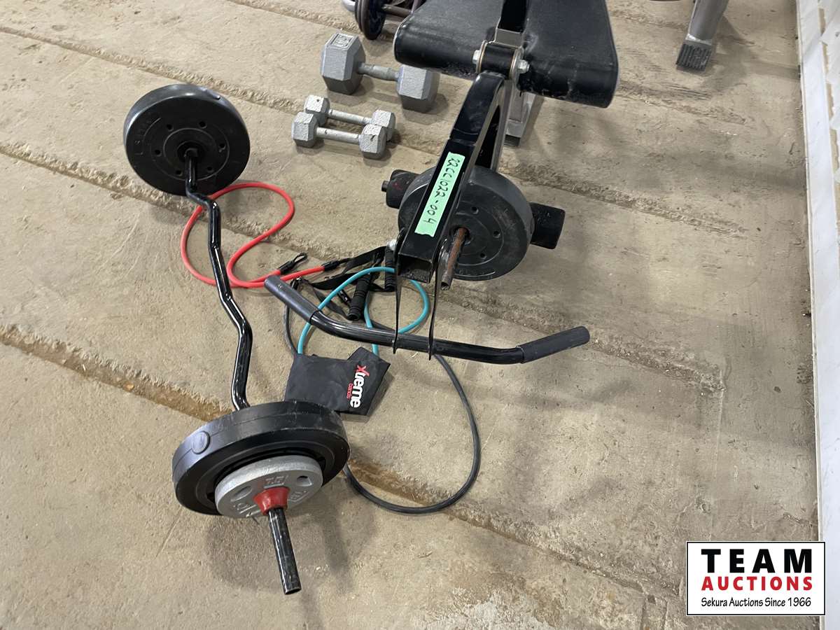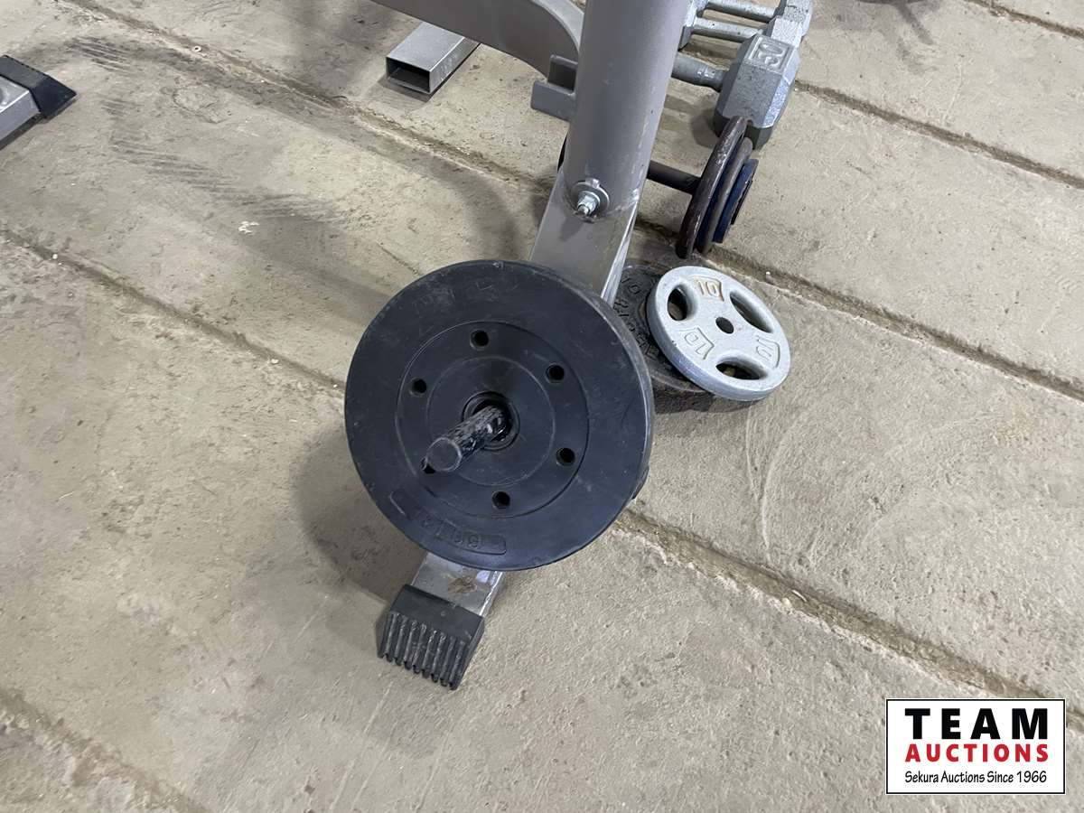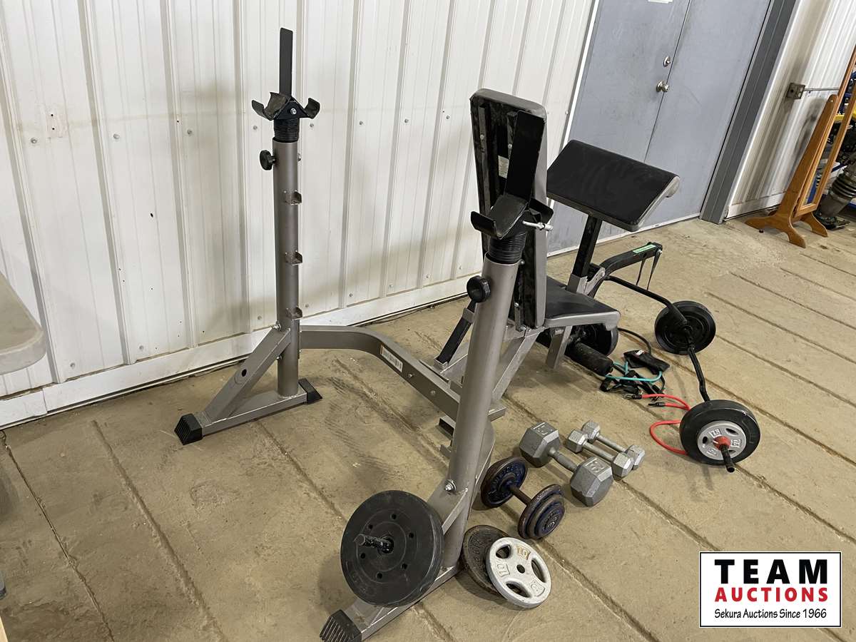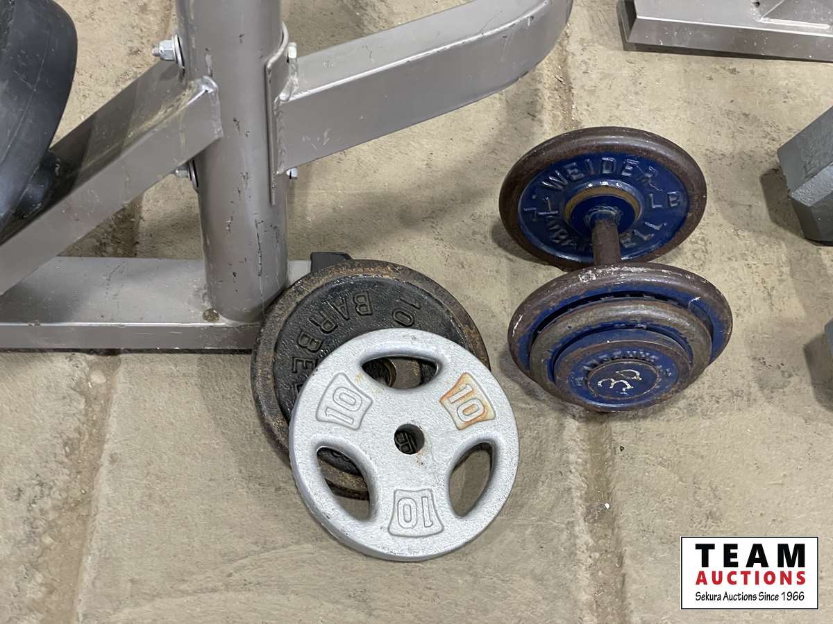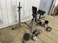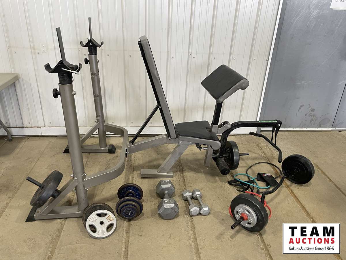 1232 Assorted Weights, Squat Rack Leg and Bicep Curl Machine.