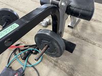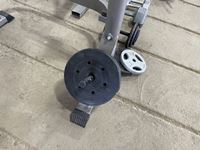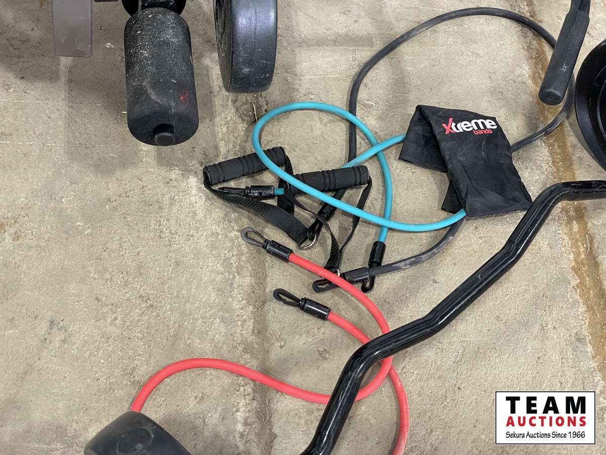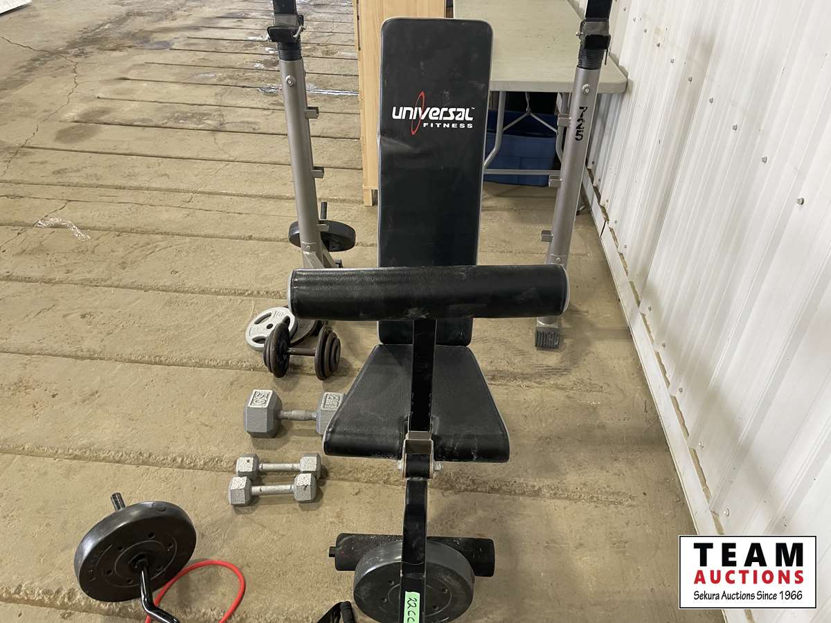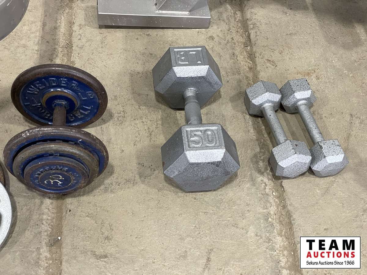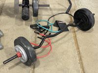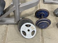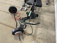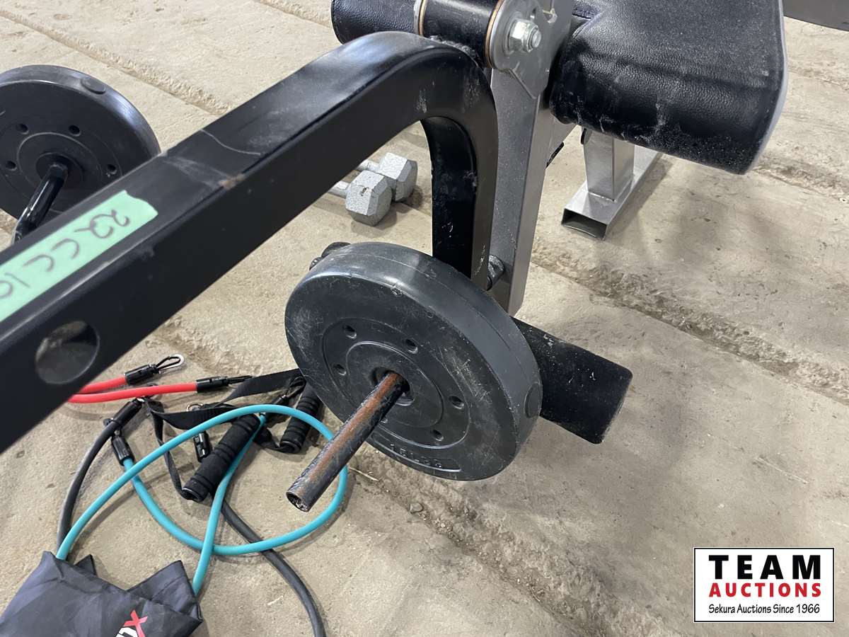 1232 Assorted Weights, Squat Rack Leg and Bicep Curl Machine.