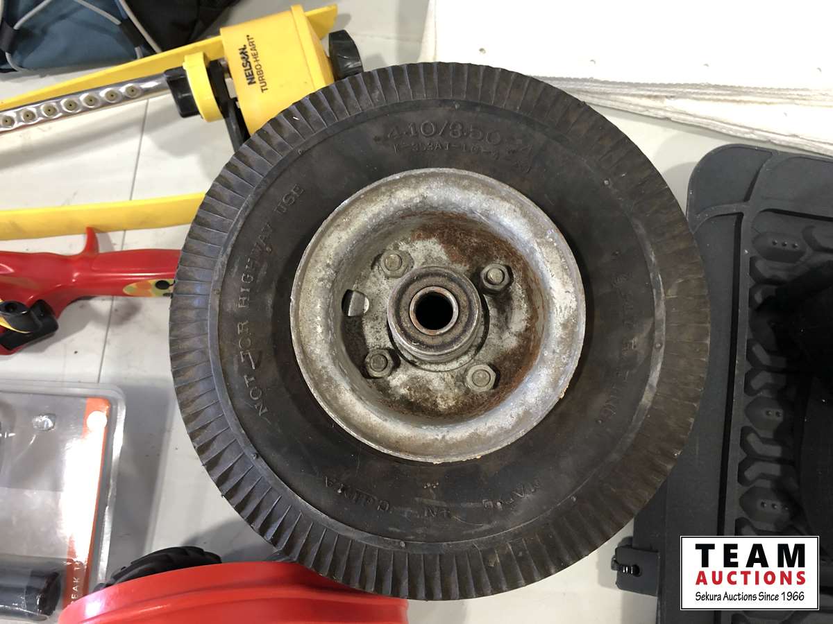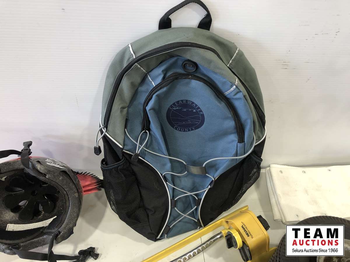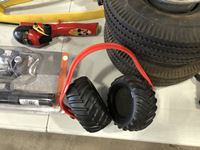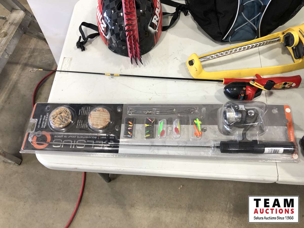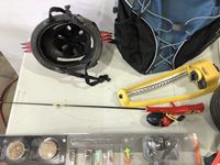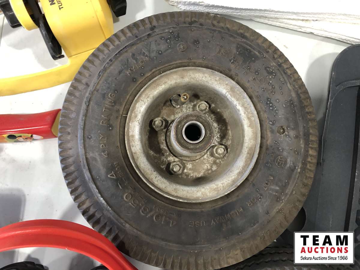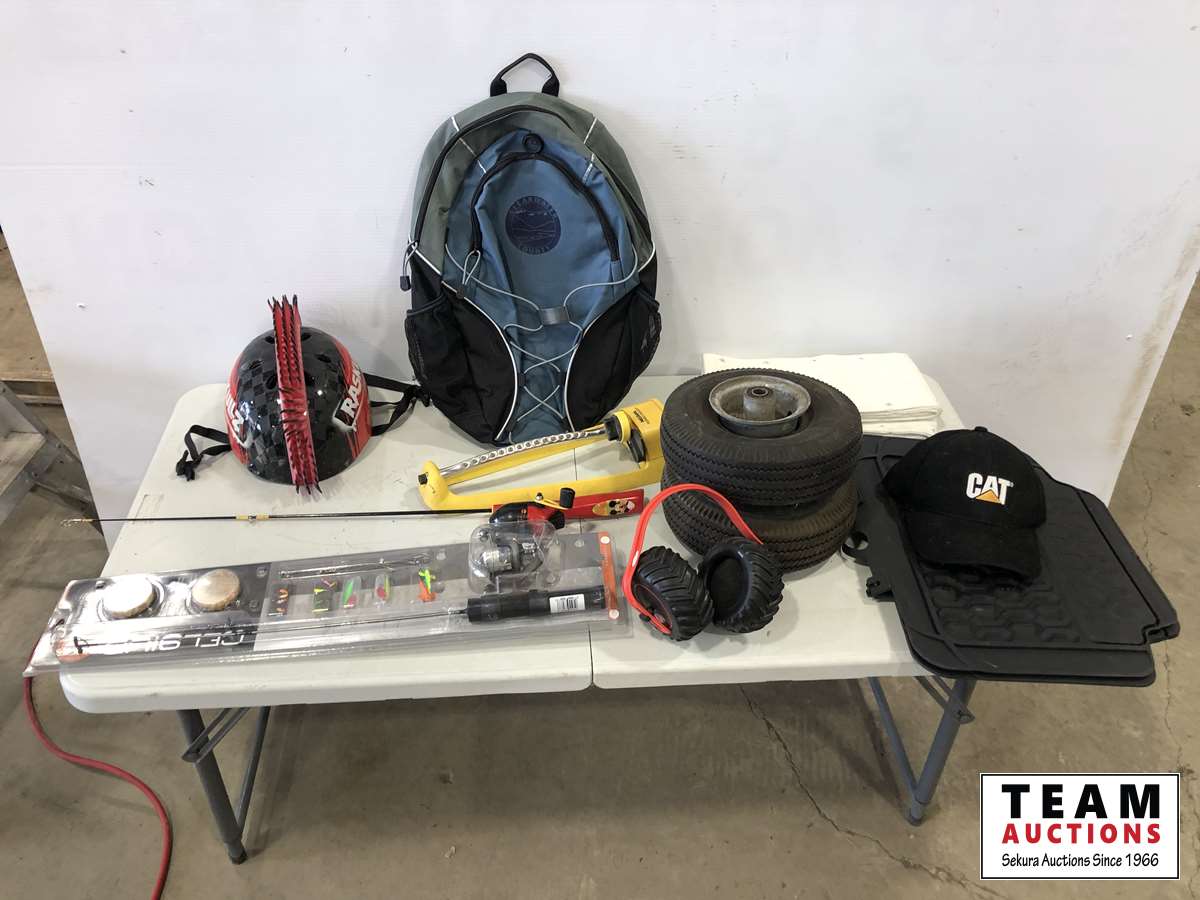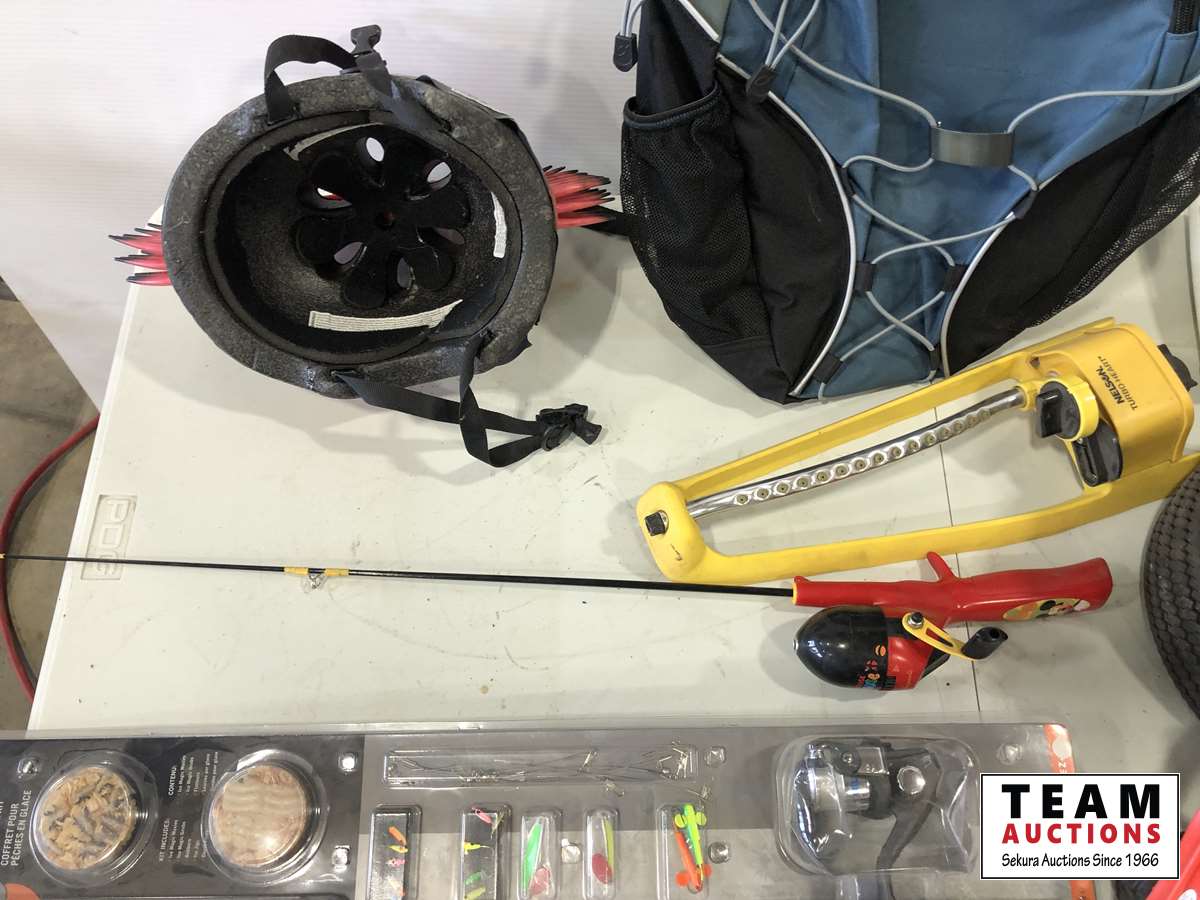 Helmet, fishing rods, floor mats, sprinkler, ear muff, wheel barrow 10 inch tires
