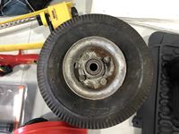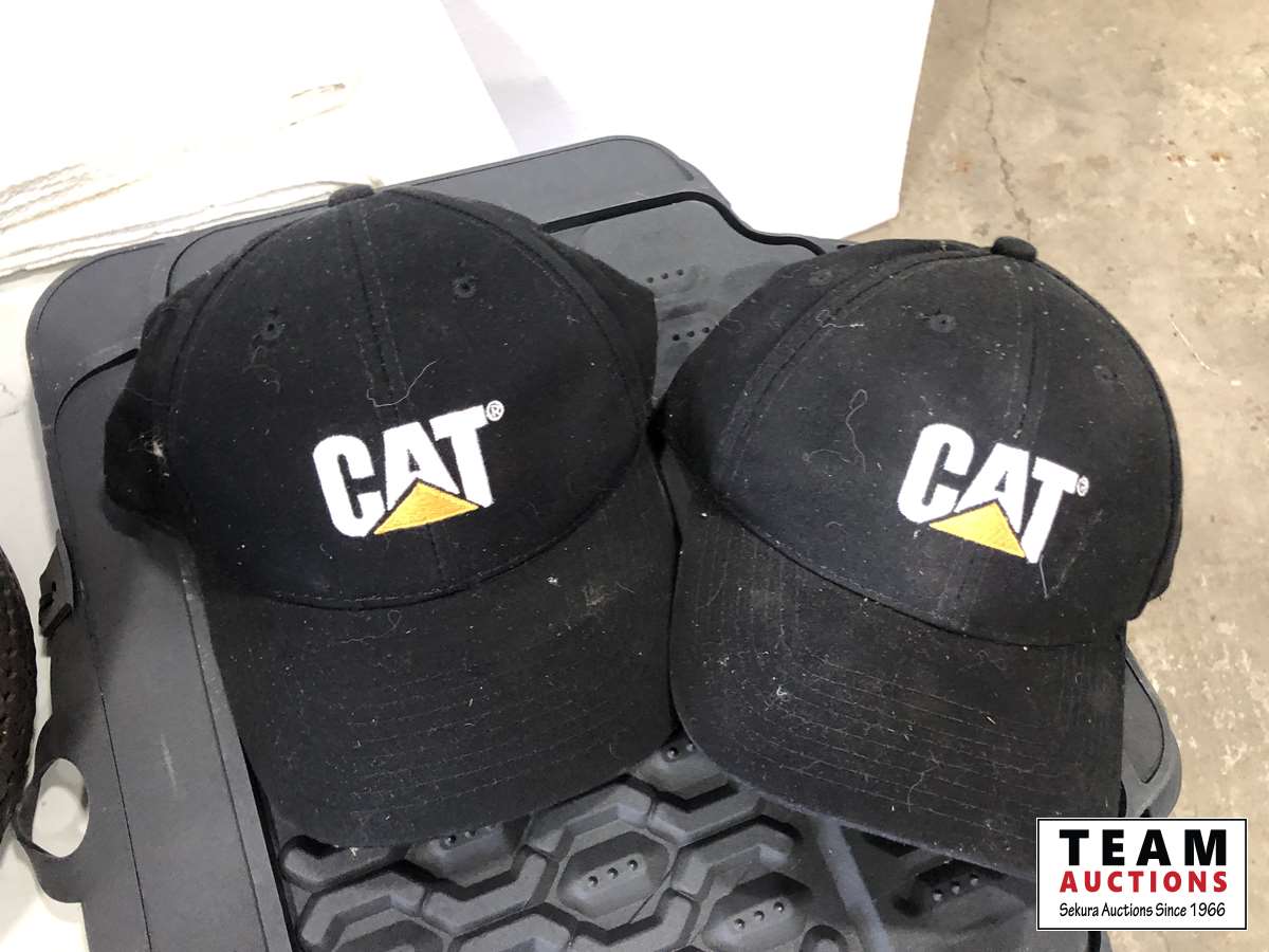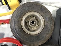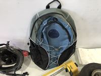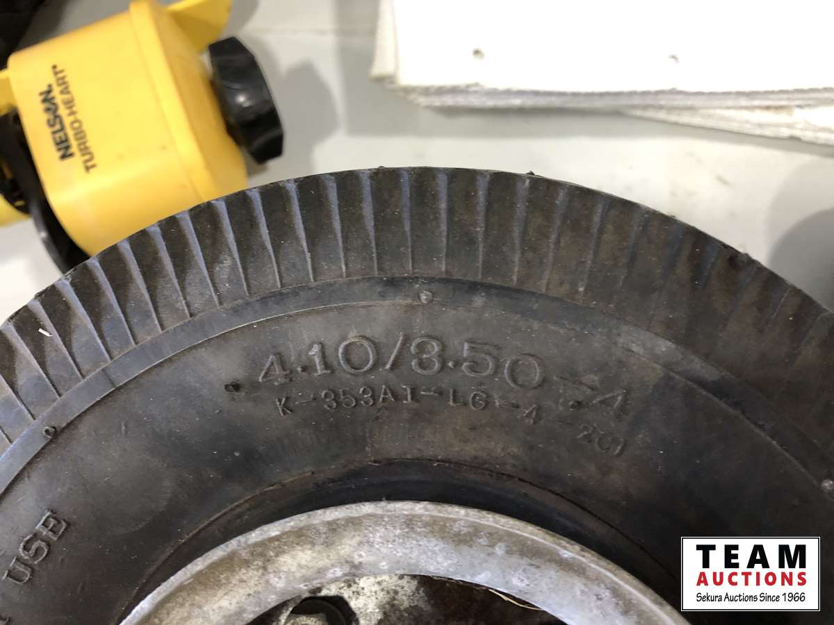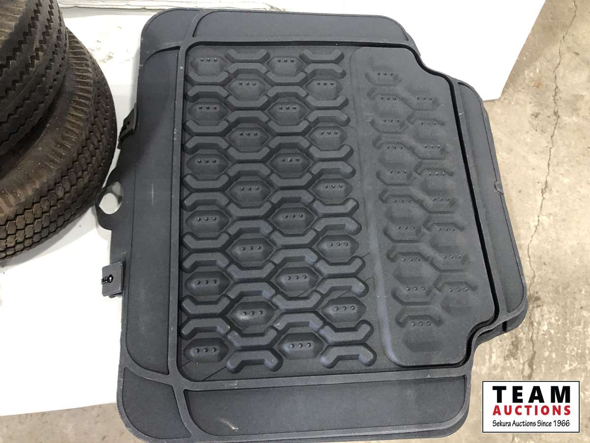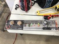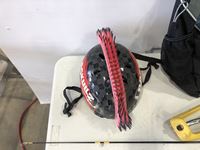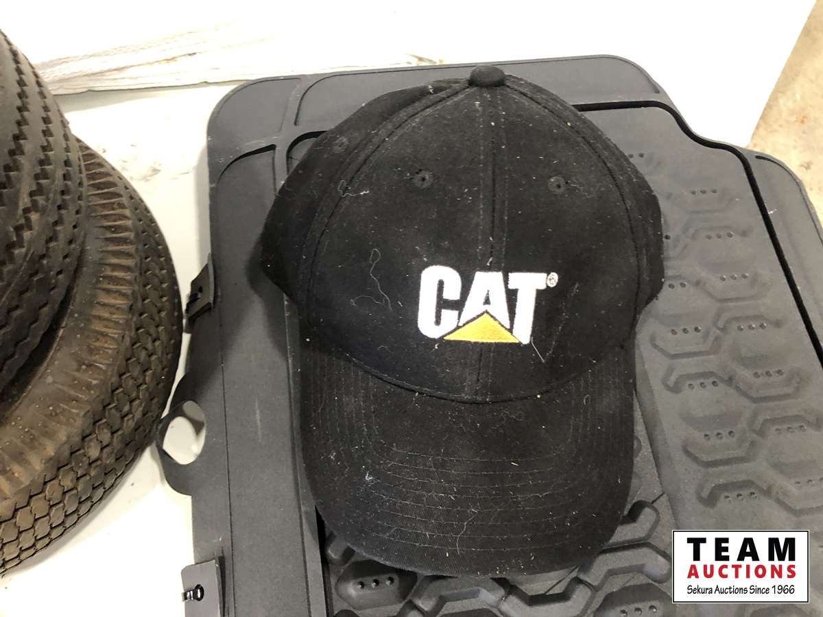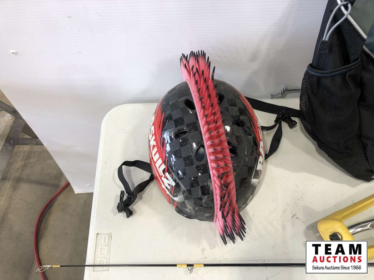 Helmet, fishing rods, floor mats, sprinkler, ear muff, wheel barrow 10 inch tires