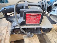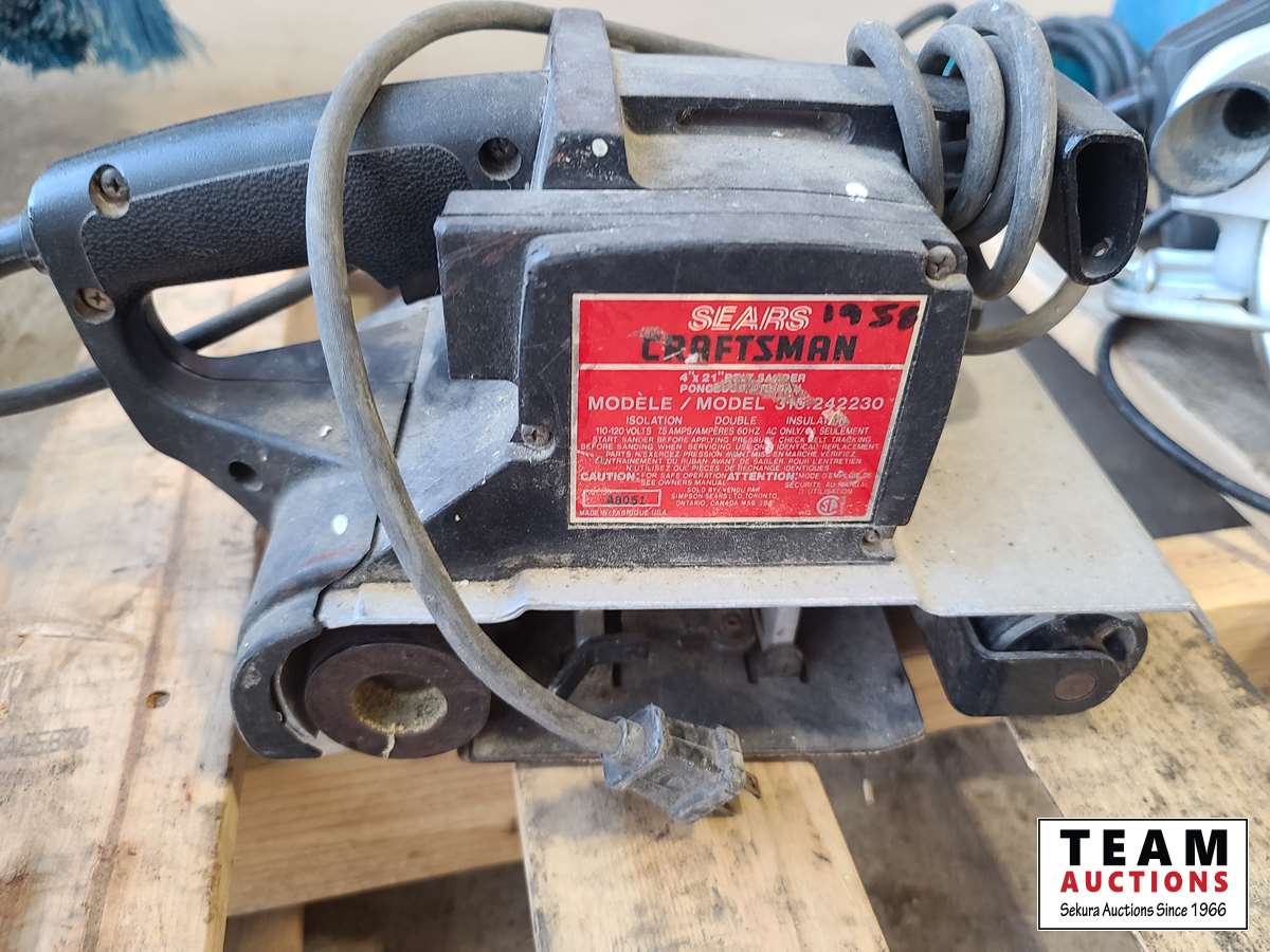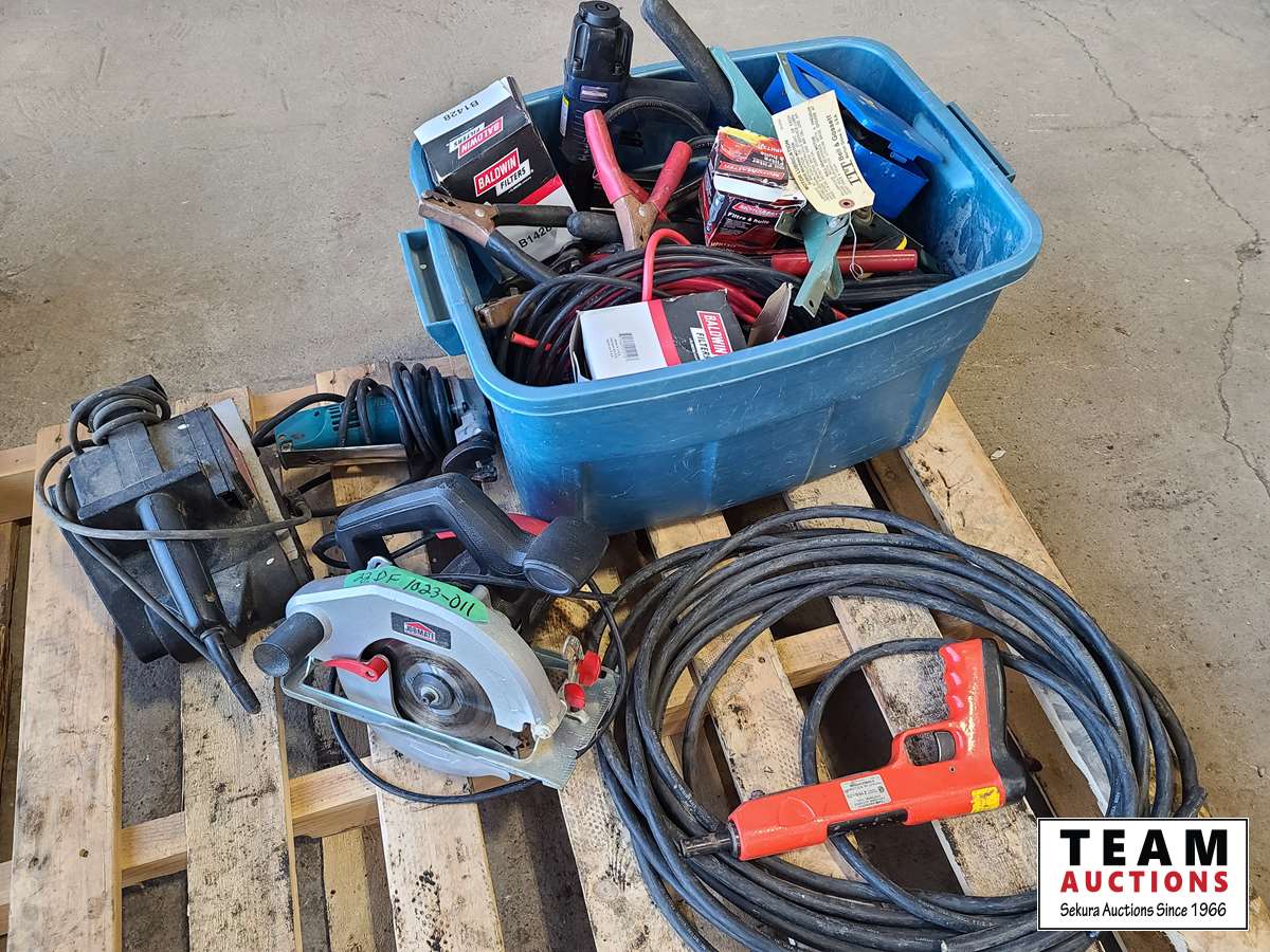 Jobmate circular saw, Sears belt sander, miscellaneous filers, tote of miscellaneous