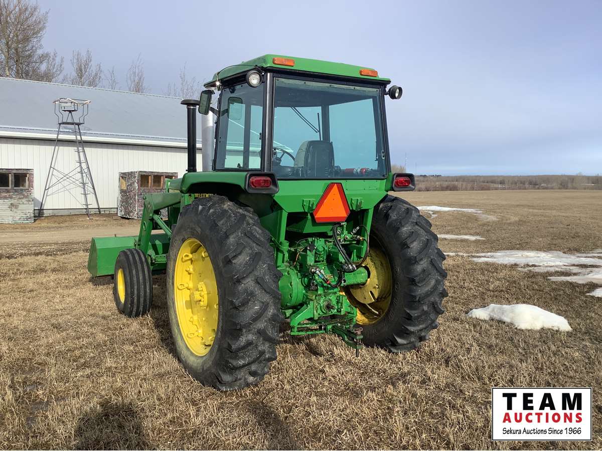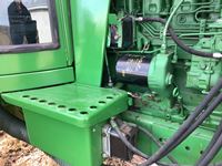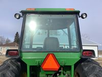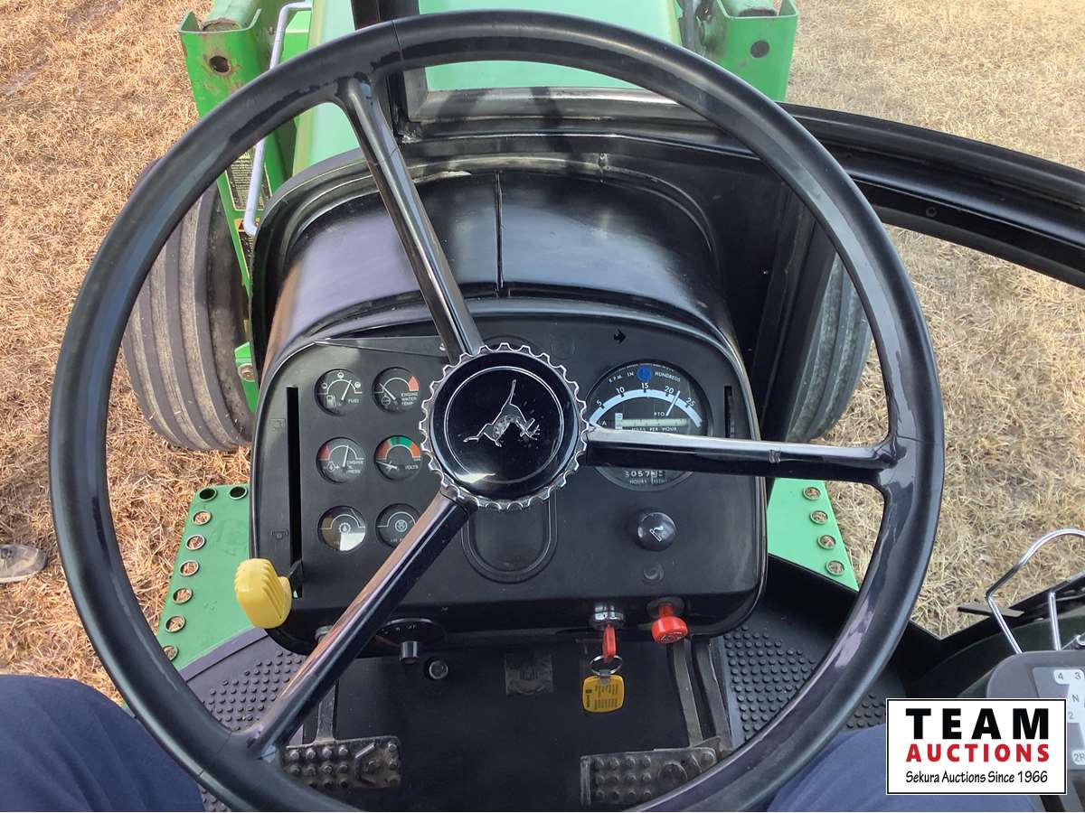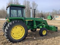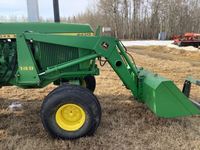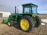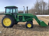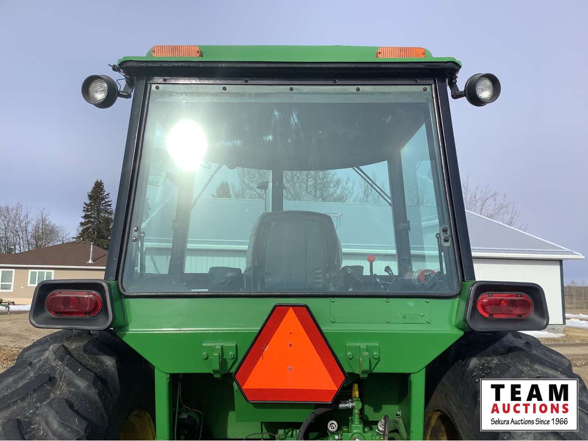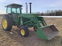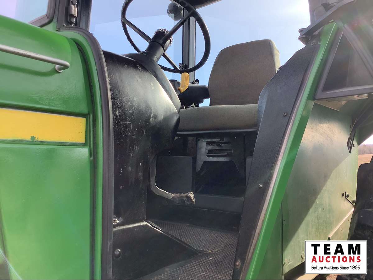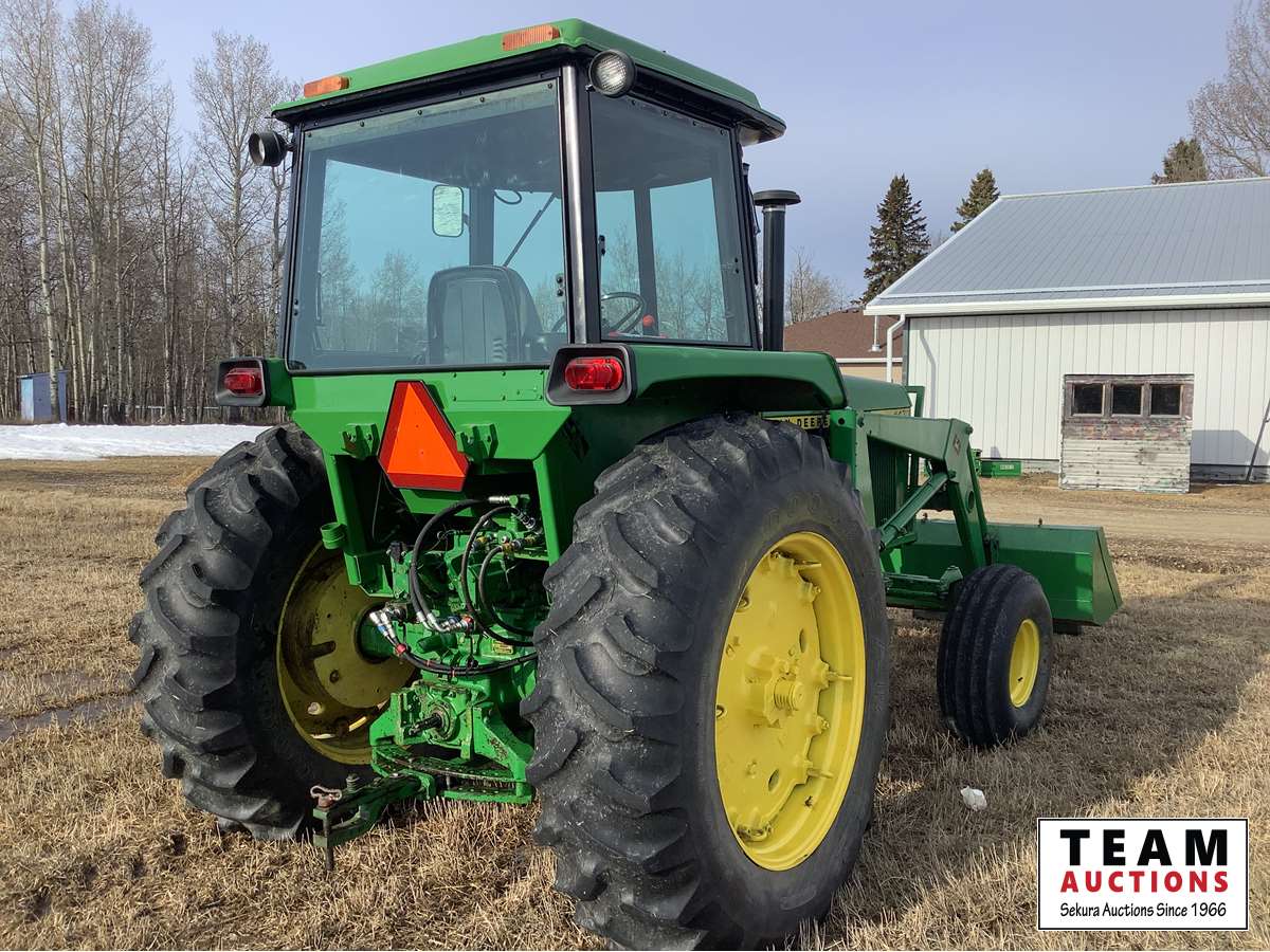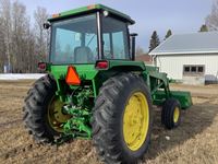 JD 148 loader, bucket, bale fork, grill guard, cab, heat, AC, radio, 16 speed Quad range transmission, dual rear hydraulic outlets, has rear hydraulic by pass so you don't have to unhook loader hoses to use rear remote, 11.00-16 front & 18.4 x 38 rear tires