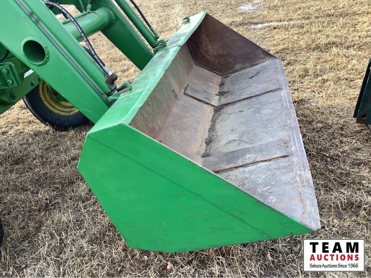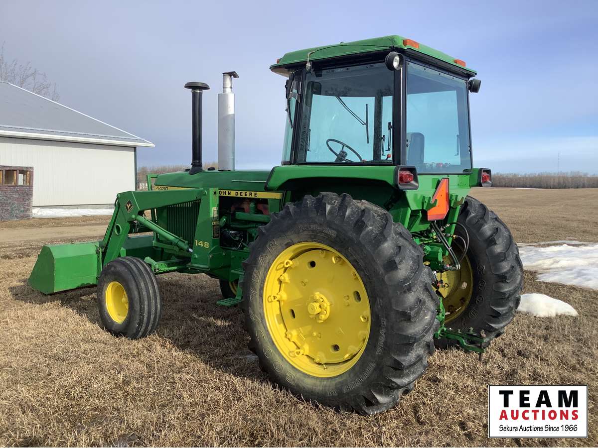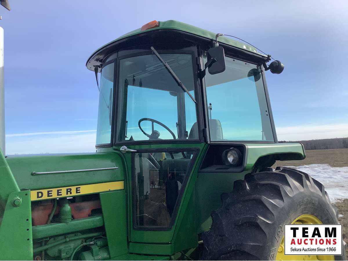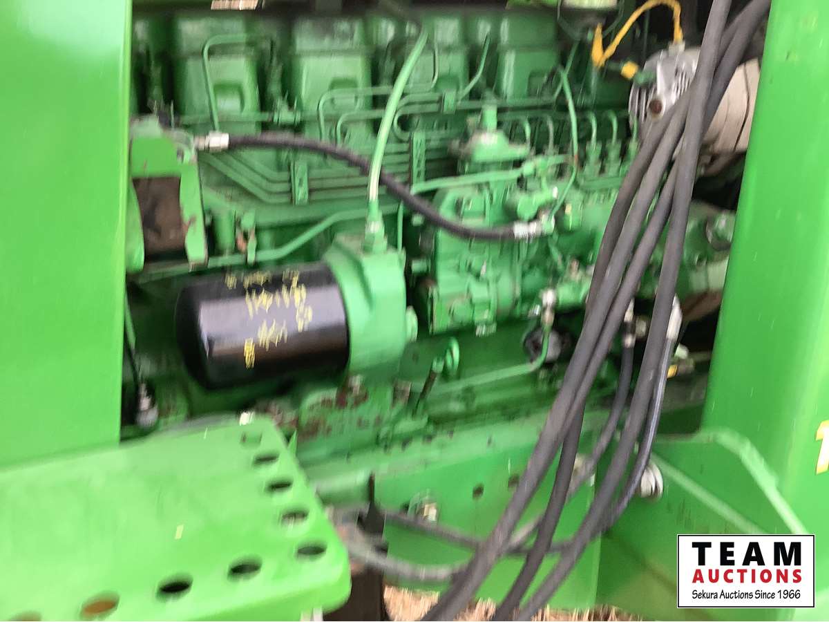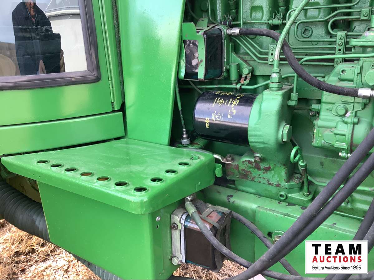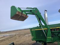 JD 148 loader, bucket, bale fork, grill guard, cab, heat, AC, radio, 16 speed Quad range transmission, dual rear hydraulic outlets, has rear hydraulic by pass so you don't have to unhook loader hoses to use rear remote, 11.00-16 front & 18.4 x 38 rear tires