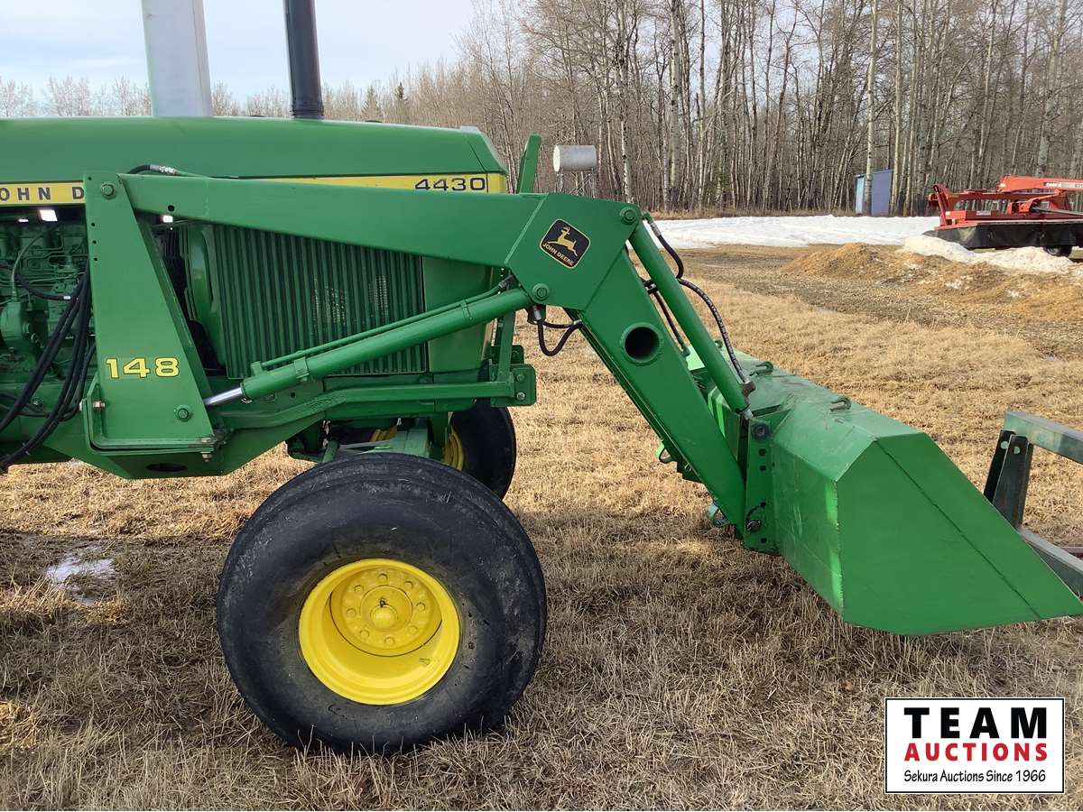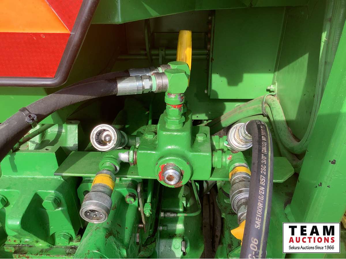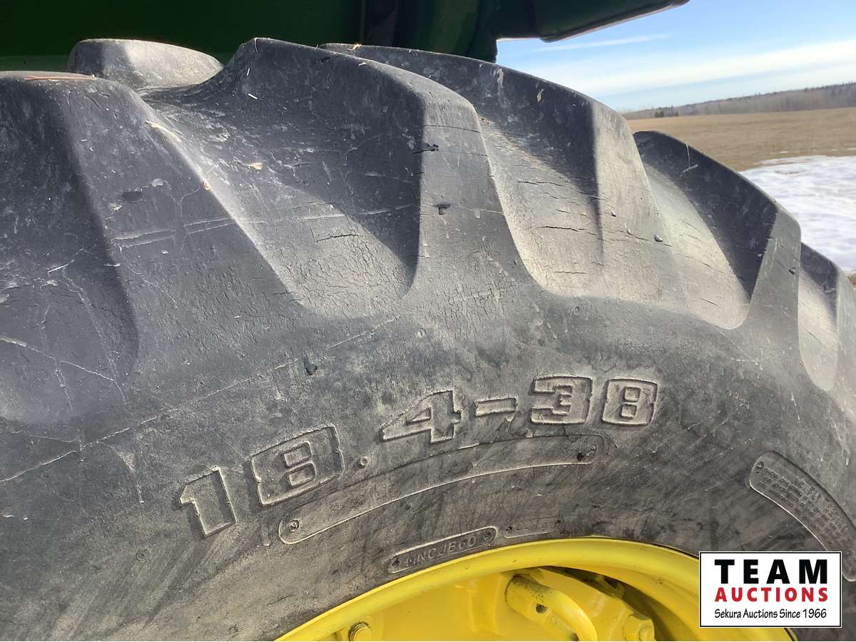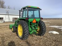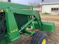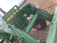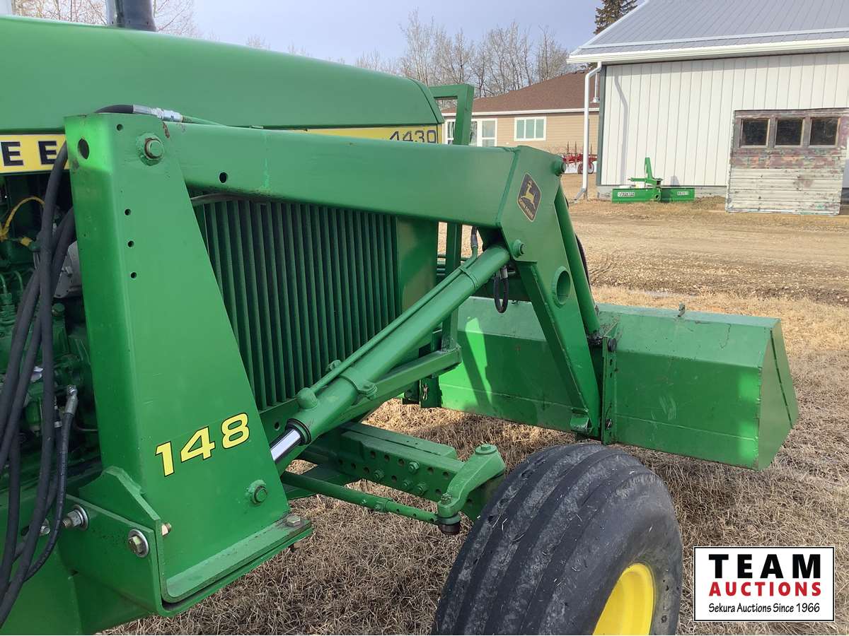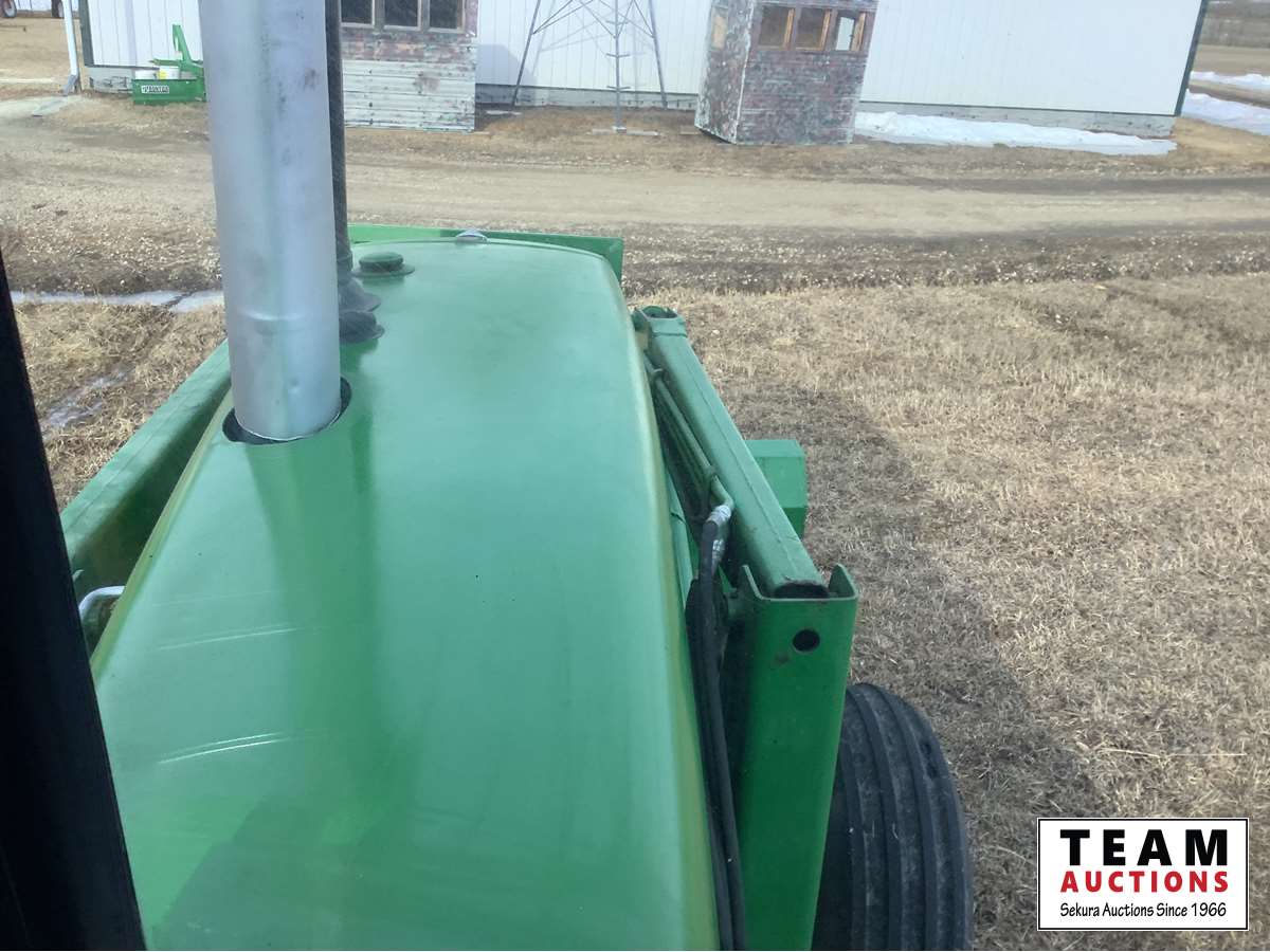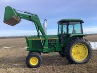 JD 148 loader, bucket, bale fork, grill guard, cab, heat, AC, radio, 16 speed Quad range transmission, dual rear hydraulic outlets, has rear hydraulic by pass so you don't have to unhook loader hoses to use rear remote, 11.00-16 front & 18.4 x 38 rear tires