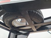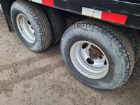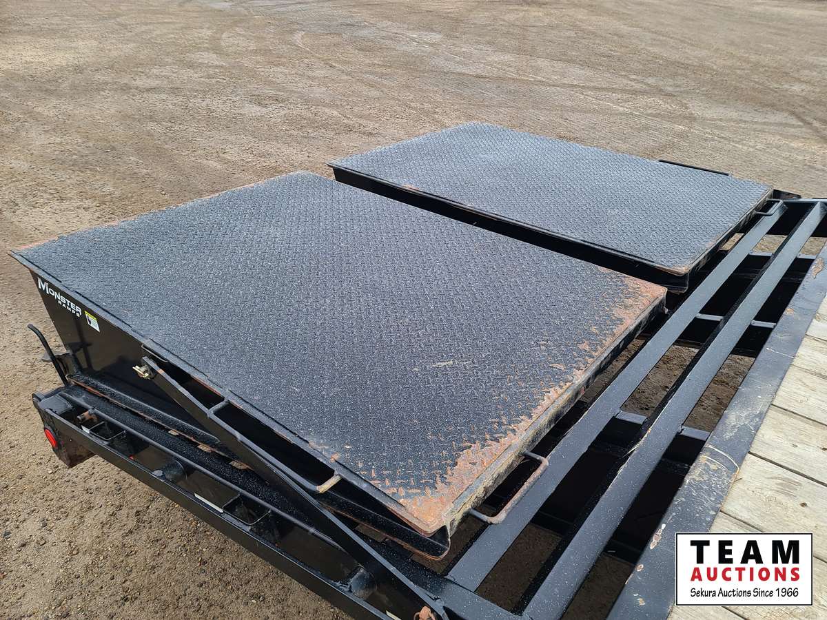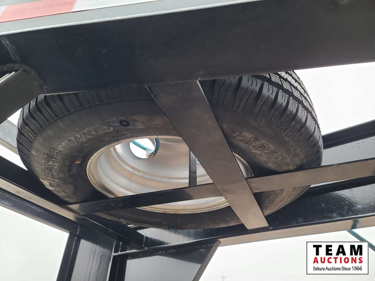 12,000 lb axles, monster rear ramps with 5 ft pop up center beavertail, stake pockets and rub rails, fir wood decking, tool box, 235/80R16 tires