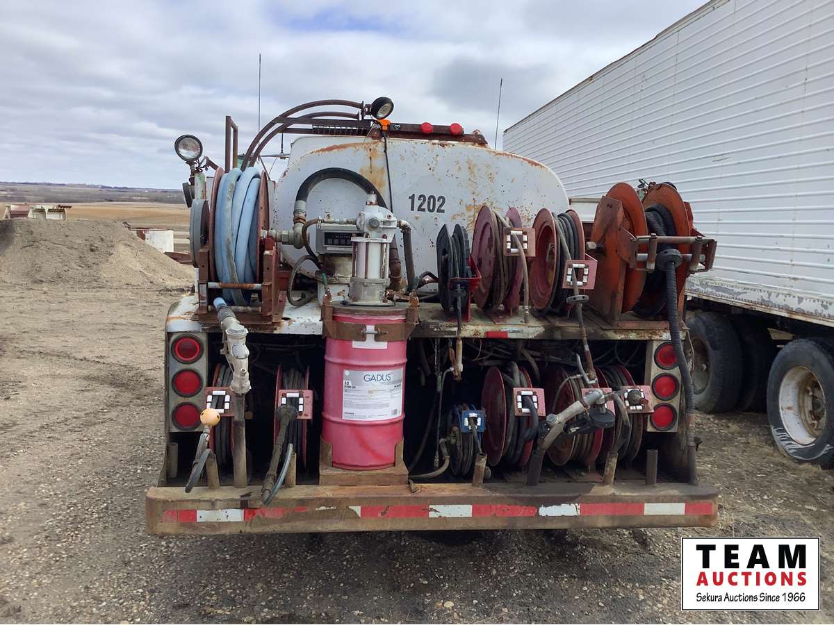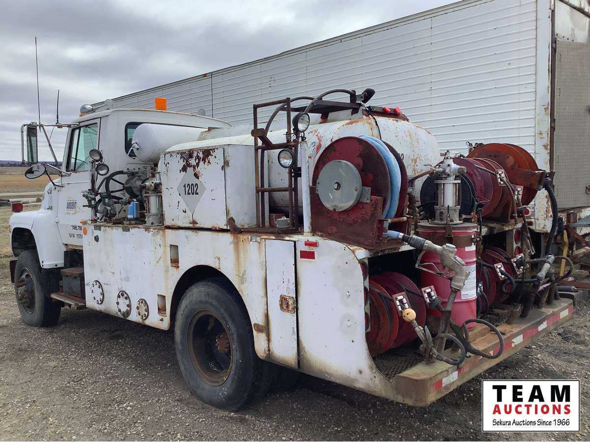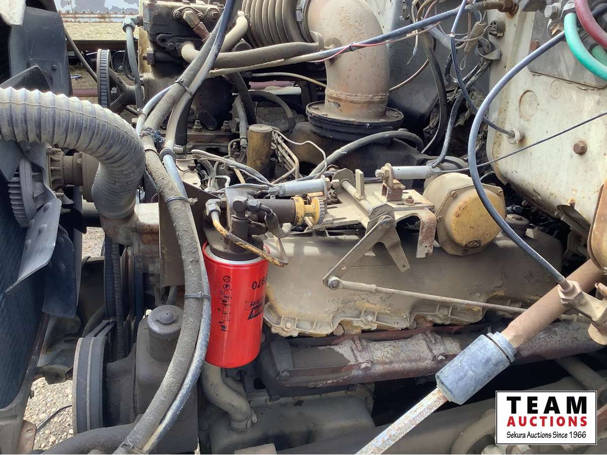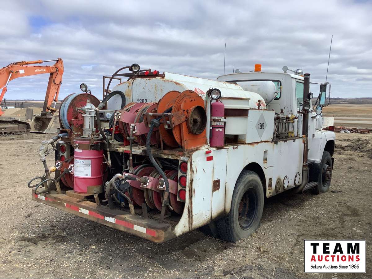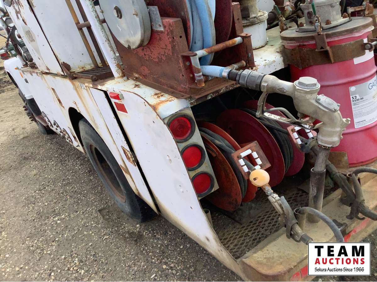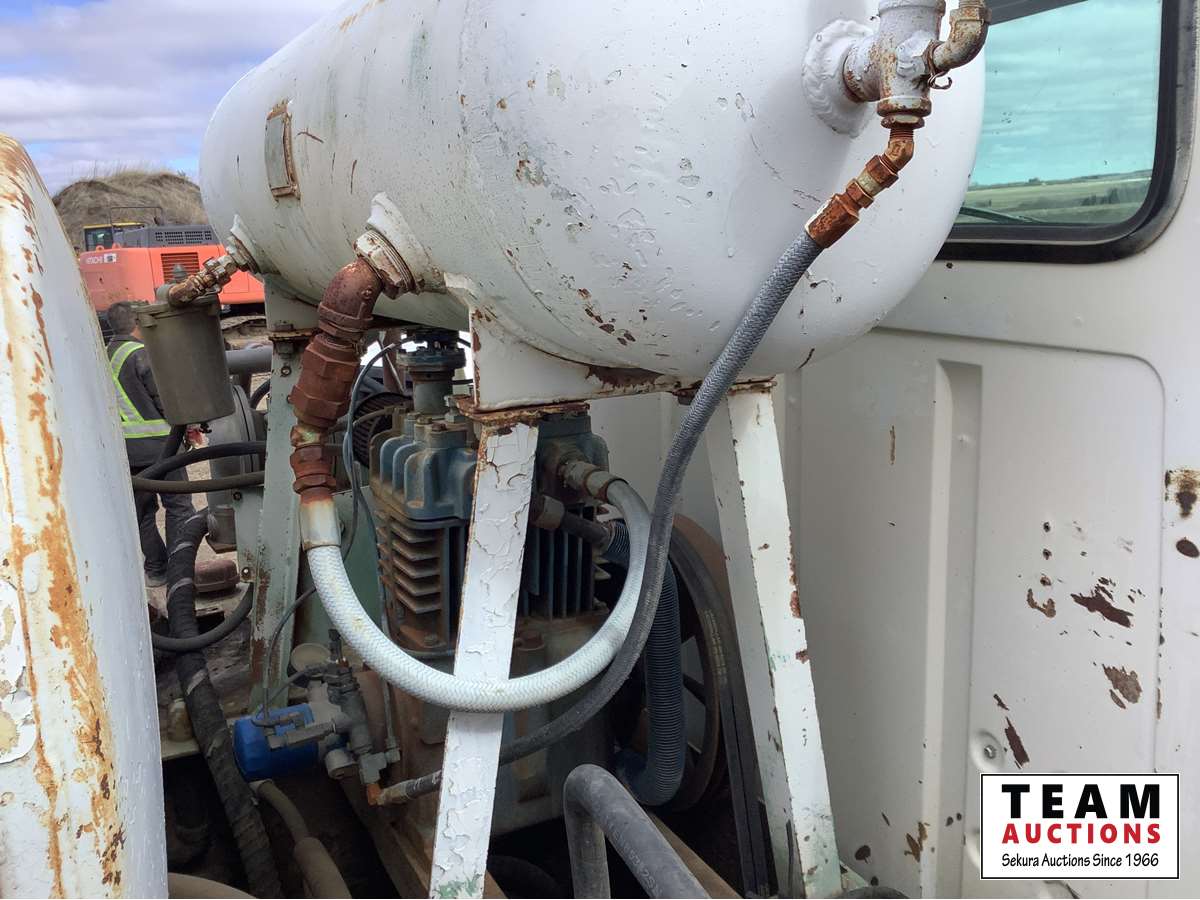 Caterpillar 3208, 10 speed transmission, air brakes, has a steel fuel storage tank with pump and hose real, has a rear mounted air greaser with one line hooked to the pump, PTO drive twin cylinder air compressor,air tank, 10x20