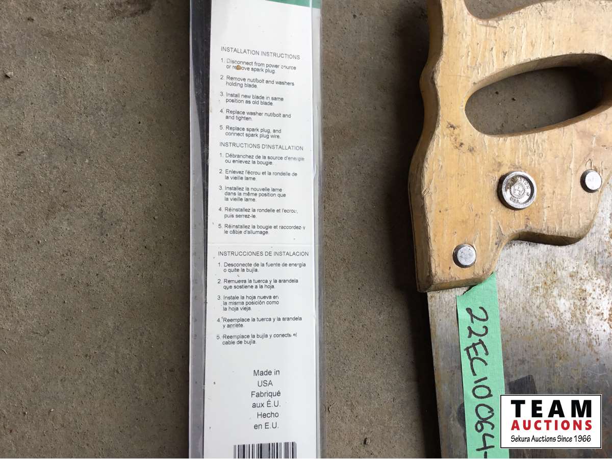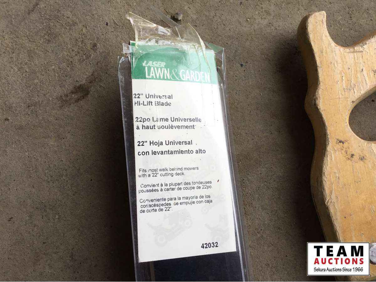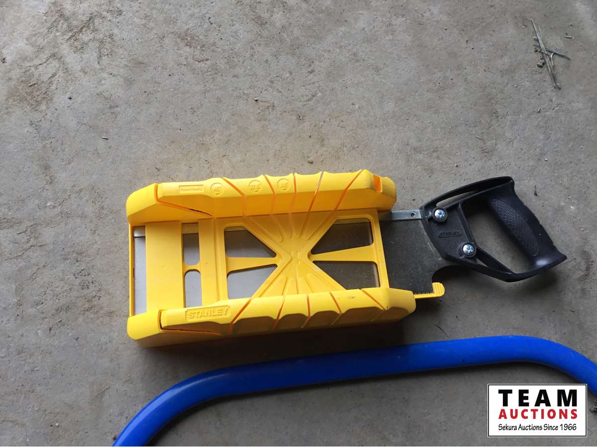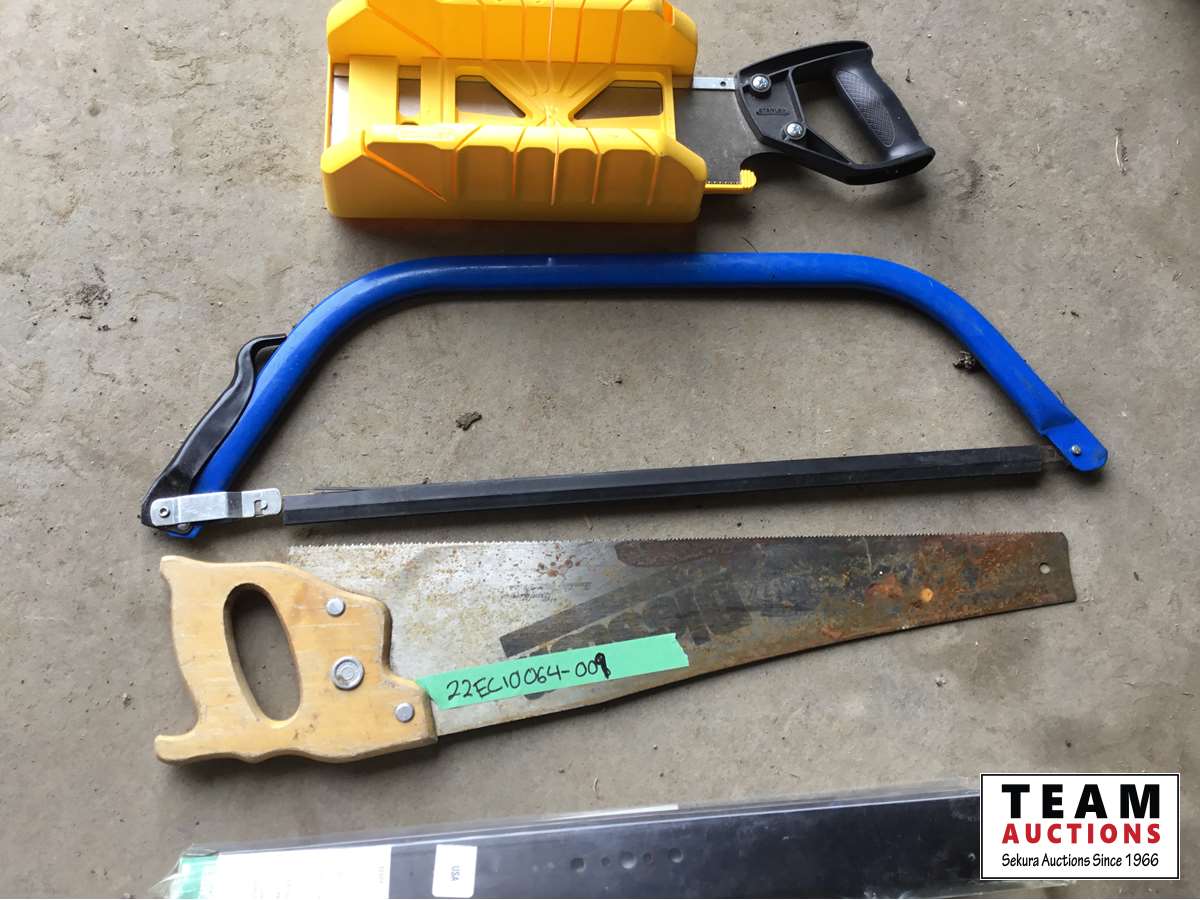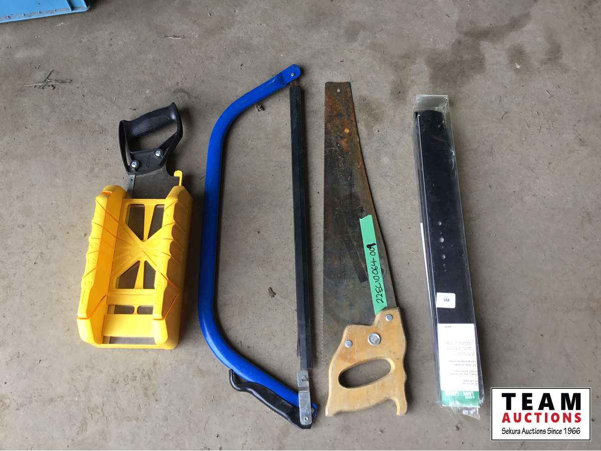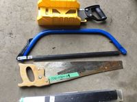 3043 (3) Saws, Mitre Box & 22 Inch Lawnmower Blade