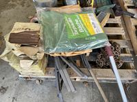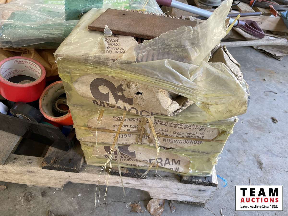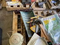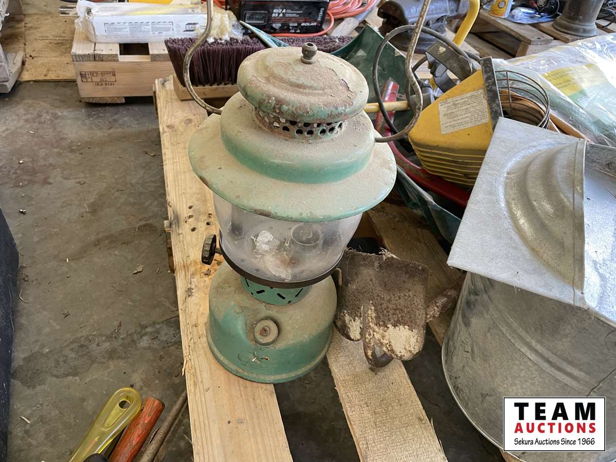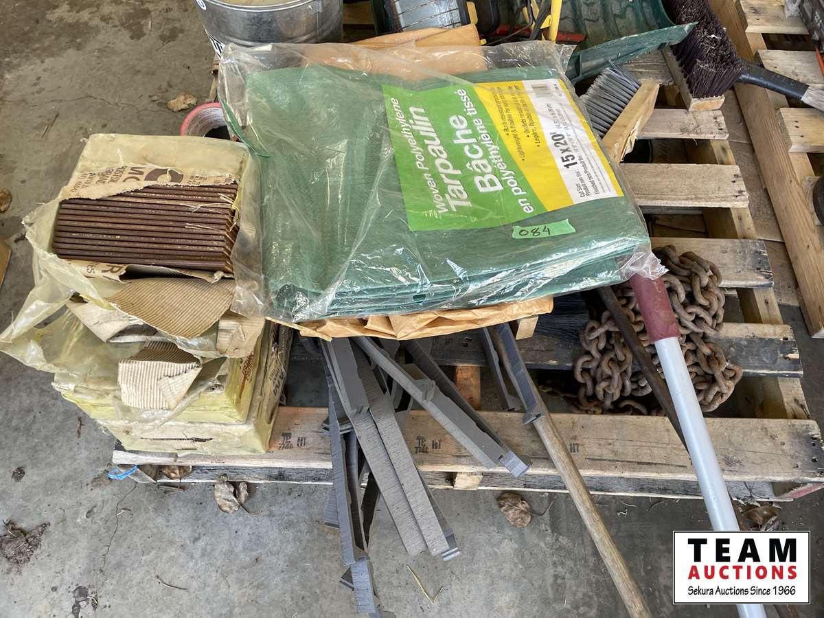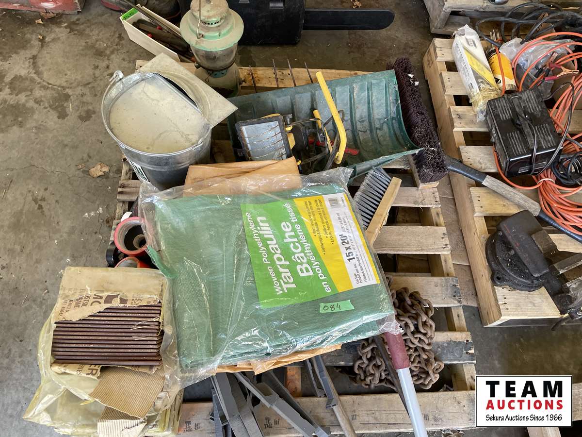 Kerosene lamp, ceramic tiles, broom heads, snow shovel, chain, bow saw, tarps, flood light, various tapes