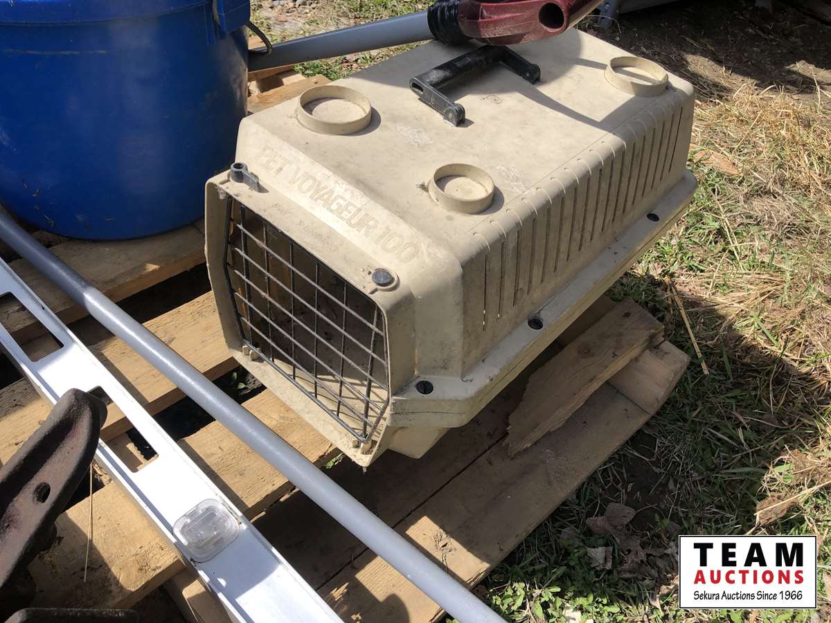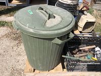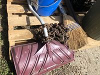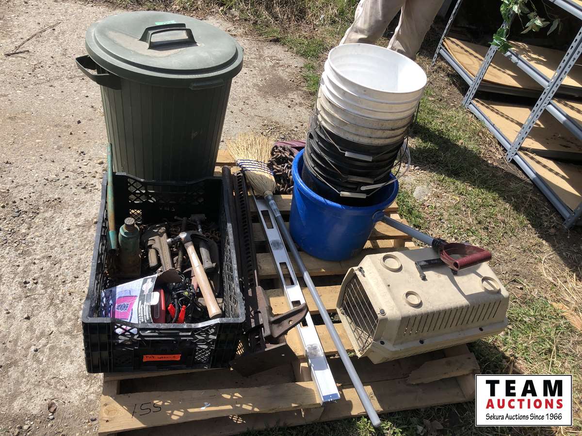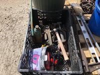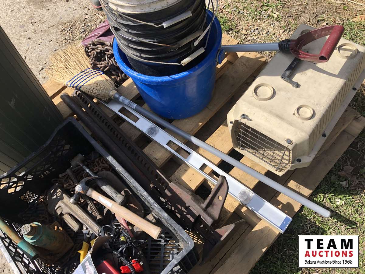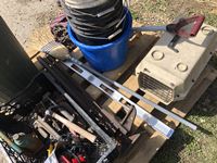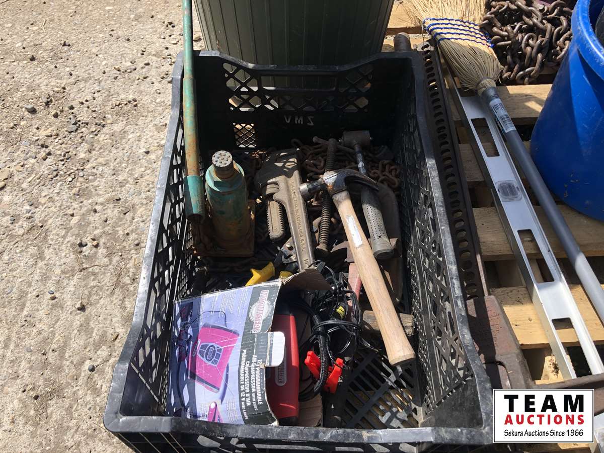 Garbage can, snow shovel, buckets, jack all, portable air compressor, pipe wrench, assorted hand tools, bottle jack, miscellaneous