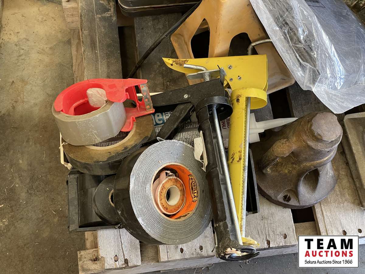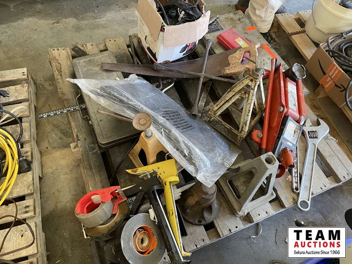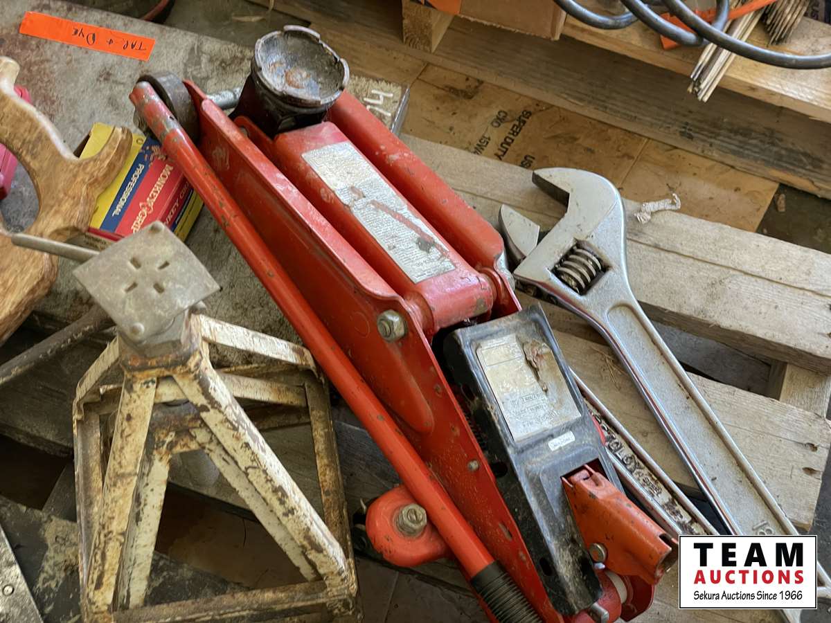Tap & die set, 2 ton floor jack, Red Lion sump pump, caulking guns, 18 inch adjustable wrench, tarp, grease gun, fencing stretcher, Gorilla tape, tire repair kit, hand saw, miscellaneous