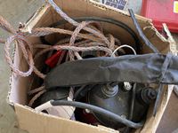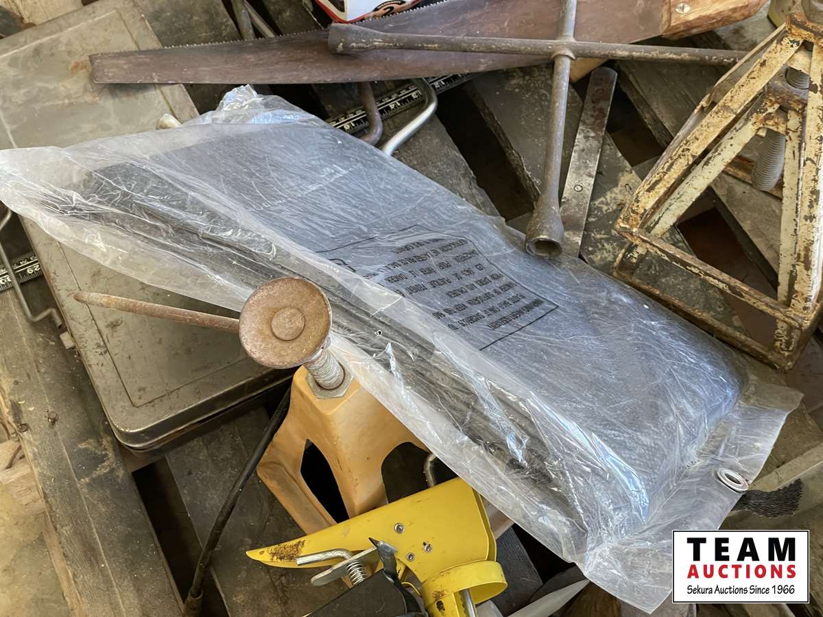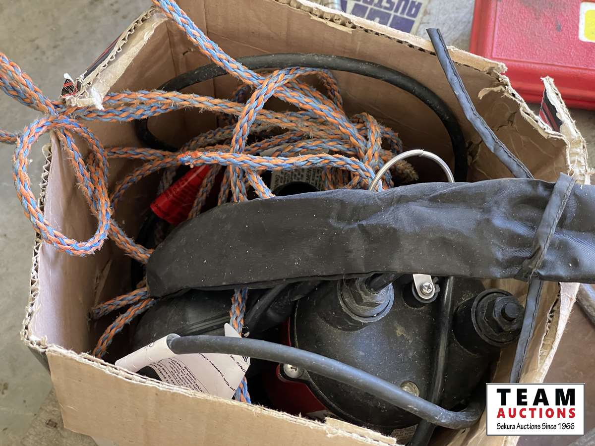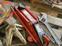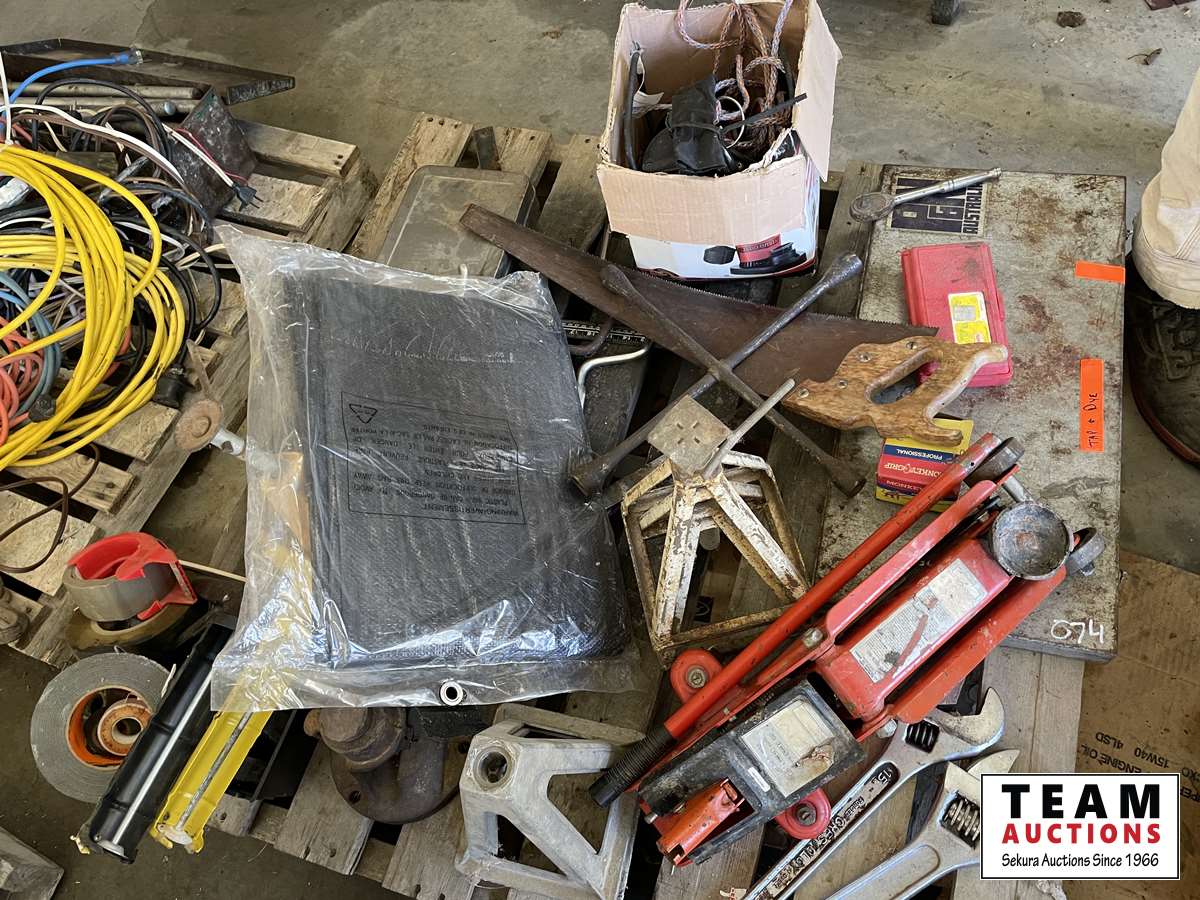 Tap & die set, 2 ton floor jack, Red Lion sump pump, caulking guns, 18 inch adjustable wrench, tarp, grease gun, fencing stretcher, Gorilla tape, tire repair kit, hand saw, miscellaneous