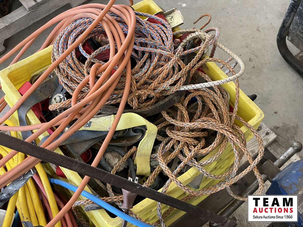 Extension cords, box of rope ratchets, post mall with no handle, 5 inch vise, 3/4 sockets & ratchet, miscellaneous