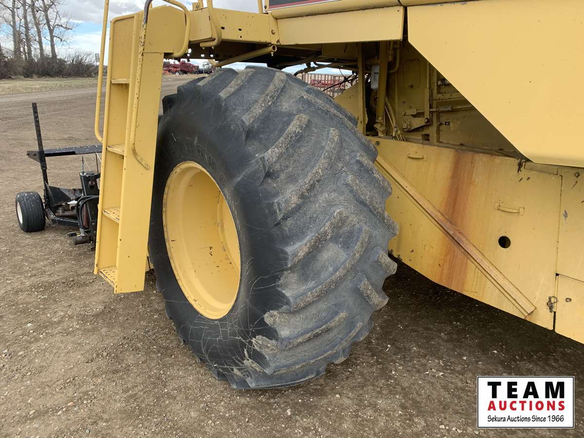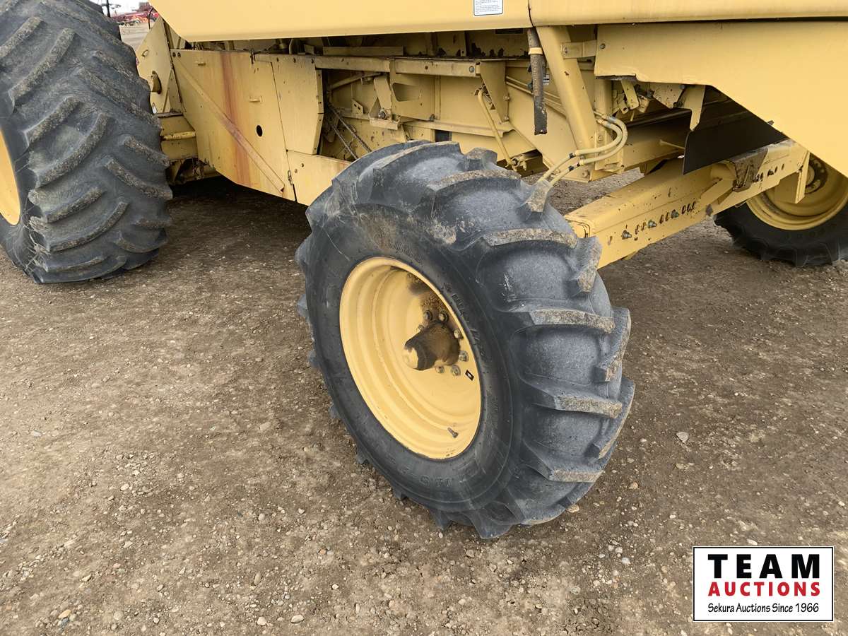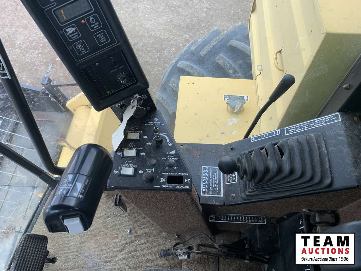 13 ft 971 pickup header, rocktrap, reverser, variable speed reel, fore & aft, reverser, fine cut chopper, chaff spreader, 30.5 L -32 front, 14.9-24 rear