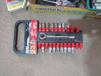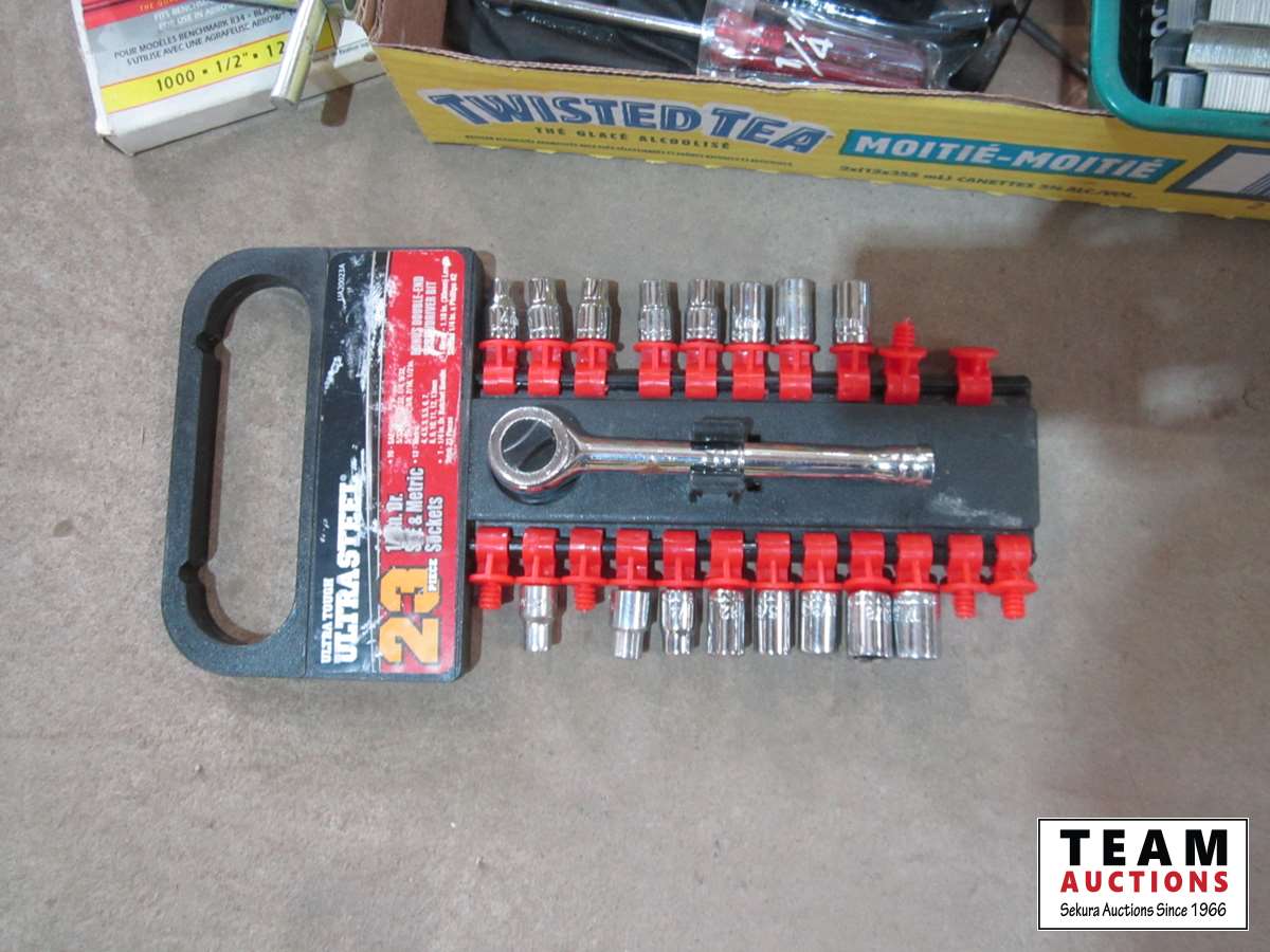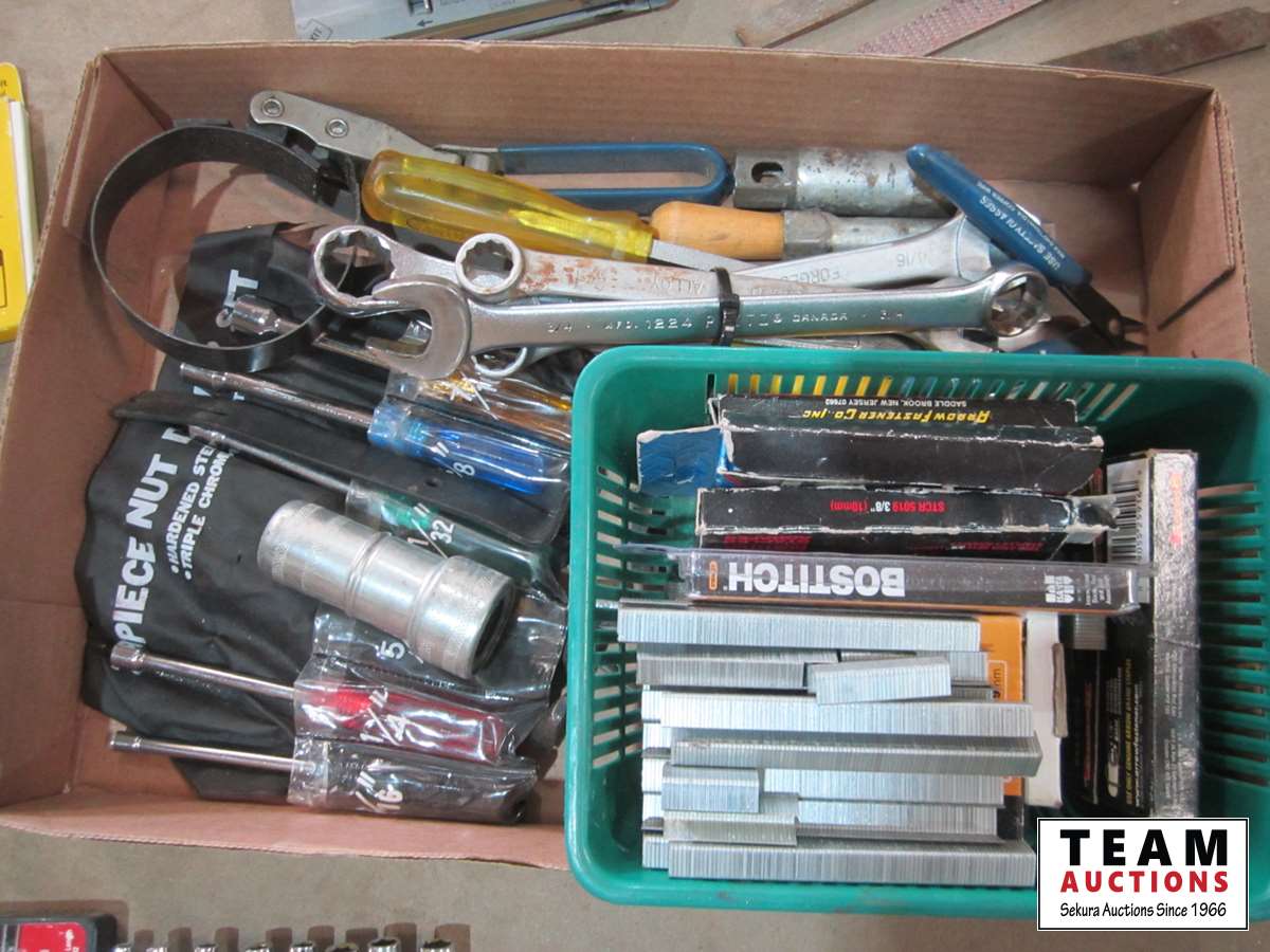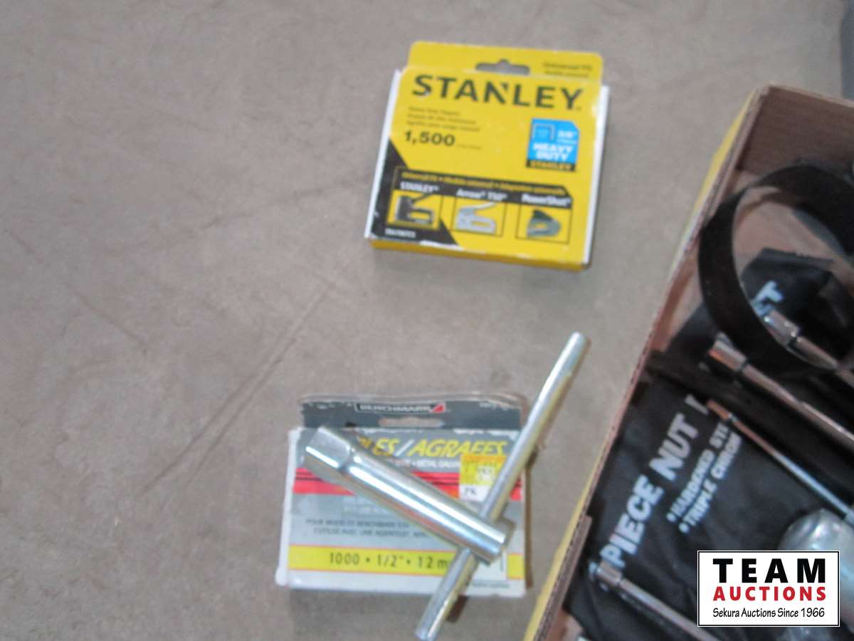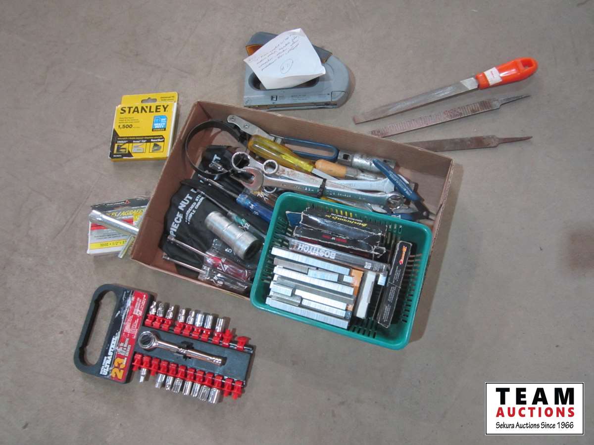 staples, small socket set, stapler, oil filte, wrench files, etc.