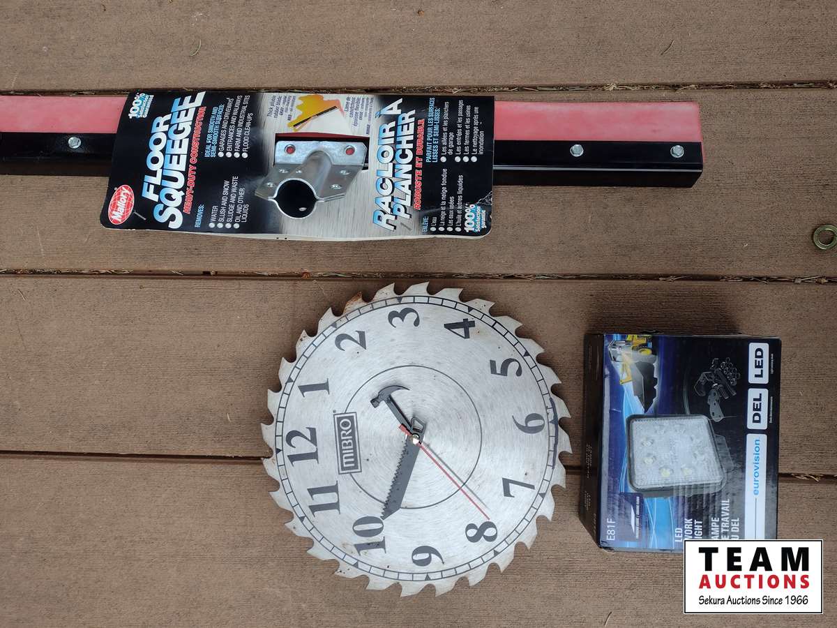 1894 LED 12V Light, Floor Squeegee, Saw Blade Wall Clock