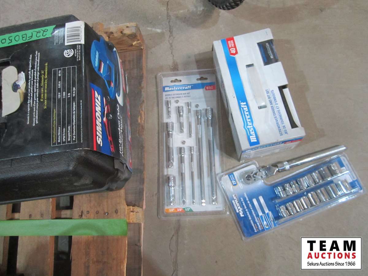 Socket set, extension cords, screw driver set, Simoniz 10 inch buffer