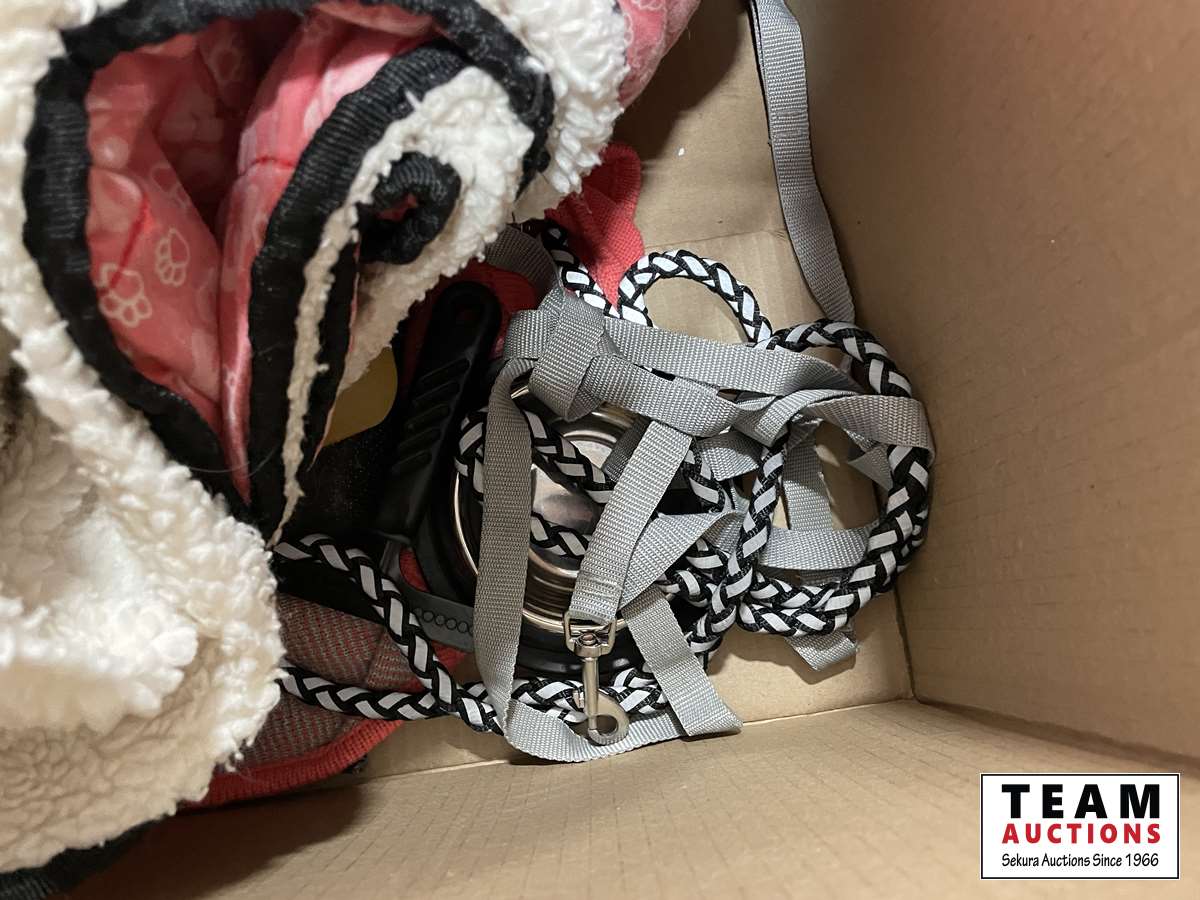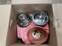 Dishes, leash, blankets