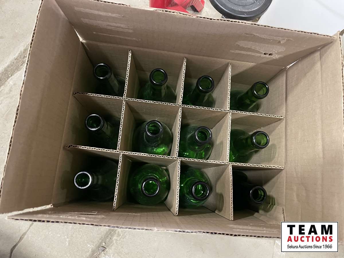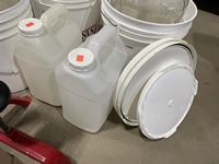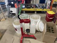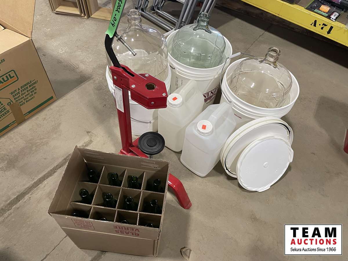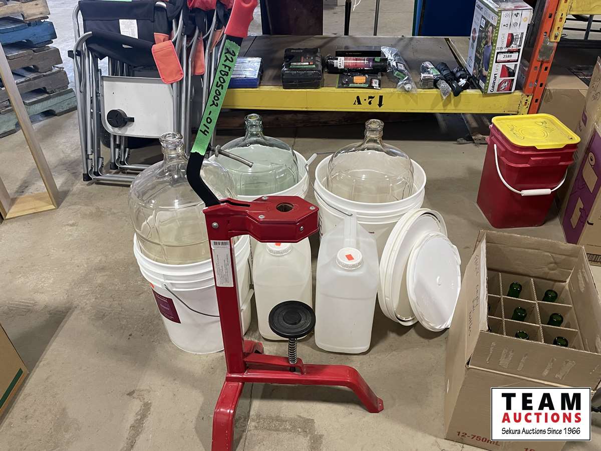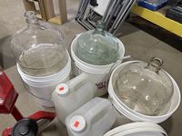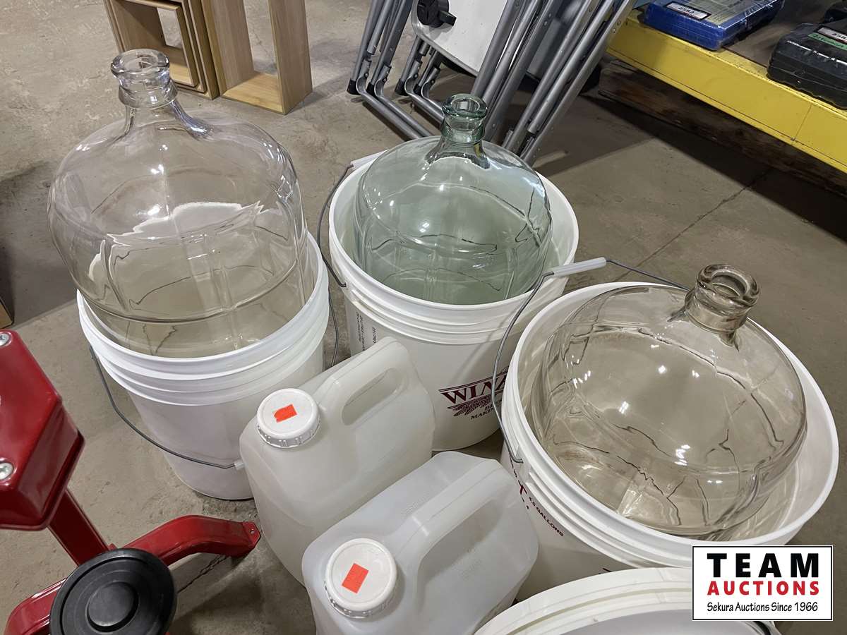 (3) buckets, glass jugs, wine bottle corker, wine bottles
