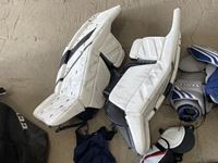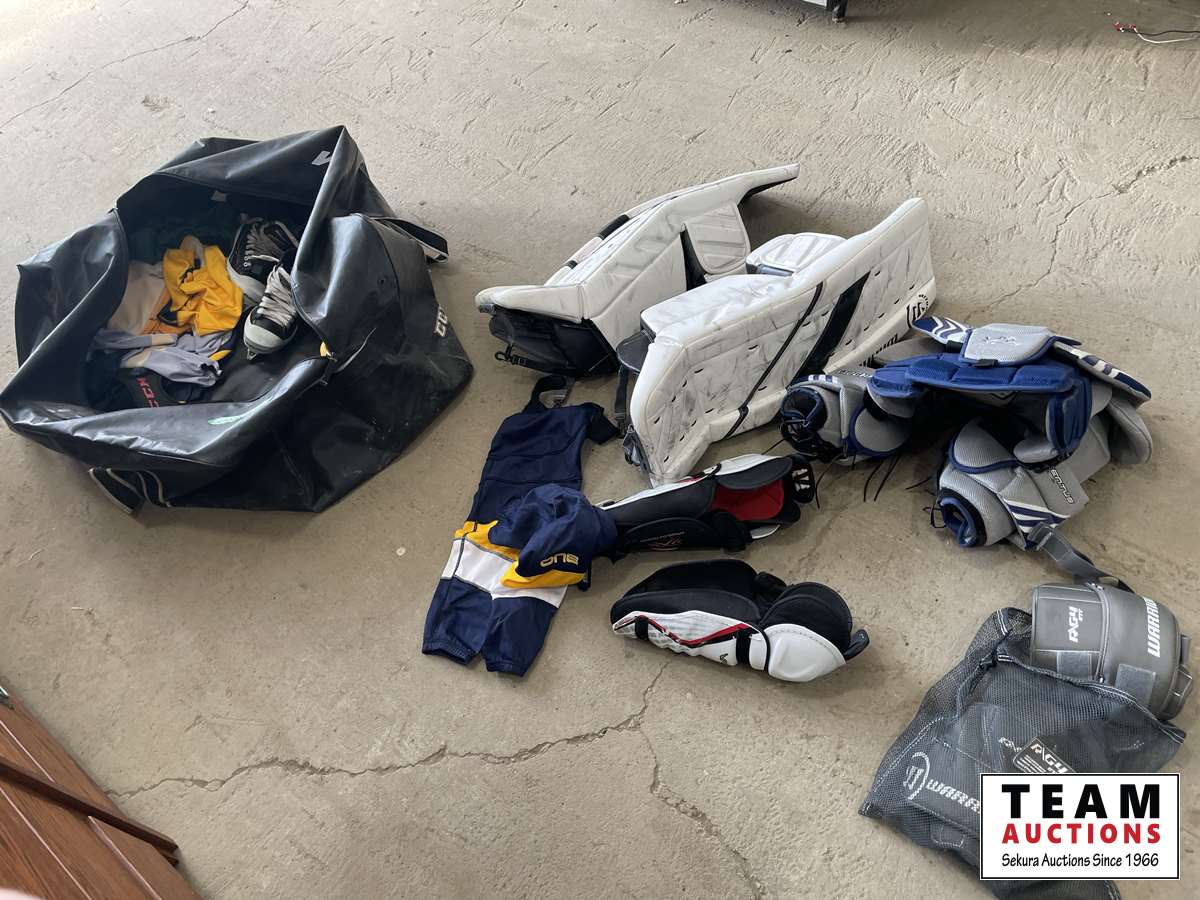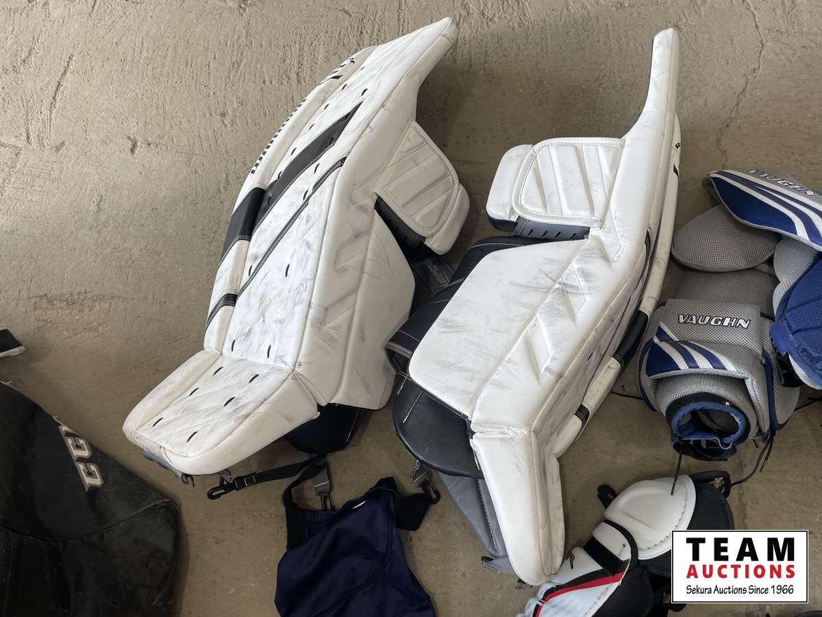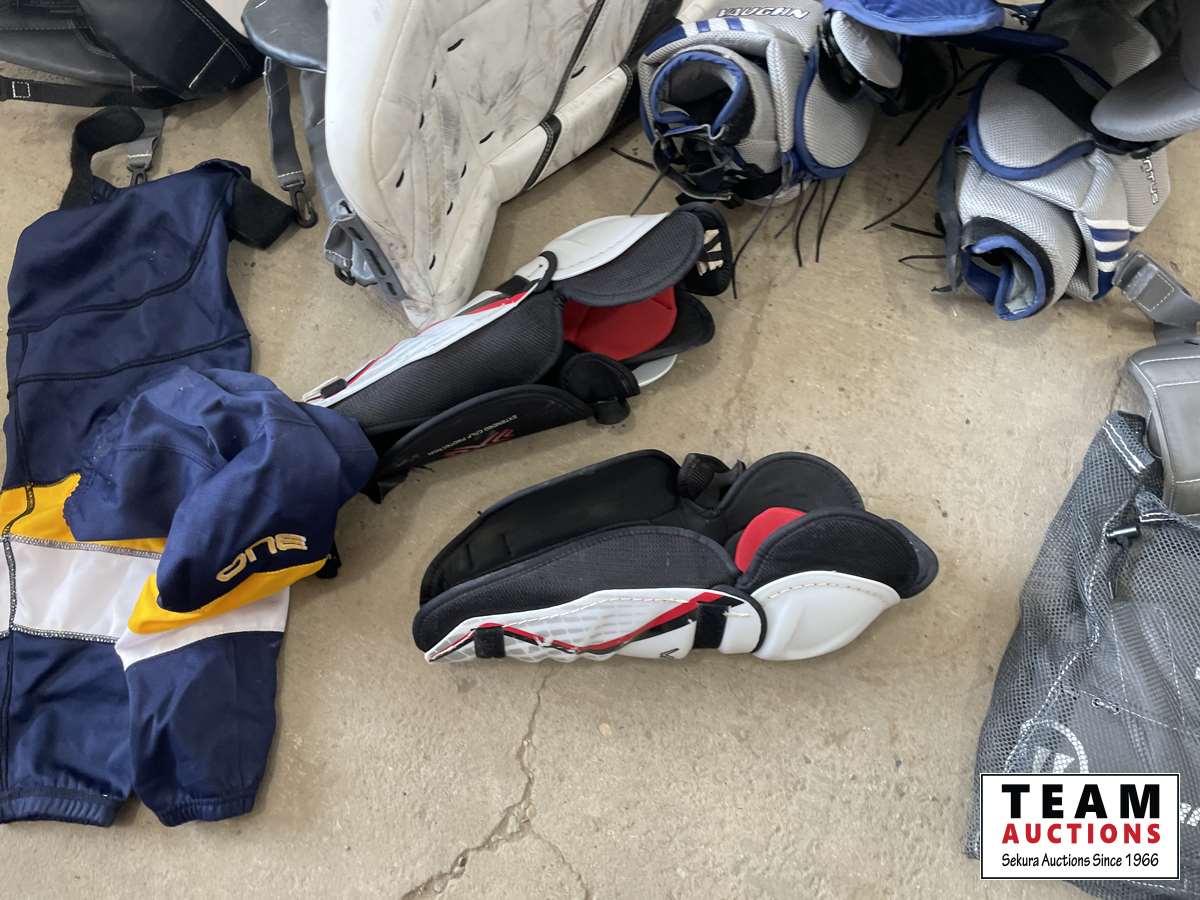 Goalie pads, chest protector, gloves, shin pads, assorted jerseys