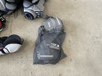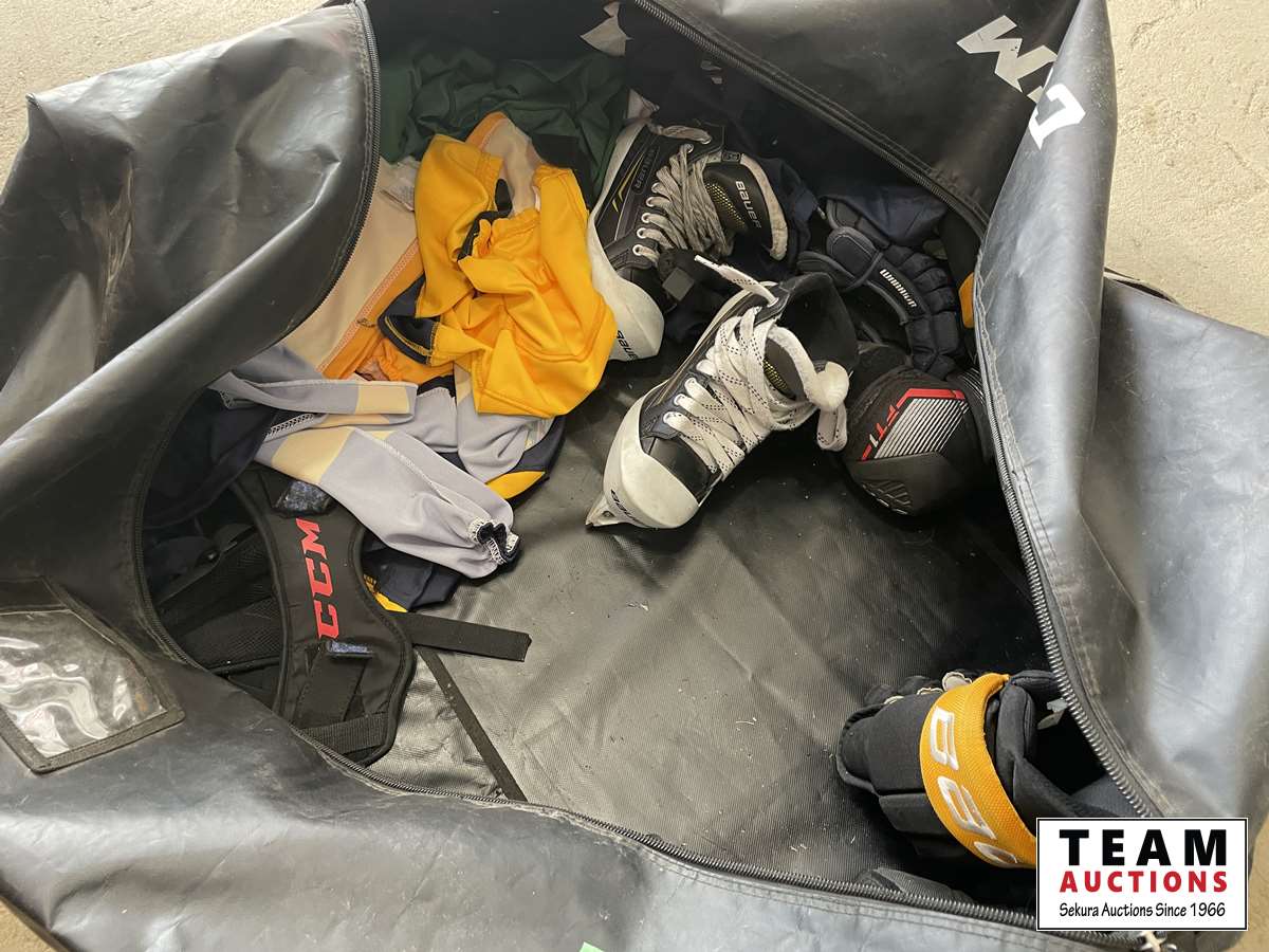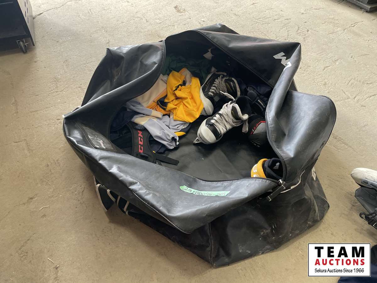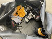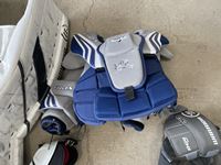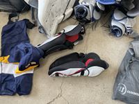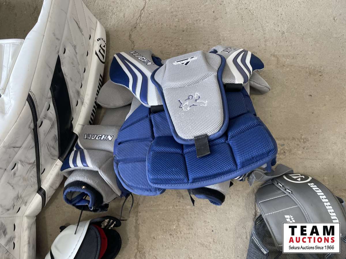 Goalie pads, chest protector, gloves, shin pads, assorted jerseys
