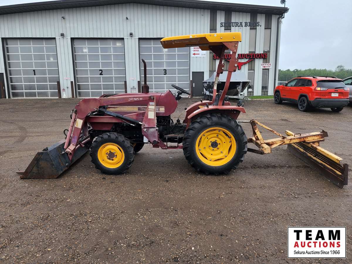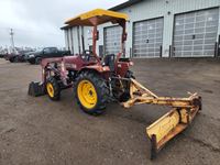 loader W/ 65 inch bucket, 4 speed transmission, 540 PTO, 3 PT Hitch, 7 ft rear blade, ROPS W/ canopy, 11.2-24 rear tires, 6.50-15 front tires