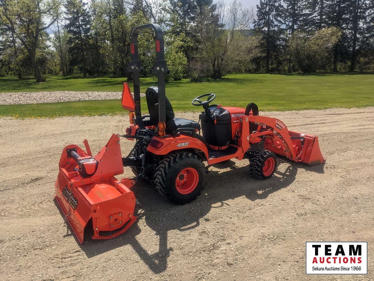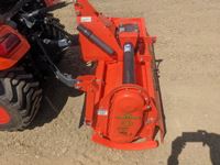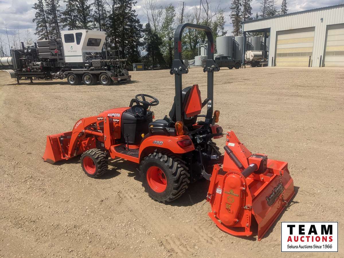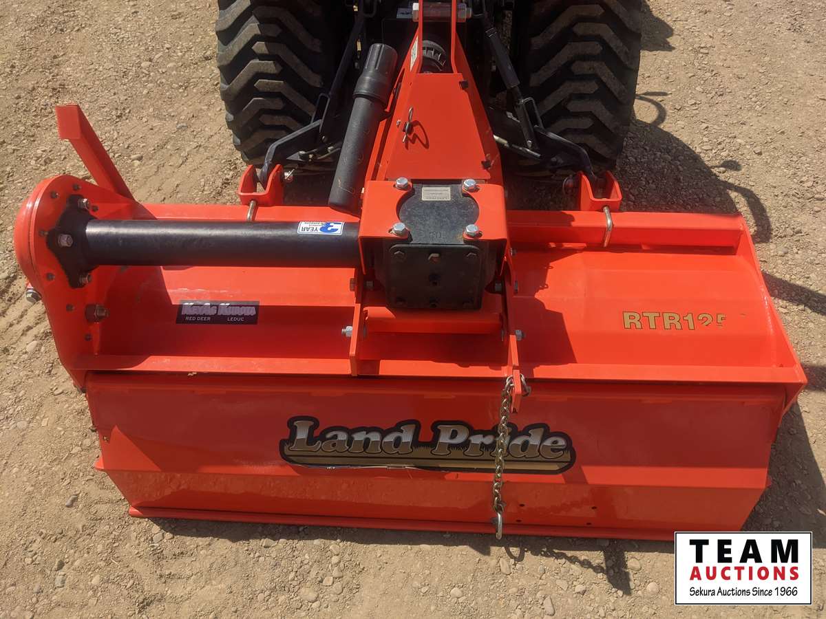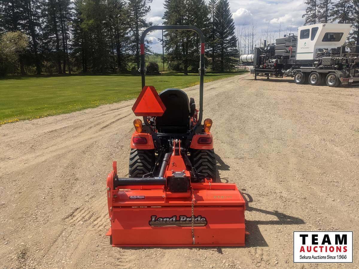 Kubota LA344 loader, 48 inch bucket, Q/A coupler, ROPS, 540 PTO, 3 PT, diff lock, Land Pride RTR125 rotary tiller, s/n 1211088
