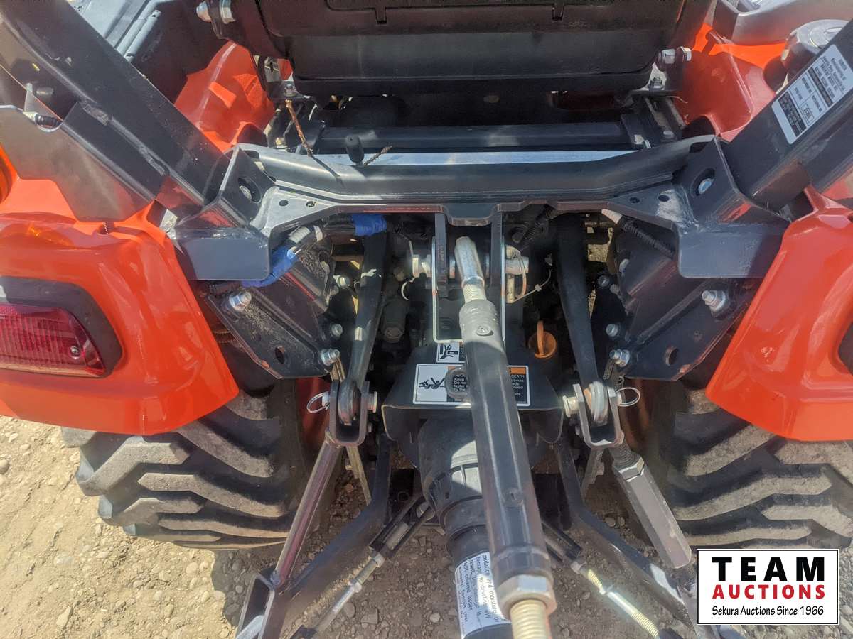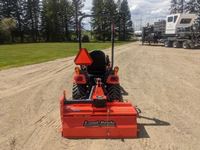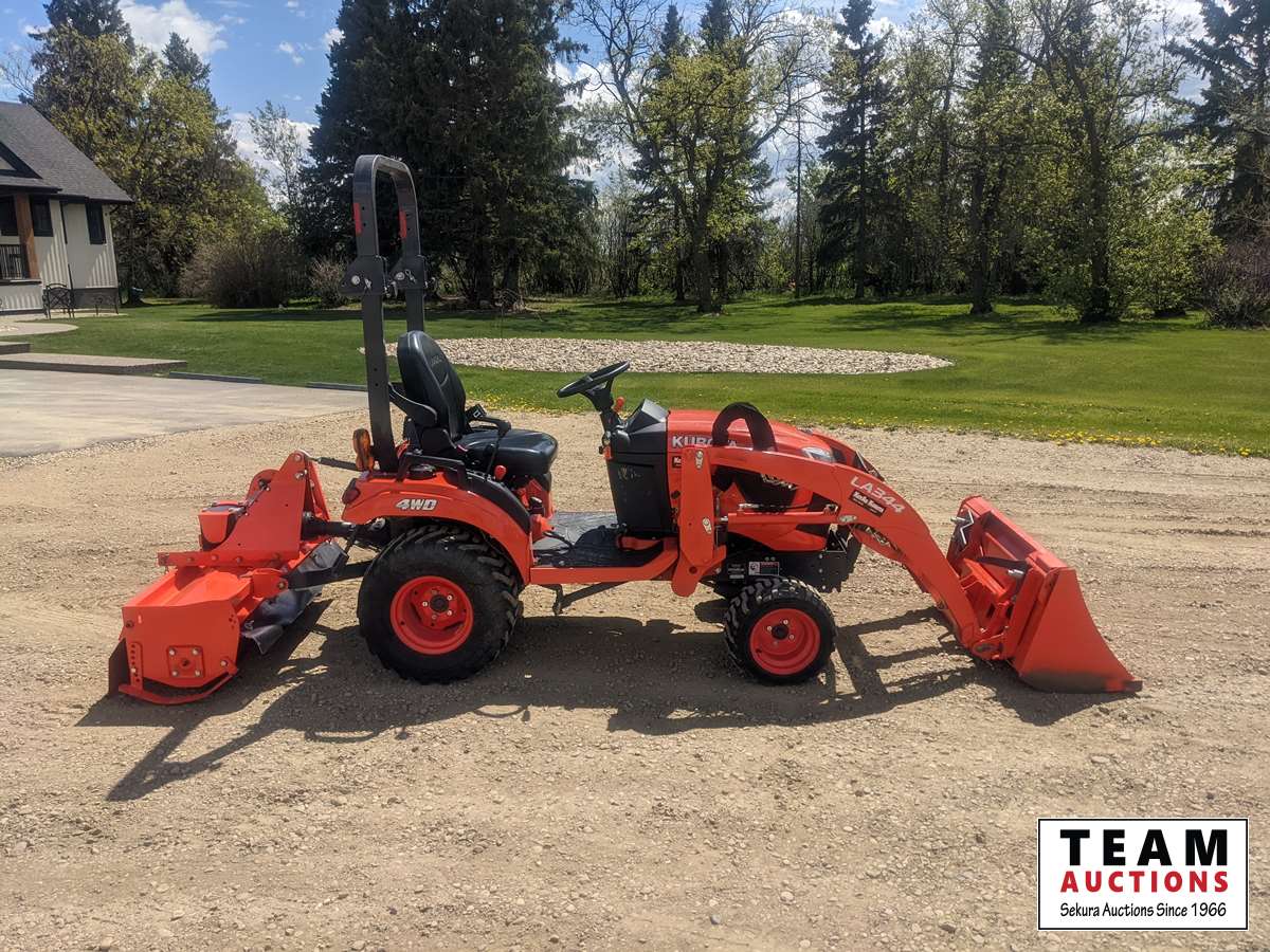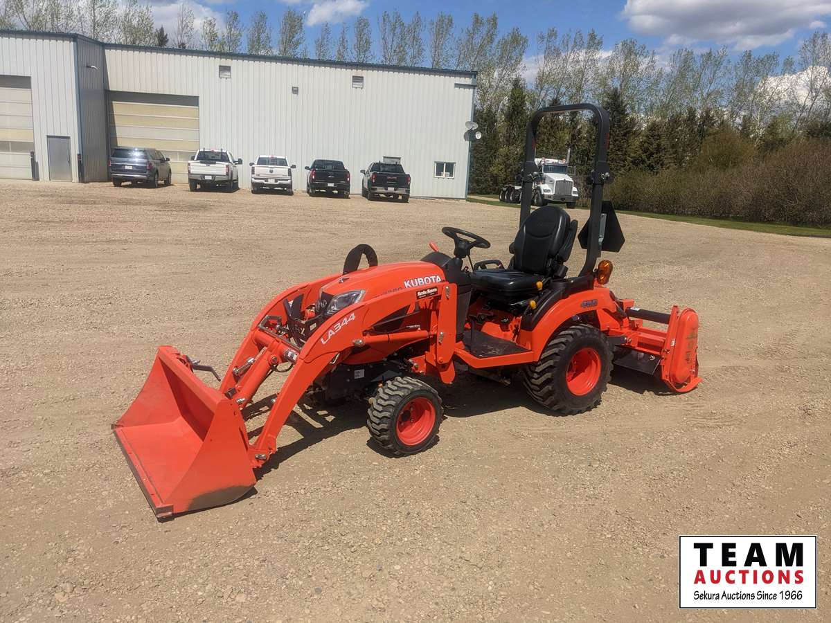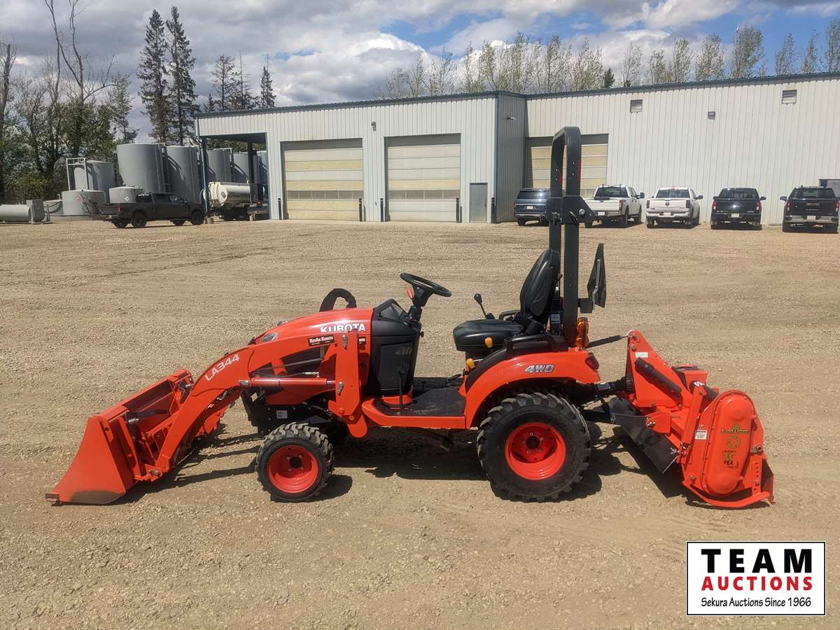 Kubota LA344 loader, 48 inch bucket, Q/A coupler, ROPS, 540 PTO, 3 PT, diff lock, Land Pride RTR125 rotary tiller, s/n 1211088