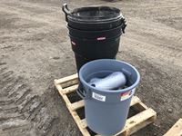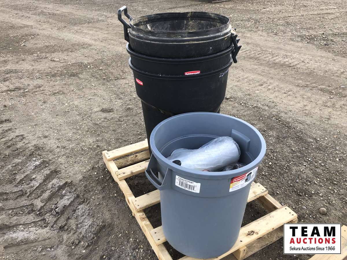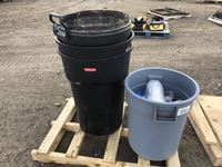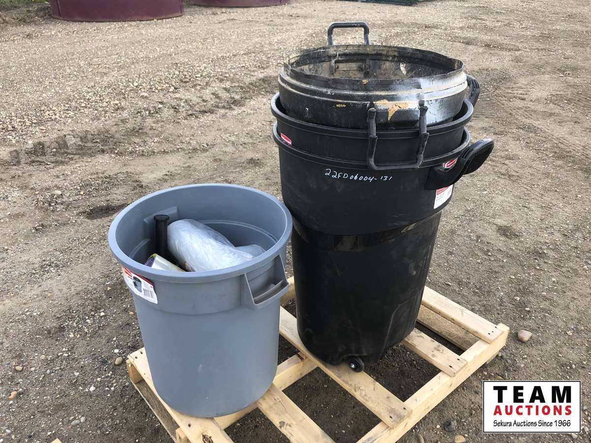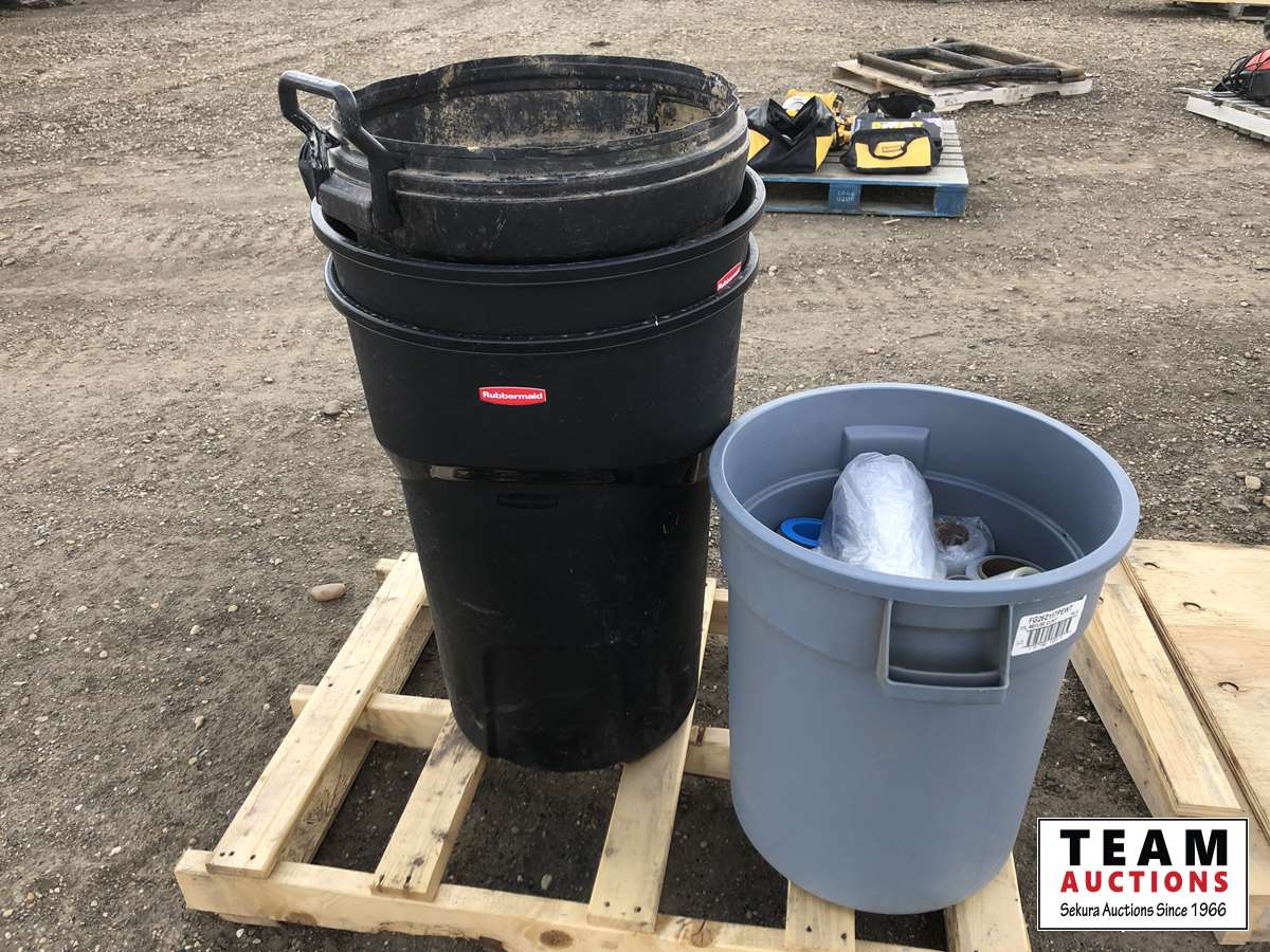 (4) garbage cans, tape, shrink wrap, hinges, roller