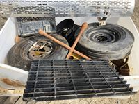 (2) 560 x 14 - 12 tires, muffler cover, iron fittings