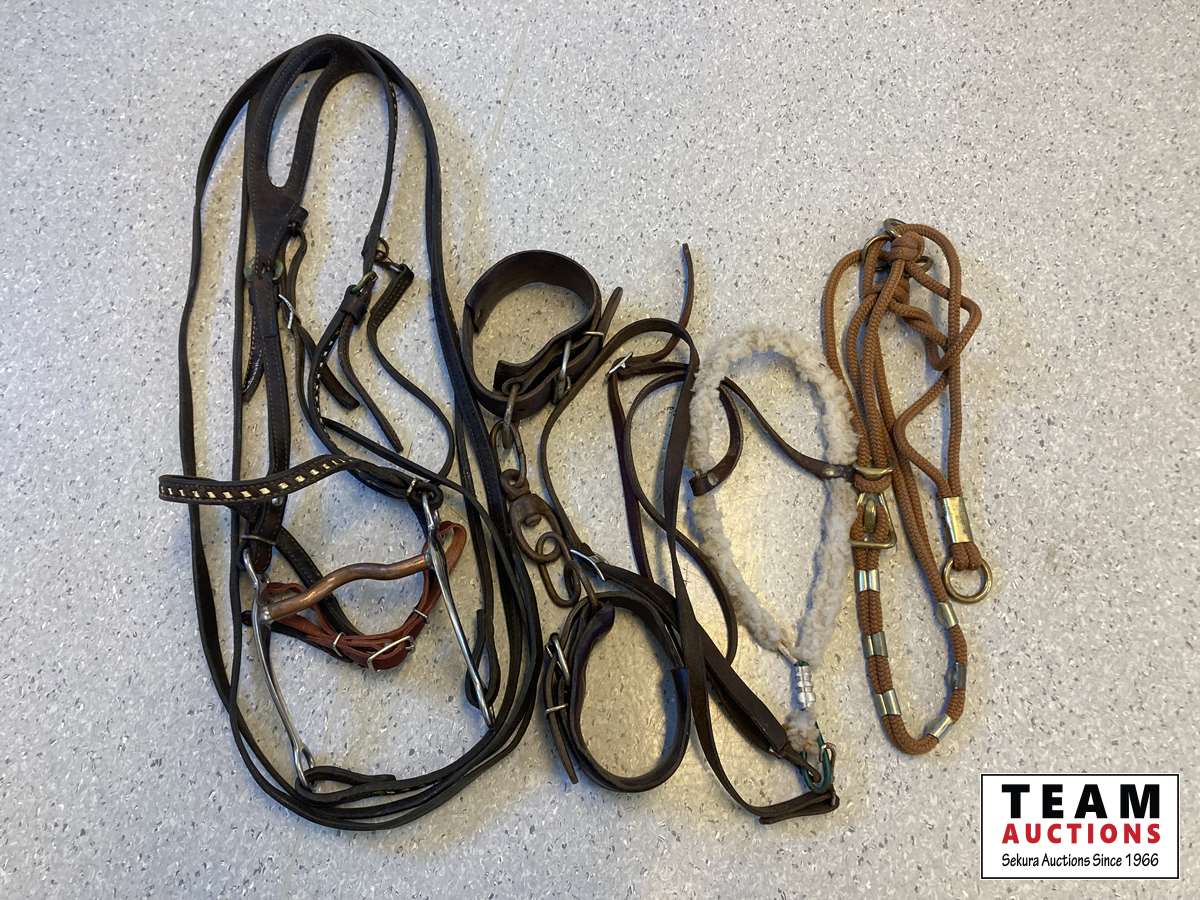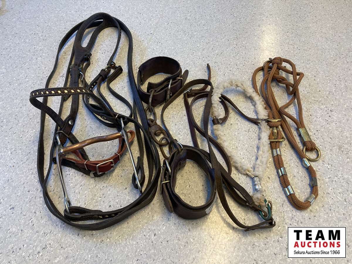 Leather bridle, hobbles, training halter, tie down