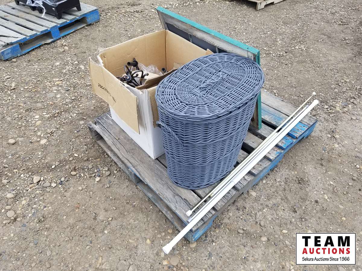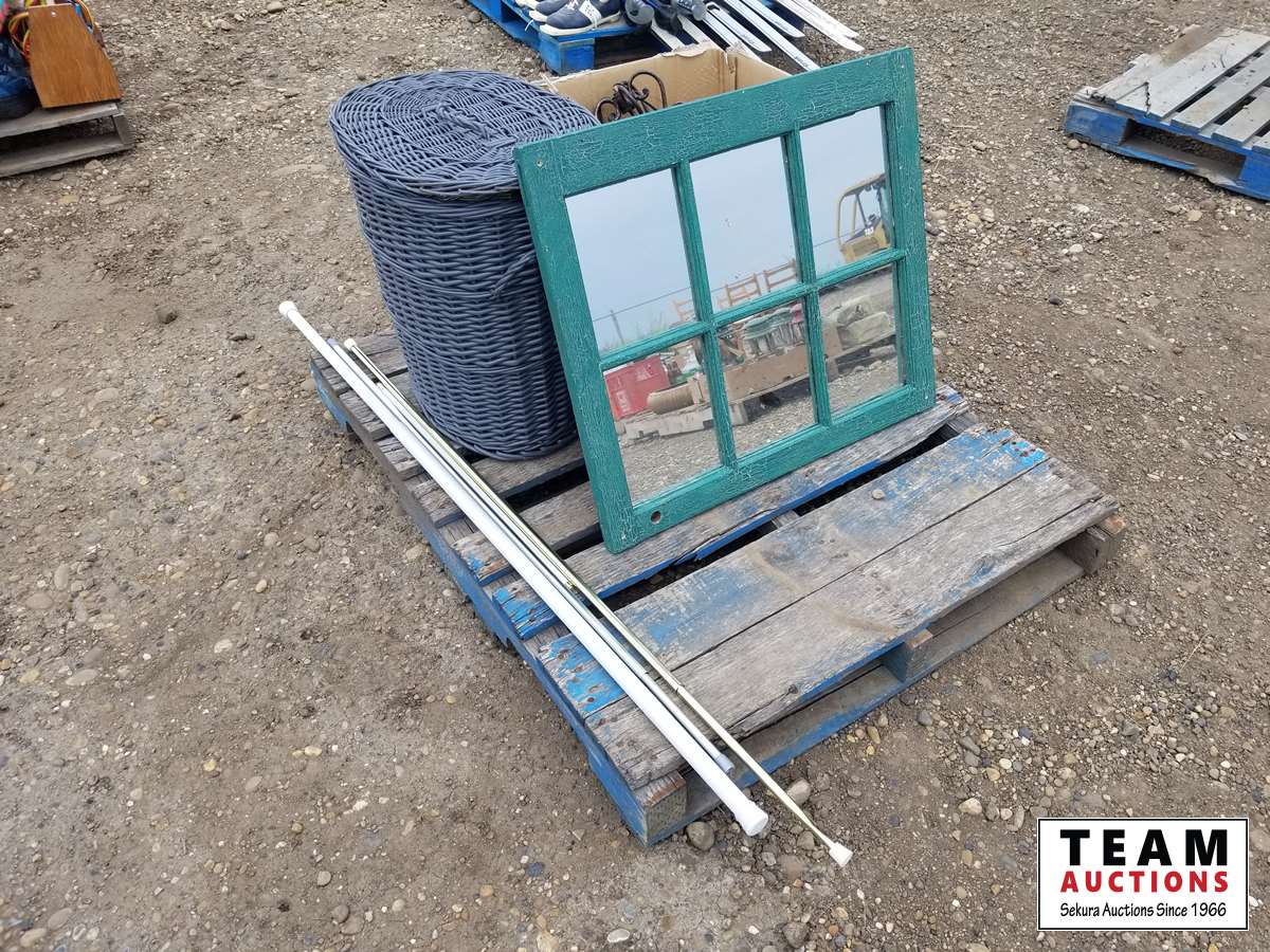 Mirror, hanging light, laundry basket